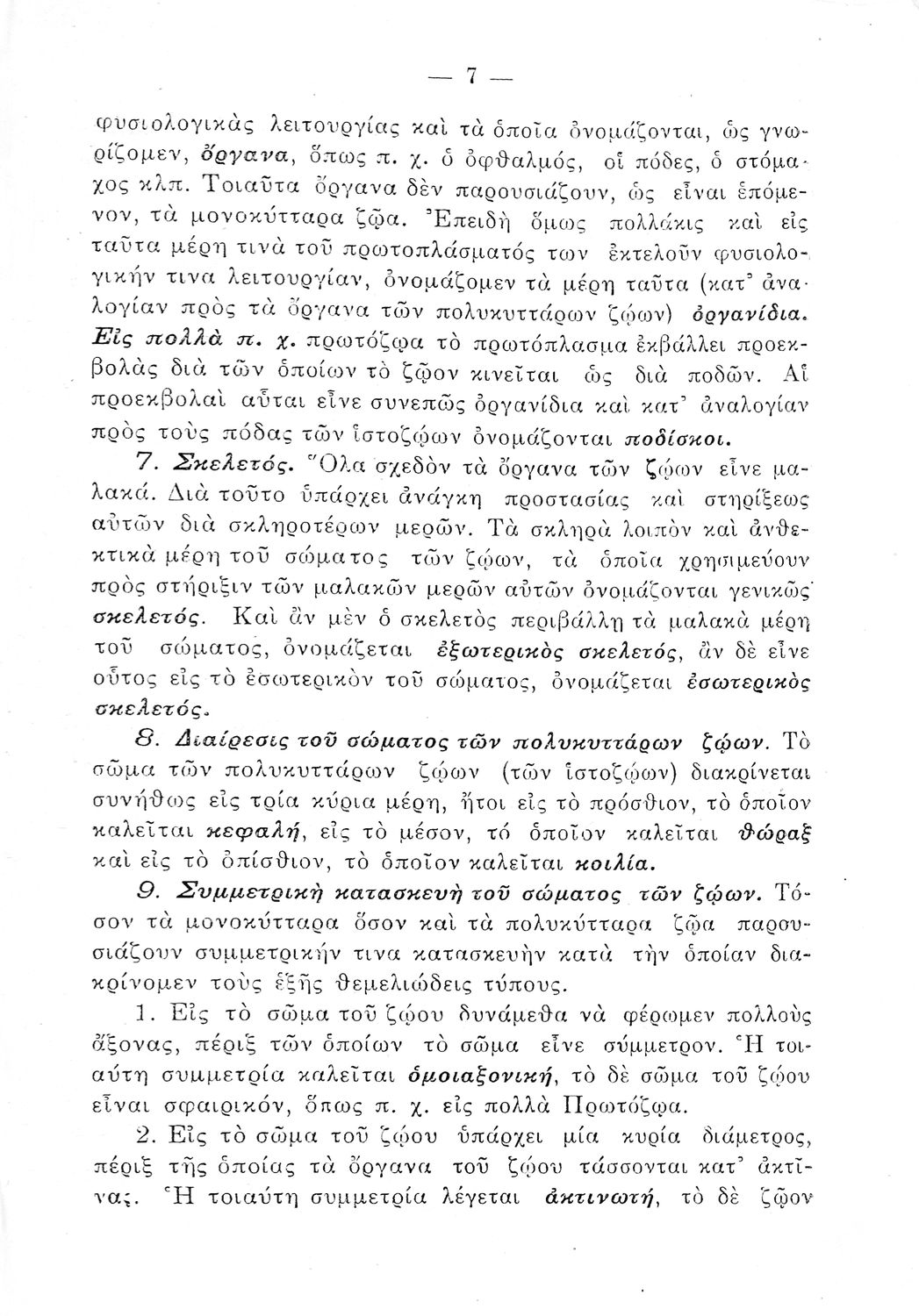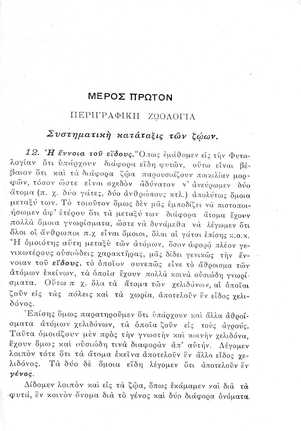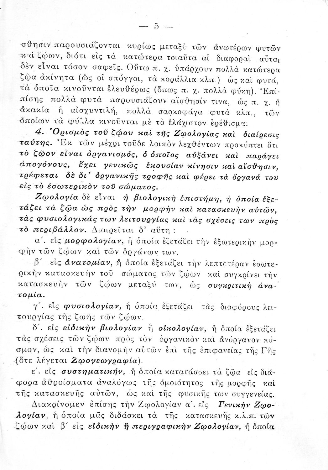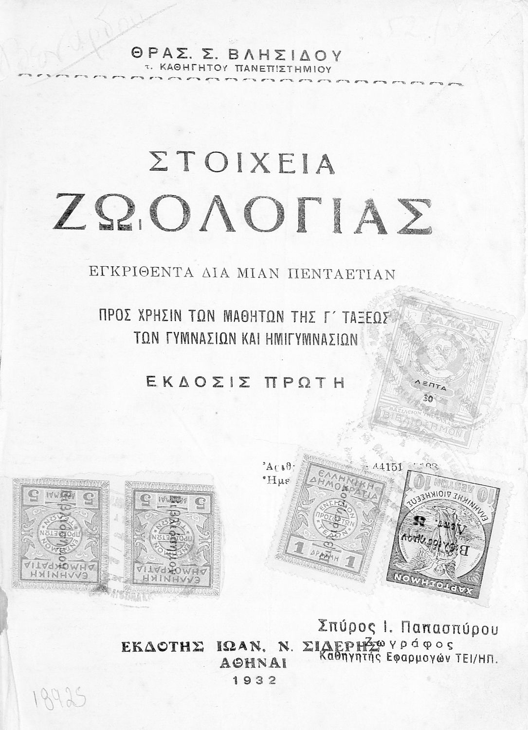 Σχολικό εγχειρίδιο Ζωολογίας για την Γ΄ Γυμνασίου χωρισμένο σε δύο ενότητες: την περιγραφική και τη γενική ζωολογία. Ο συγγραφέας ήταν πρώην καθηγητής πανεπιστημίου.