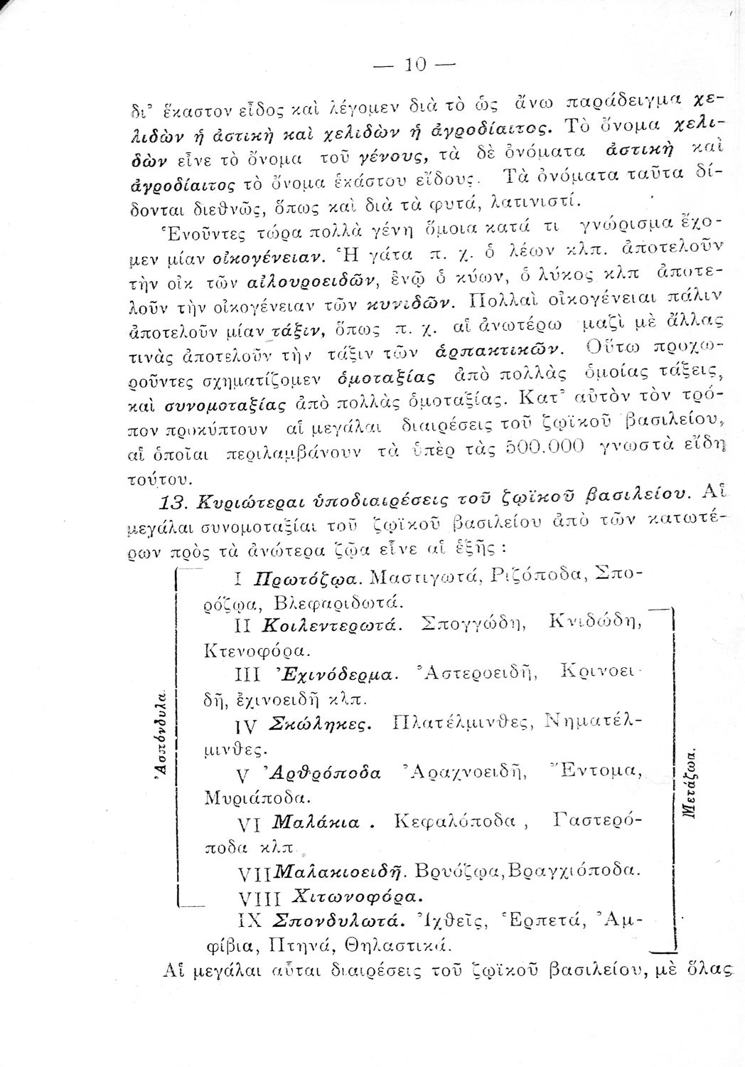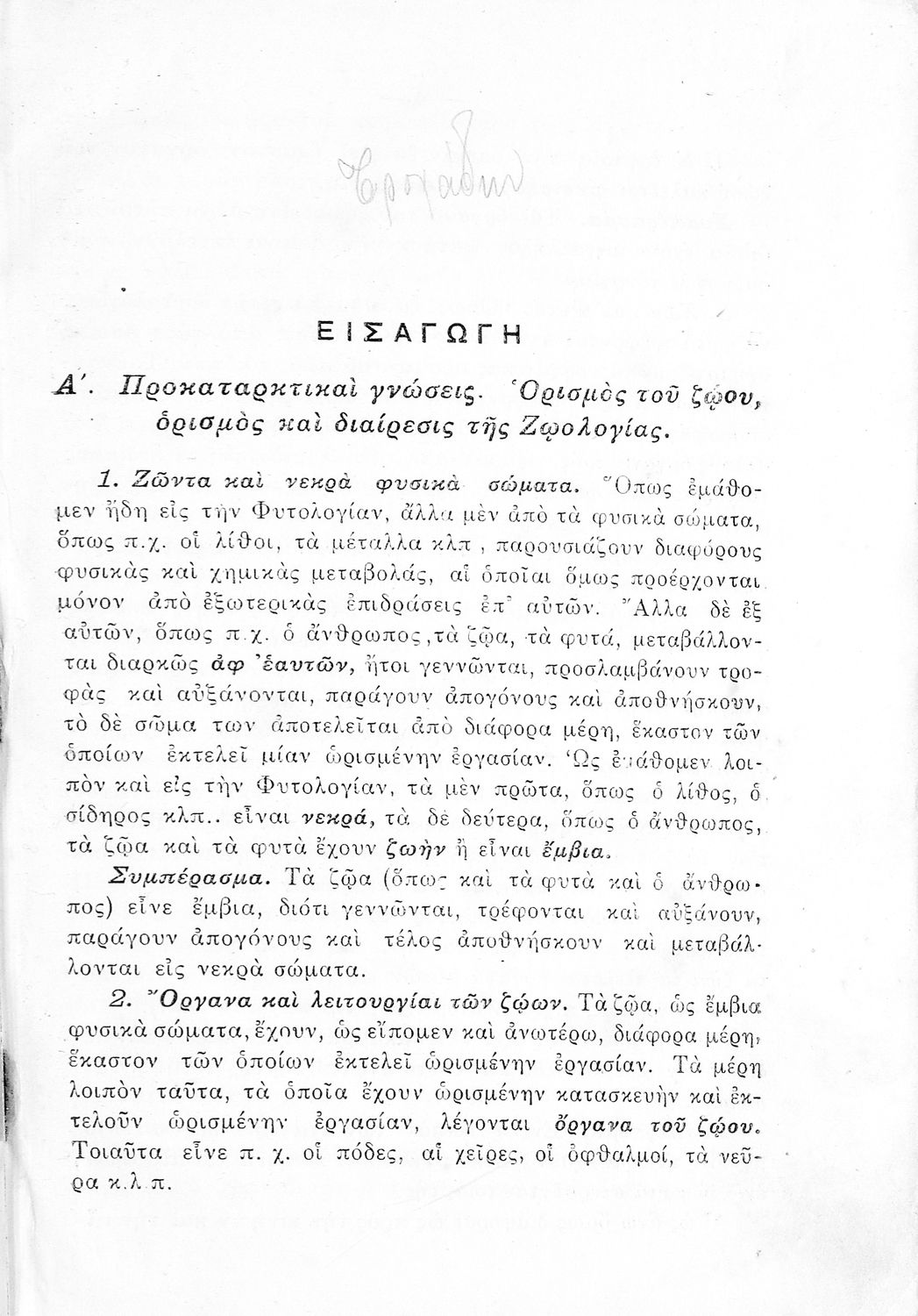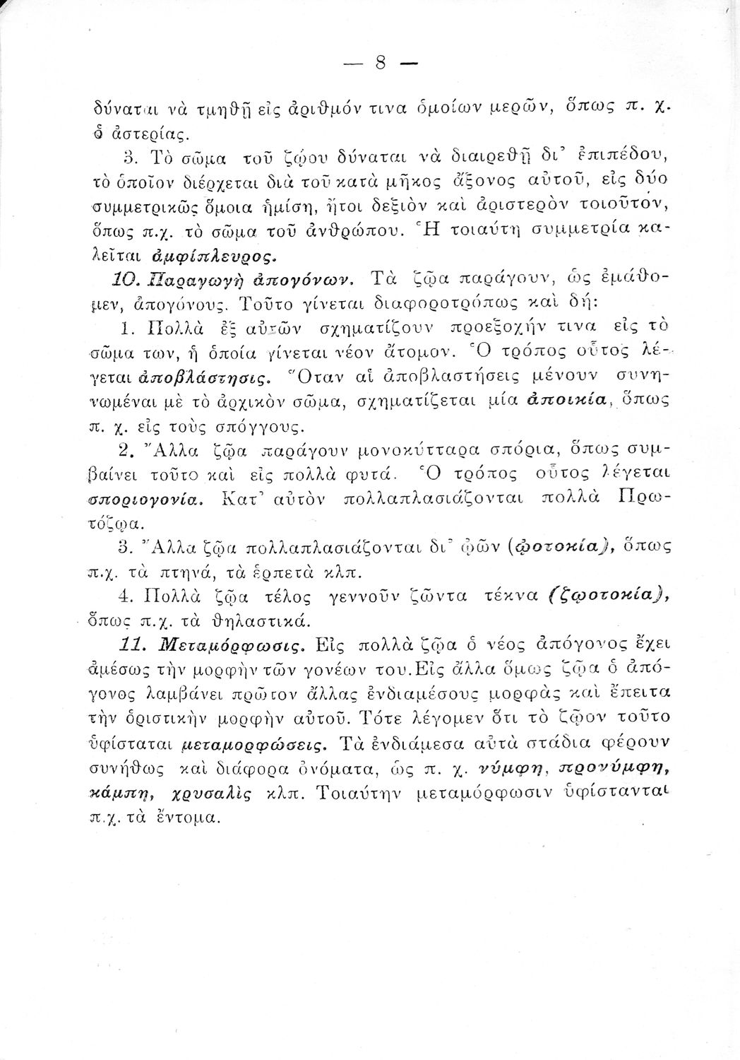 Σχολικό εγχειρίδιο Ζωολογίας για την Γ΄ Γυμνασίου χωρισμένο σε δύο ενότητες: την περιγραφική και τη γενική ζωολογία. Ο συγγραφέας ήταν πρώην καθηγητής πανεπιστημίου.