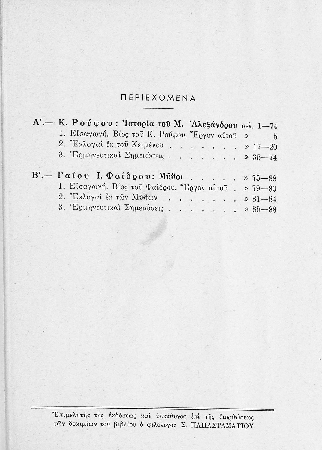 Σχολικό εγχειρίδιο Λατινικών που περιέχει σύντομο βιογραφικό σημείωμα των Ρούφου και Φαίδρου, εισαγωγή στα έργα, κείμενο και ερμηνευτικές σημειώσεις.