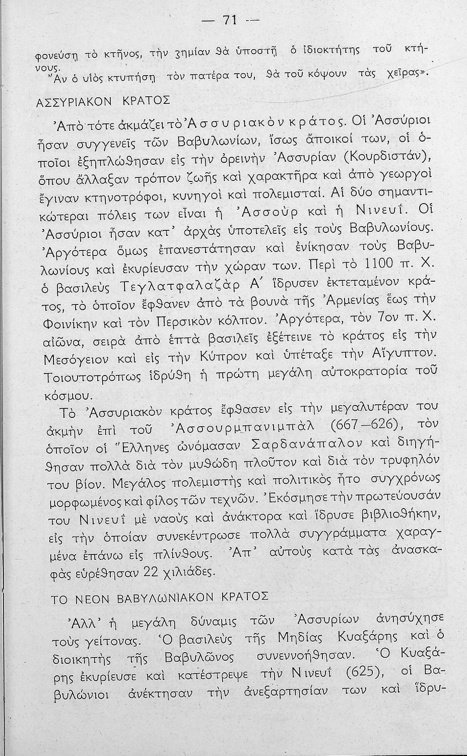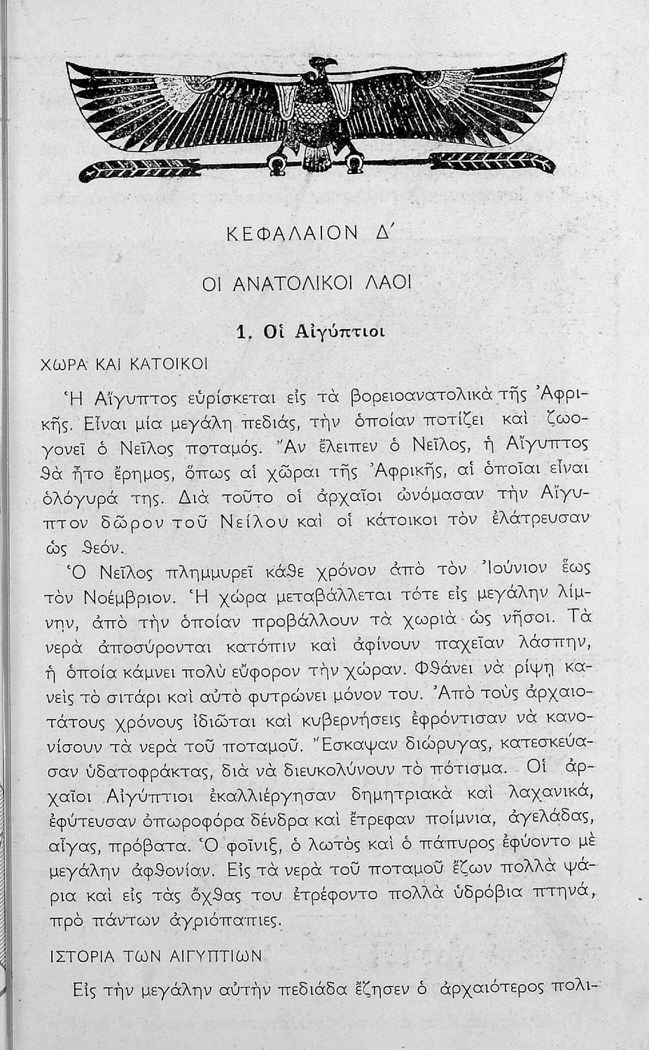 Σχολικό εγχειρίδιο Ιστορίας Α΄ Γυμνασίου που καλύπτει την περίοδο από την εμφάνιση των πρώτων πολιτισμών ως το τέλος της Μακεδονικής Ηγεμονίας. Φέρει το σύμβολο της δικτατορίας.