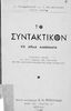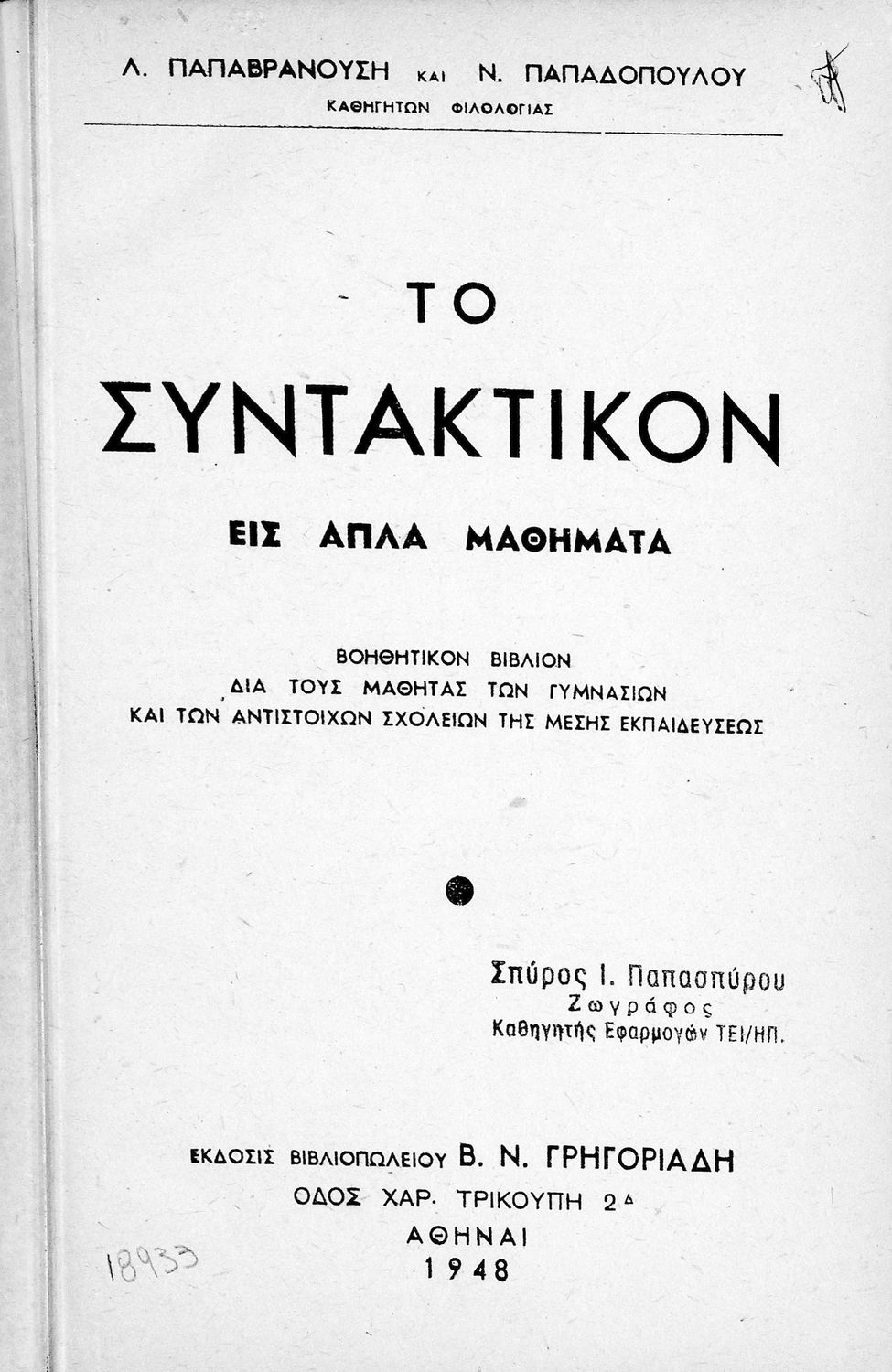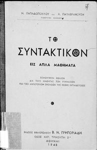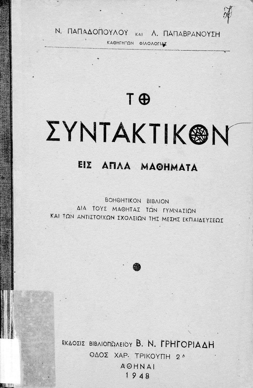 Κωδικός αναγνώρισης: 01-18933 Τίτλος: Το Συντακτικόν εις απλά μαθήματα βοηθητικόν βιβλίον δια τους μαθητάς των Γυμνασίων και των αντιστοίχων σχολείων της Μέσης Εκπαιδεύσεως Συγγραφέας: Λ. Παπαβρανούσης, Ν. Παπαδόπουλος Μέγεθος και υπόστρωμα: Μαθητικό βοήθημα, 20εκ., σκληρό εξώφυλλο, 136 σελίδες. |
