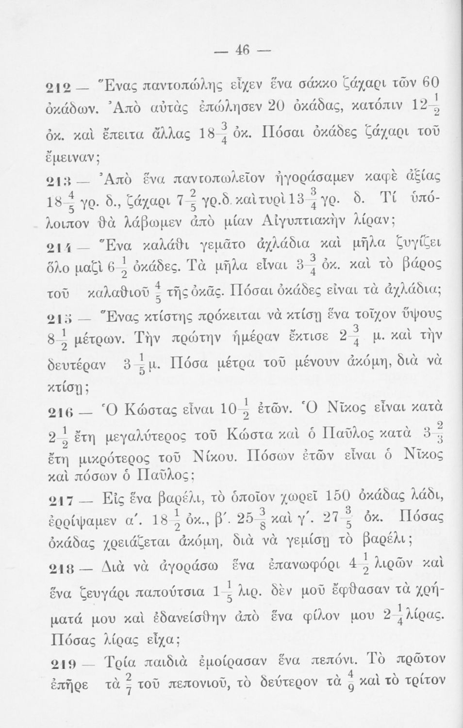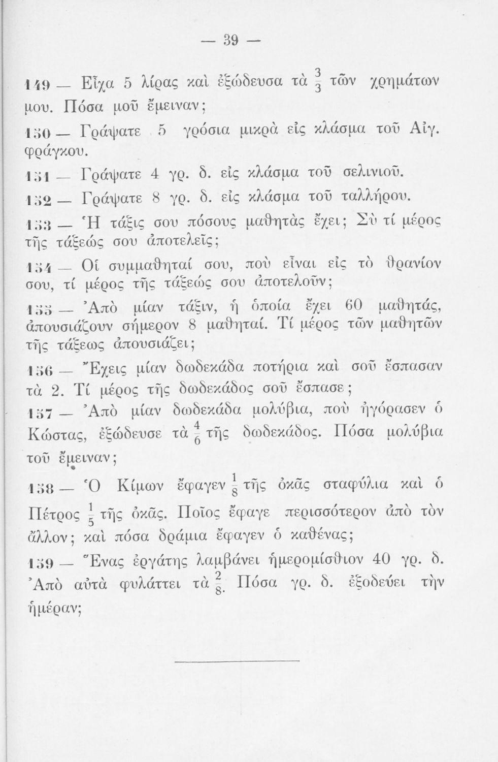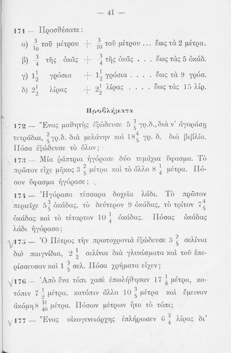 Βαθμίδα εκπαίδευσης: Πρωτοβάθμια Τάξη: Ε' Δημοτικού Μάθημα: Μαθηματικά Γλώσσα: Δημοτική Παρουσίαση περιεχομένου: Σχολικό εγχειρίδιο με προβλήματα Αριθμητικής για την Ε΄ Δημοτικού χωρισμένο με βάση τις αριθμητικές πράξεις και τα κλάσματα. |