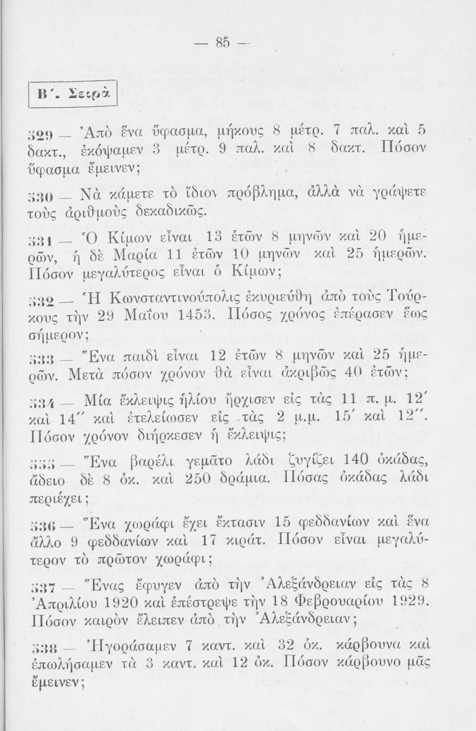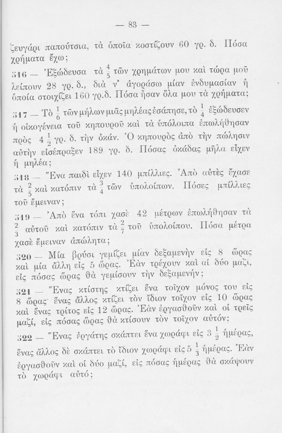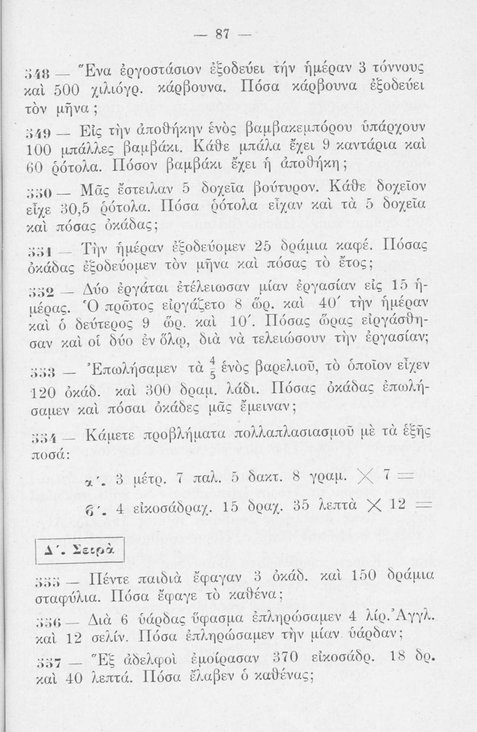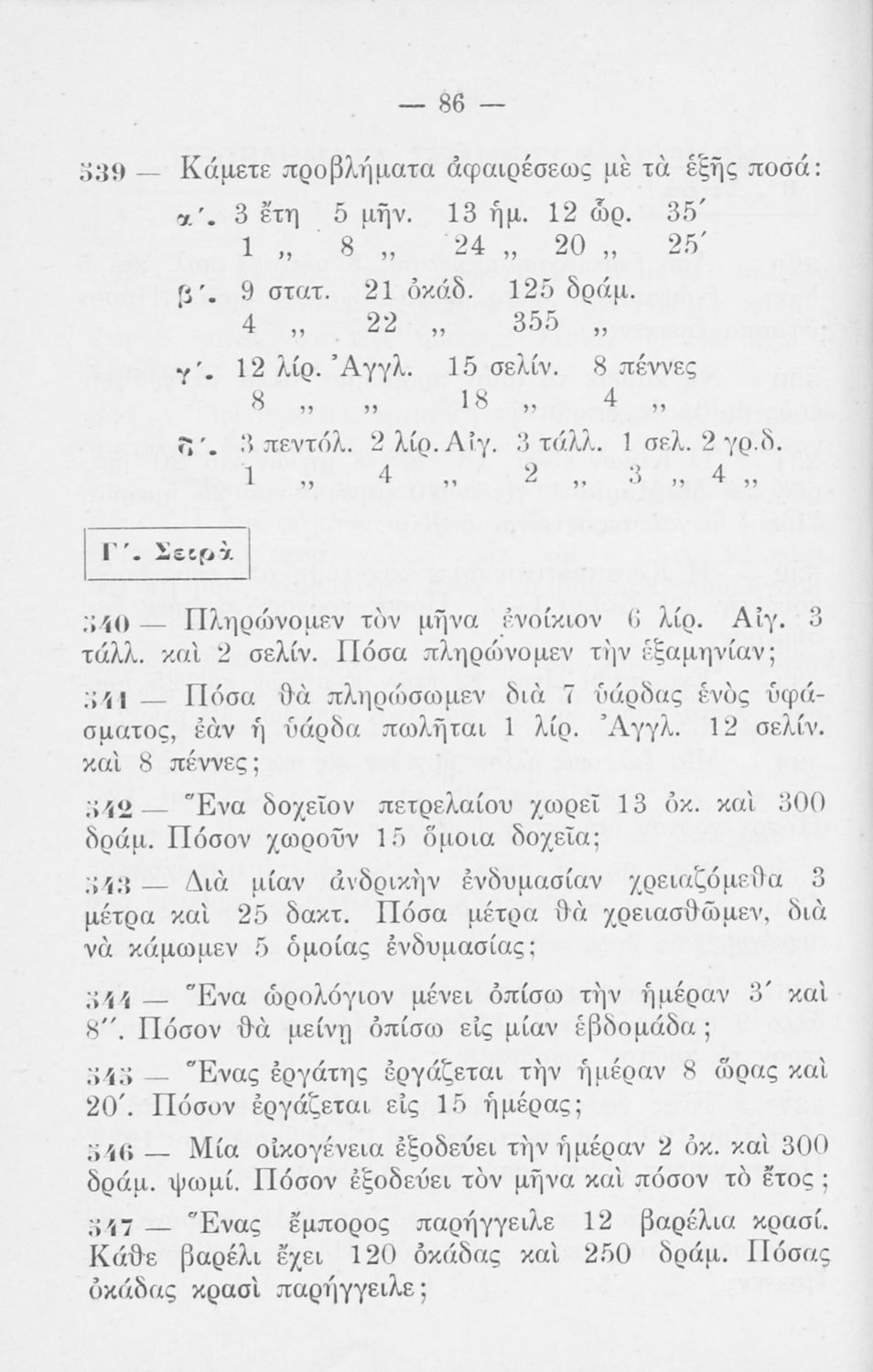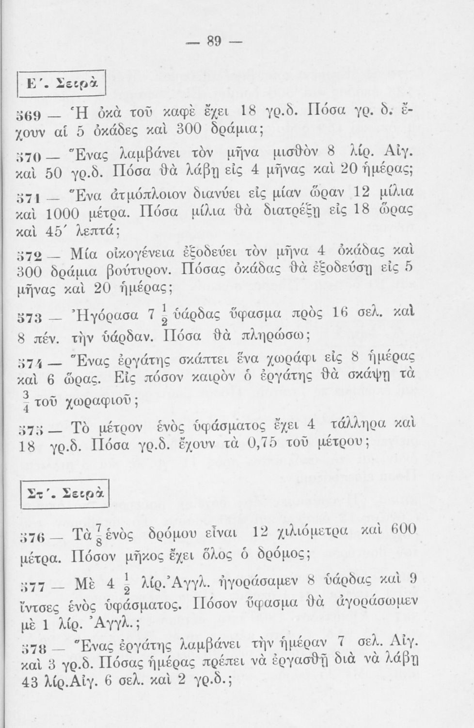 Βαθμίδα εκπαίδευσης: Πρωτοβάθμια Τάξη: Ε' Δημοτικού Μάθημα: Μαθηματικά Γλώσσα: Δημοτική Παρουσίαση περιεχομένου: Σχολικό εγχειρίδιο με προβλήματα Αριθμητικής για την Ε΄ Δημοτικού χωρισμένο με βάση τις αριθμητικές πράξεις και τα κλάσματα. |
