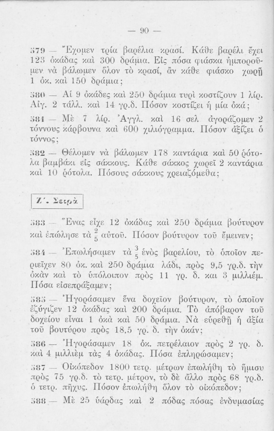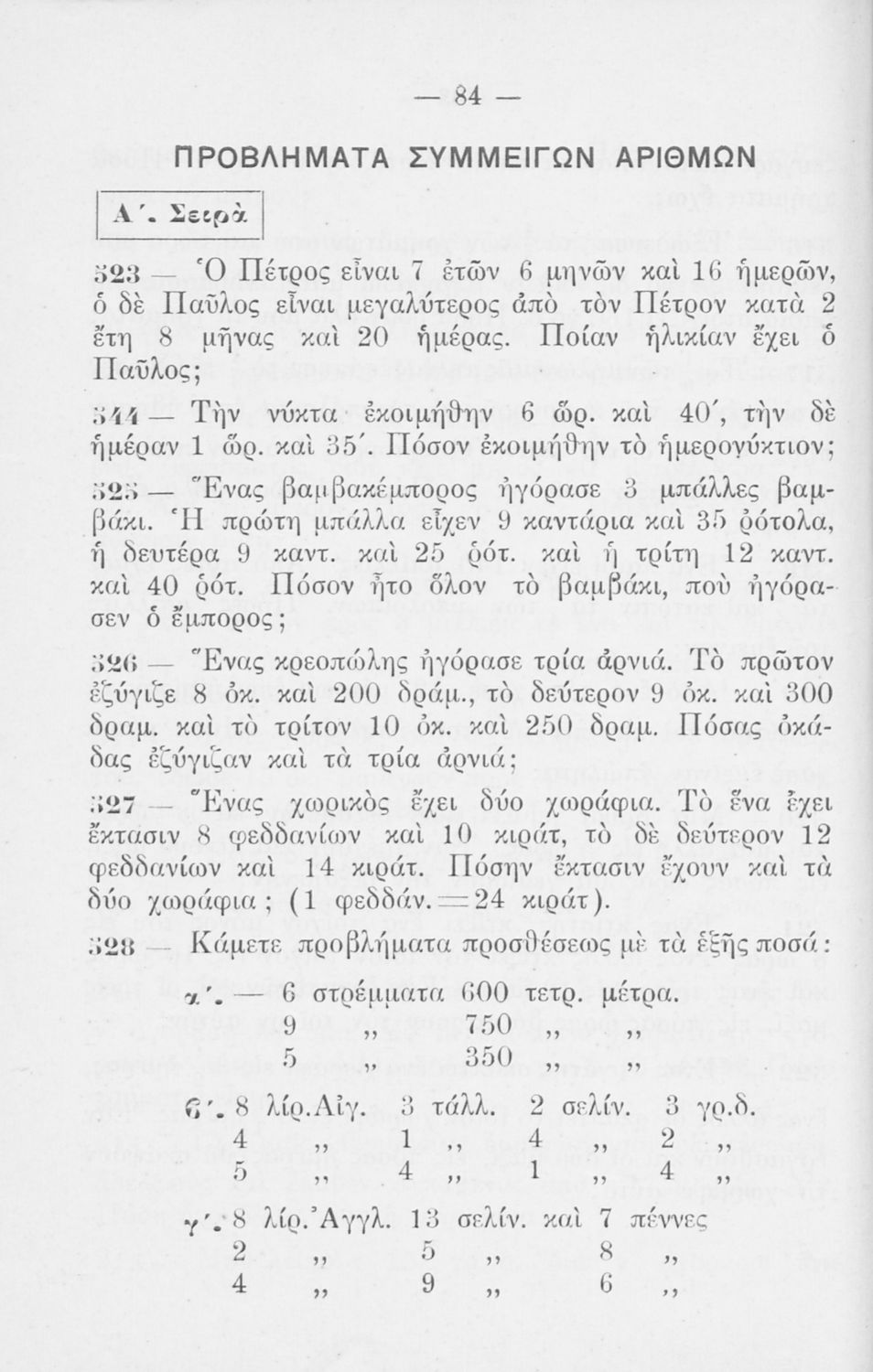 Κωδικός αναγνώρισης: 01-18935 Τίτλος: Συλλογή αριθμητικών προβλημάτων προς χρήσιν των μαθητών της πέμπτης τάξεως των εν Αιγύπτω πλήρων Δημοτικών Σχολείων Συγγραφέας: Κ. Παπαγεωργίου, Στ. Παχώπου, Μ. Χατζηπέτρος Μέγεθος και υπόστρωμα: Μαθητικό βοήθημα, 19εκ., σκληρό εξώφυλλο, 91 σελίδες. |