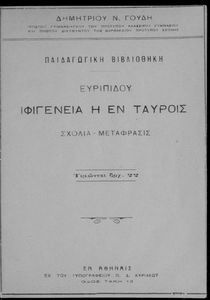 Κωδικός αναγνώρισης: 01-18937b Τίτλος: Ευριπίδου Ιφιγένεια εν Ταύροις σχόλια-μετάφρασις Συγγραφέας: Ευριπίδης, Δημήτριος Ν. Γουδής (σχόλια) Μέγεθος και υπόστρωμα: Μαθητικό βοήθημα, 20εκ., 122 σελίδες. |