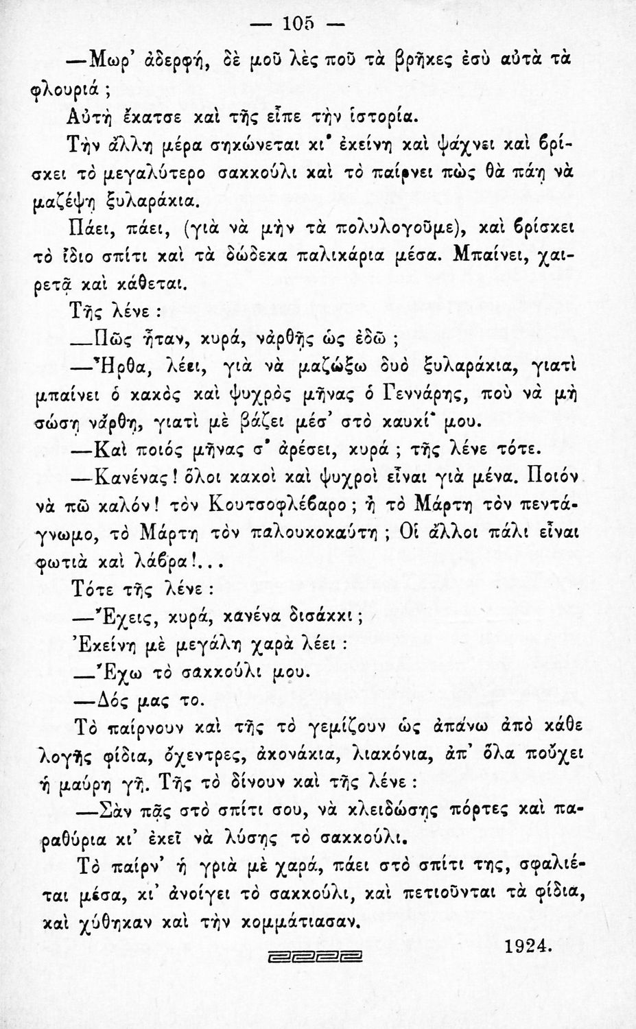 Σχολικό εγχειρίδιο Νέων Ελληνικών Α' Ελληνικού Σχολείου που περιλαμβάνει πεζά και ποιήματα Ελλήνων συγγραφέων και δημοτικά τραγούδια εμπνευσμένα από την σύγχρονη ελληνική ιστορία, την ελληνική ύπαιθρο και τα ζώα, τις καθημερινές ασχολίες και τα επαγγέλματα των ανθρώπων. Περιέχει και παράρτημα με βιογραφίες των συγγραφέων και λεξιλόγιο.