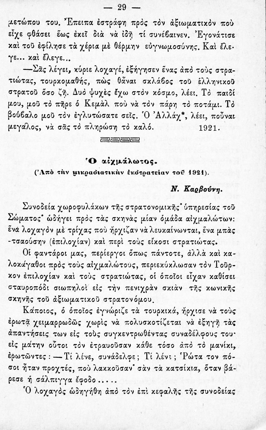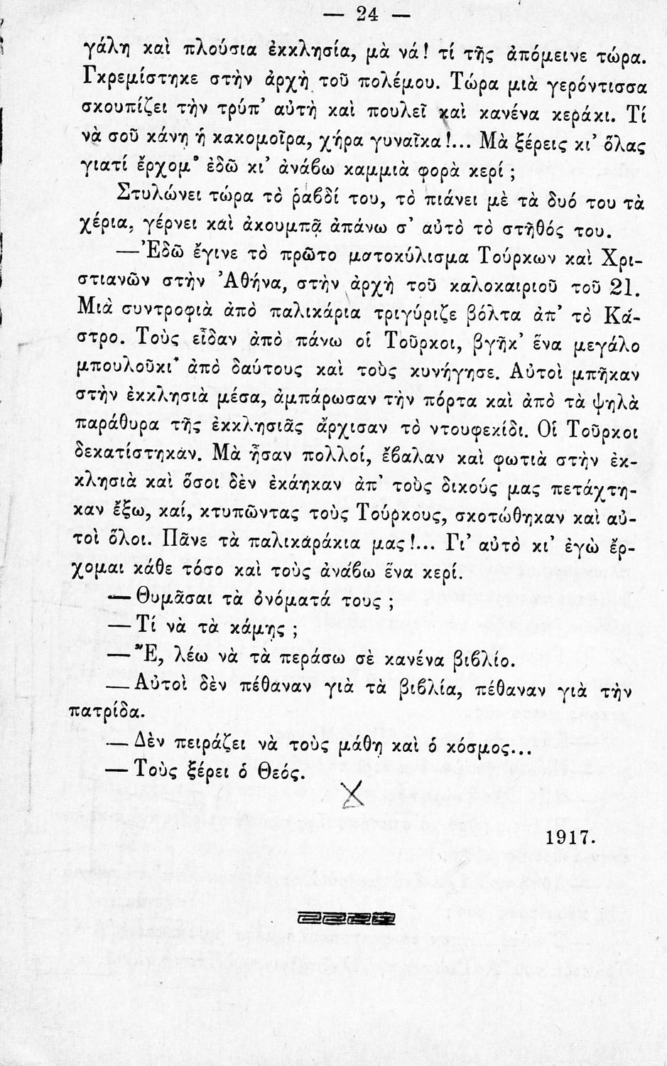 Σχολικό εγχειρίδιο Νεοελληνικών αναγνωσμάτων που περιλαμβάνει πεζά και ποιήματα Ελλήνων συγγραφέων με θέματα από την εθνική ζωή. Περιέχει και παράρτημα με βιογραφίες των συγγραφέων και λεξιλόγιο.