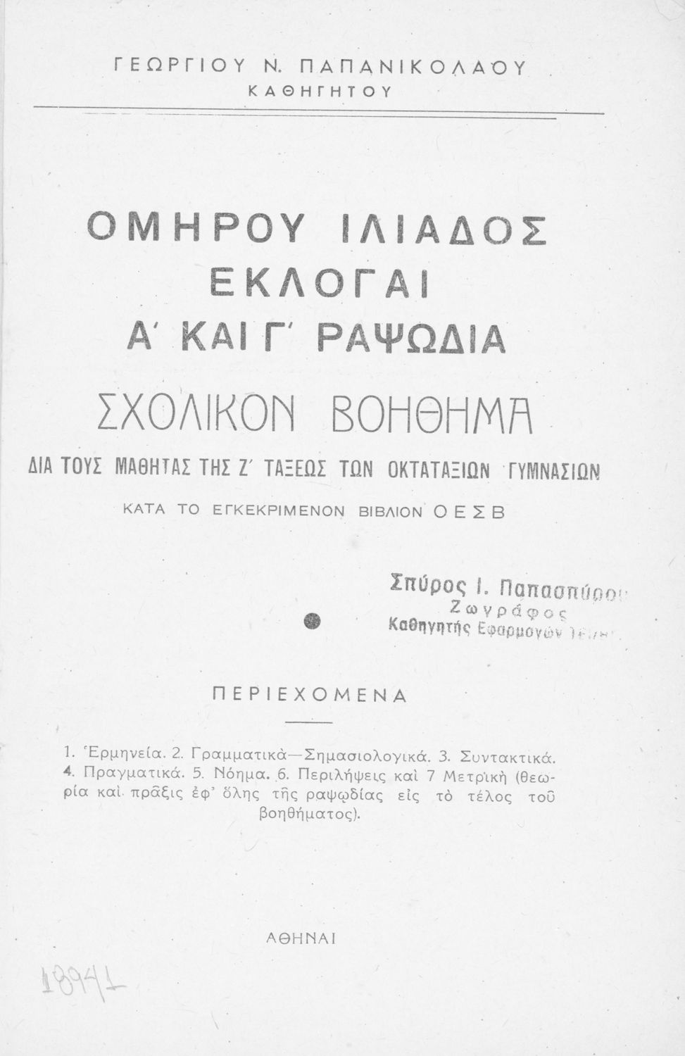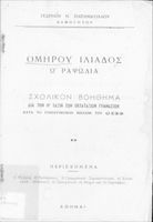 Τίτλος: Ομήρου Ιλιάδος, Εκλογαί Α΄ και Γ΄ Ραψωδία σχολικόν βοήθημα : δια τους μαθητάς της Ζ΄ τάξεως των οκτατάξιων Γυμνασίων