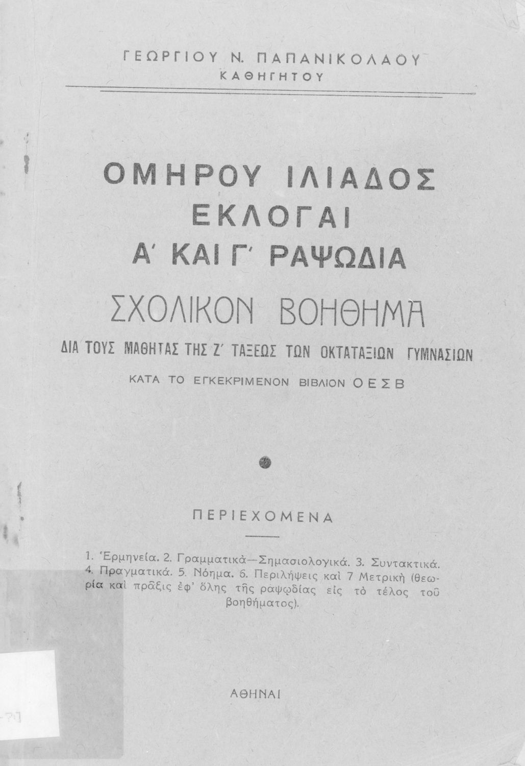 Ομήρου Ιλιάδος, Εκλογαί Α΄ και Γ΄ Ραψωδία σχολικόν βοήθημα : δια τους μαθητάς της Ζ΄ τάξεως των οκτατάξιων Γυμνασίων