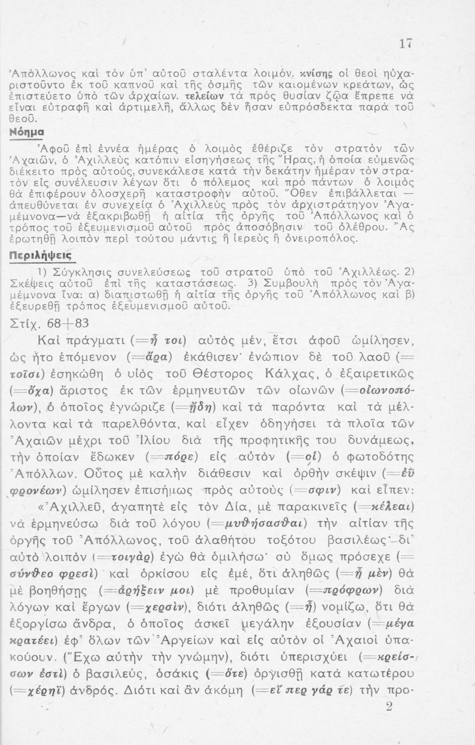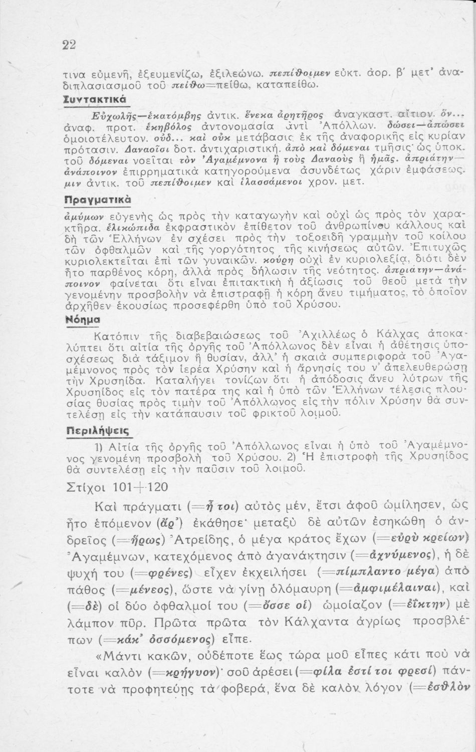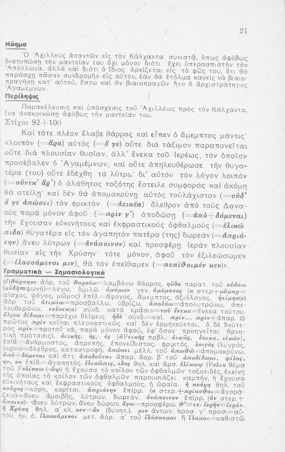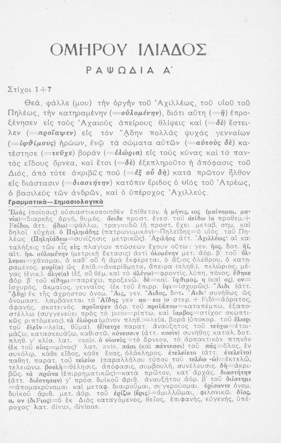 Μαθητικό βοήθημα Αρχαίων Ελληνικών της Γ΄ τάξης των τετρατάξιων Γυμνασίων το οποίο περιέχει σε μετάφραση τη ραψωδία Α΄ από την 'Ιλιάδα' του Ομήρου.