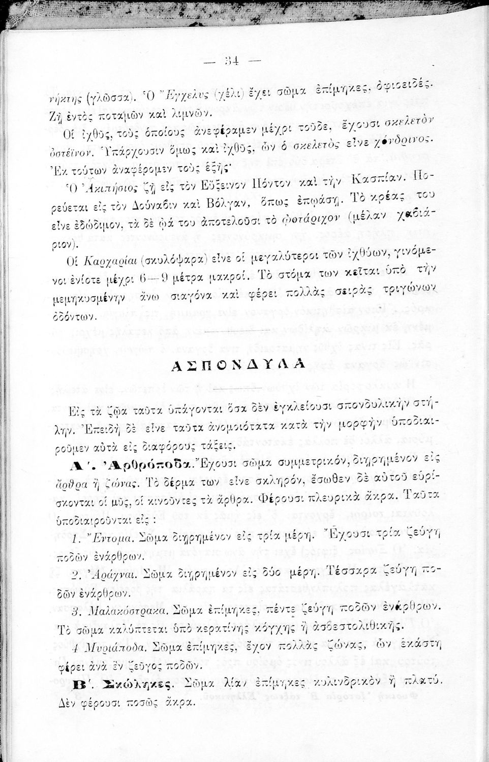 Σχολικό Εγχειρίδιο Φυσικής Ιστορίας για τις Α' και Β' Ελληνικών Σχολείων και Παρθεναγωγείων που περιλαμβάνει στοιχεία ζωολογίας και της φυτολογίας και διακρίνει τα ζώα και τα φυτά ανάλογα με την συνομοταξία ...