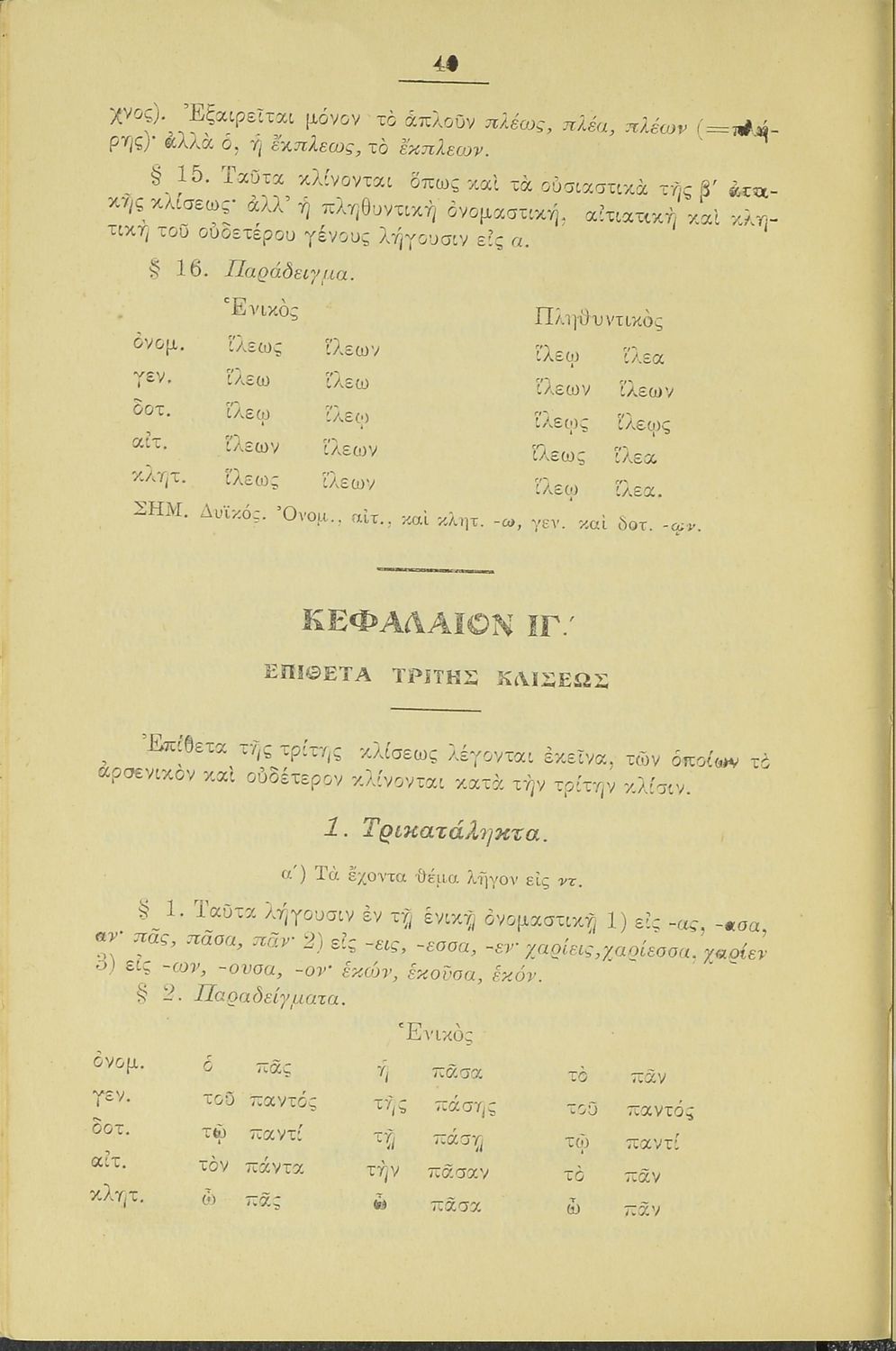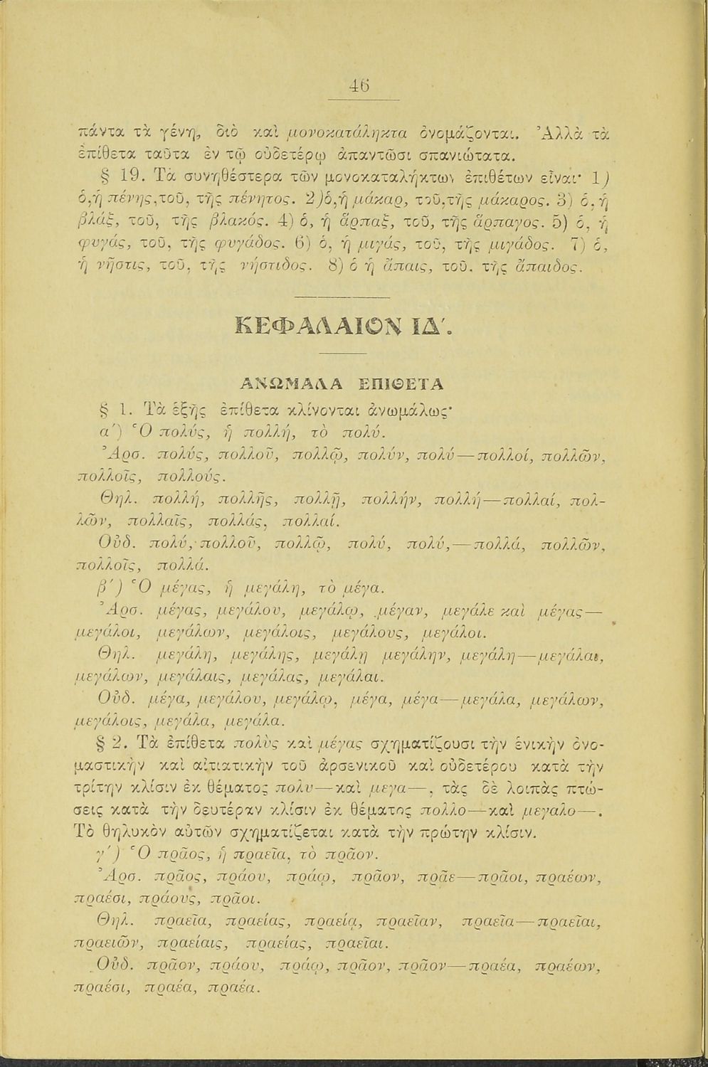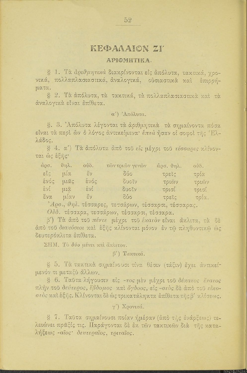 Σχολικό εγχειρίδιο Αρχαίων Ελληνικών για τα Ελληνικά Σχολεία, Παρθεναγωγεία και Γυμνάσια που περιέχει τους κανόνες γραμματικής και είναι χωρισμένο σε φθογγολογικό, τυπολογικό και ετυμολογικό μέρος.