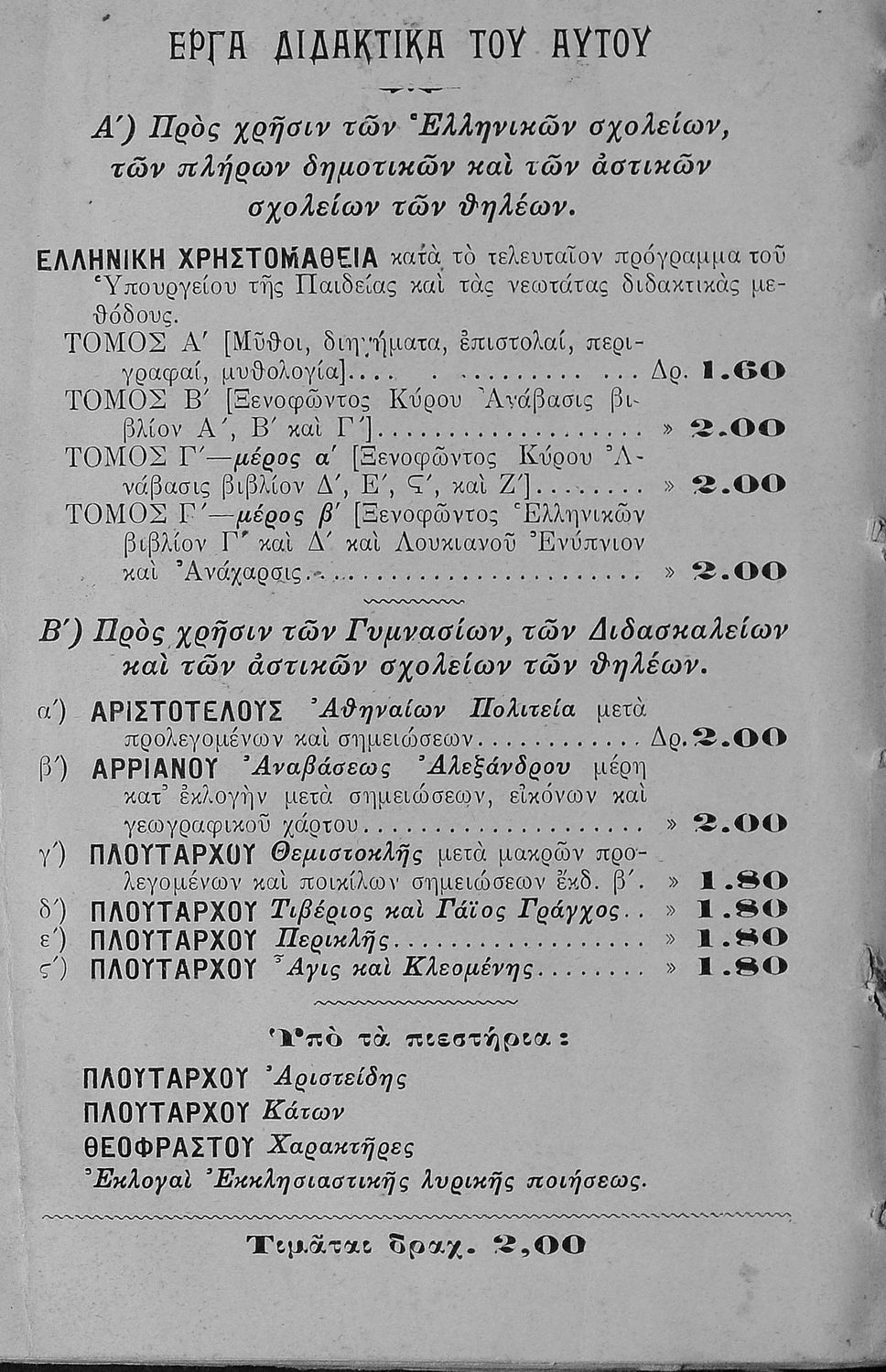 Μαθητικό βοήθημα Αρχαίων Ελληνικών Γυμνασίου που περιέχει την Αθηναίων Πολιτεία του Αριστοτέλη, εισαγωγή και ερμηνευτική ανάλυση. Ο συγγραφέας ήταν καθηγητής του Μαράσλειου Διδασκαλείου.