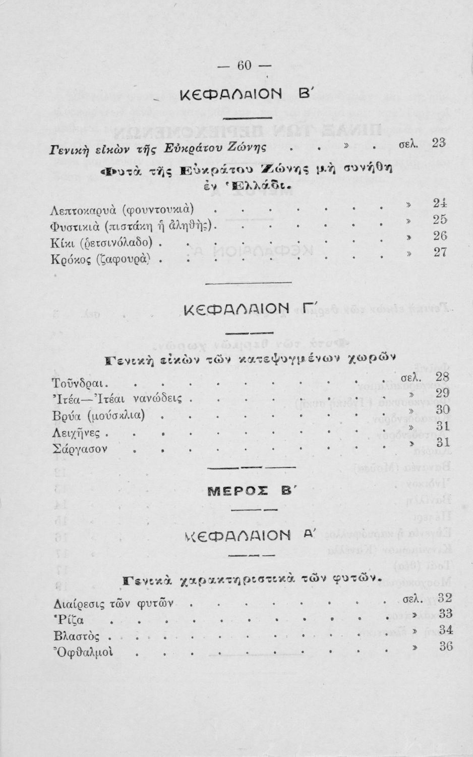 Κωδικός αναγνώρισης: 01-18951 Τίτλος: Φυτολογία περιλαμβάνον την ύλην του προγράμματος της Ε΄ και Στ΄ τάξεως των Δημοτικών Σχολείων τεύχος Β΄ Συγγραφέας: Ηλίας Χ. Γοντζές Μέγεθος και υπόστρωμα: Μαθητικό βοήθημα, μαλακό εξώφυλλο, 62 σελίδες. Εικόνες (ασπρόμαυρες), σκίτσα (ασπρόμαυρα). |