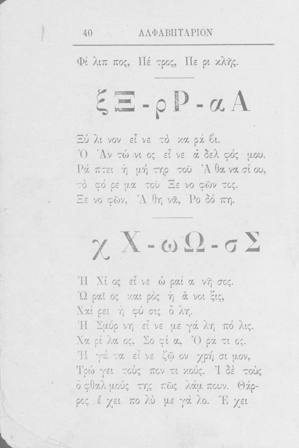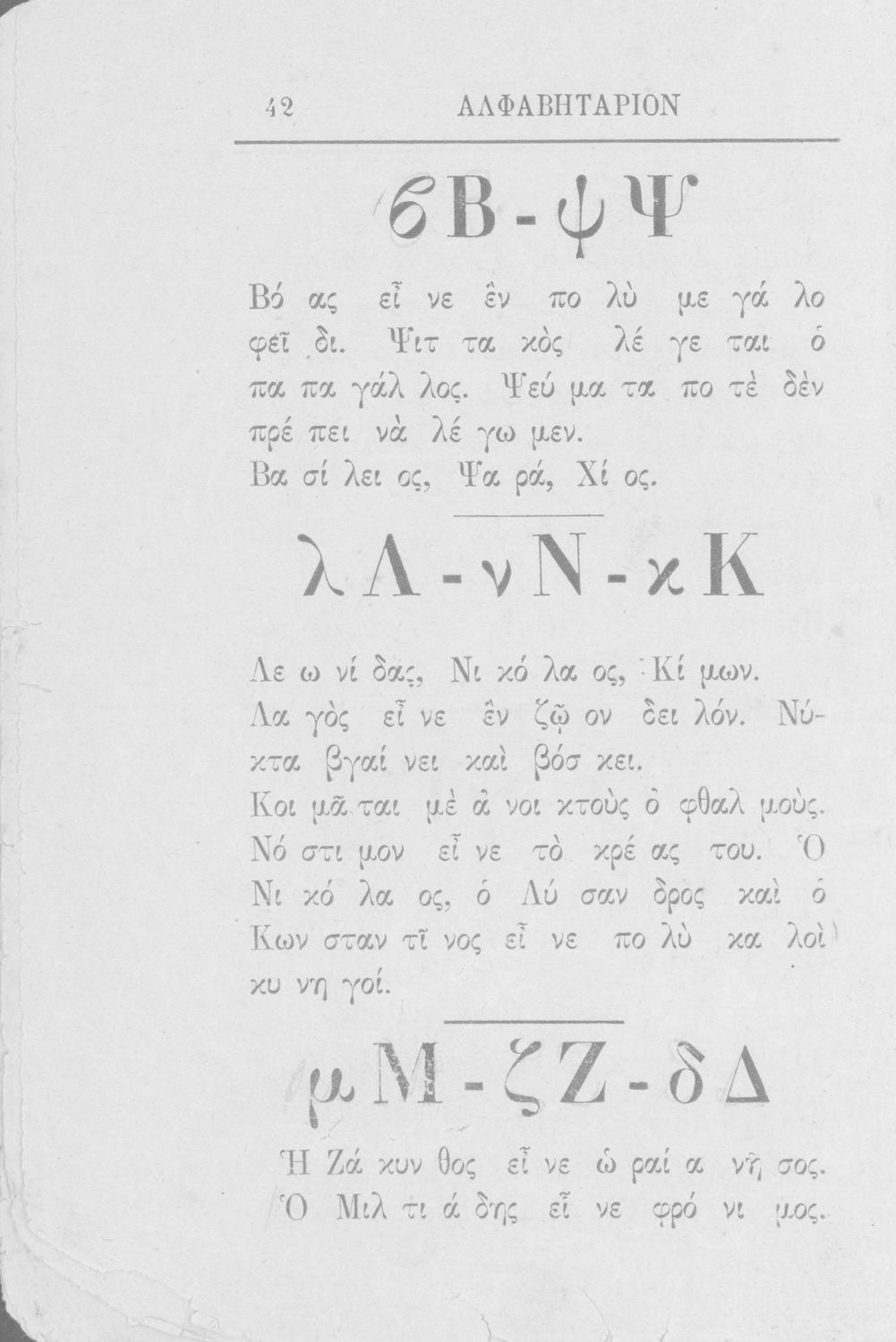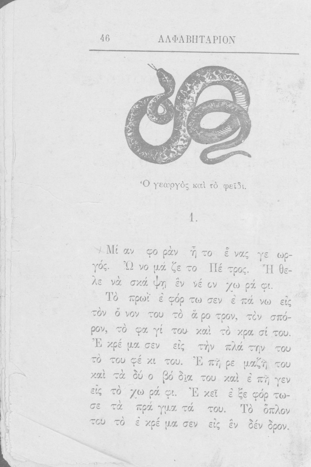 Βαθμίδα εκπαίδευσης: Πρωτοβάθμια Μάθημα: Νέα Ελληνικά Γλώσσα: Καθαρεύουσα Παρουσίαση περιεχομένου: Αναγνωστικό Α΄ Δημοτικού που περιέχει τα γράμματα, συλλαβές και λέξεις, κείμενα και ποιήματα. |