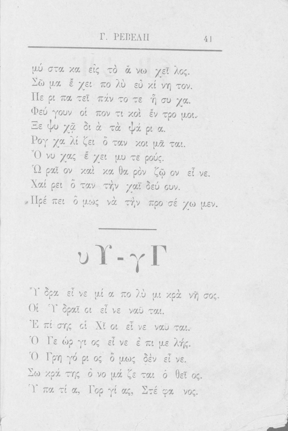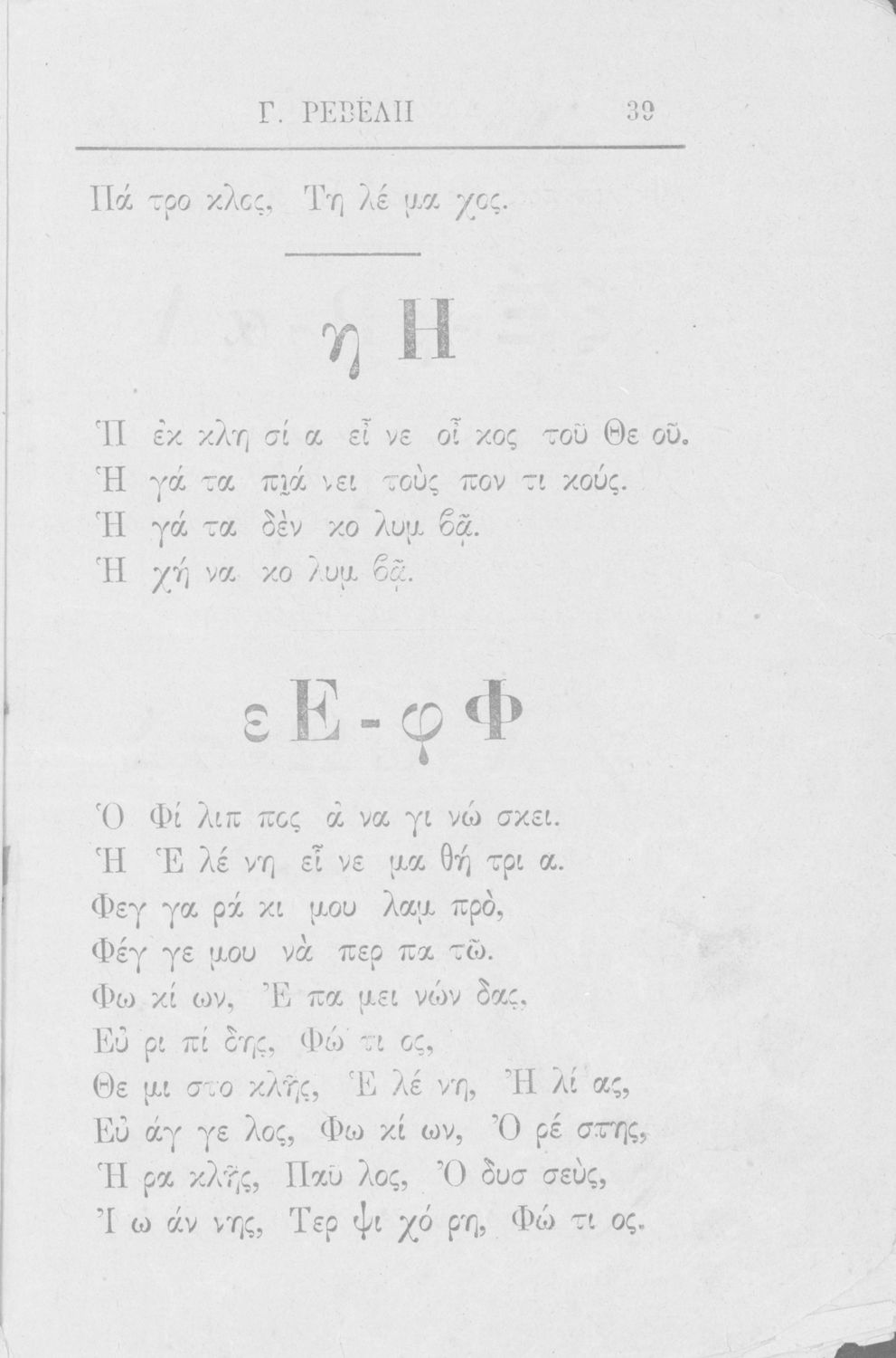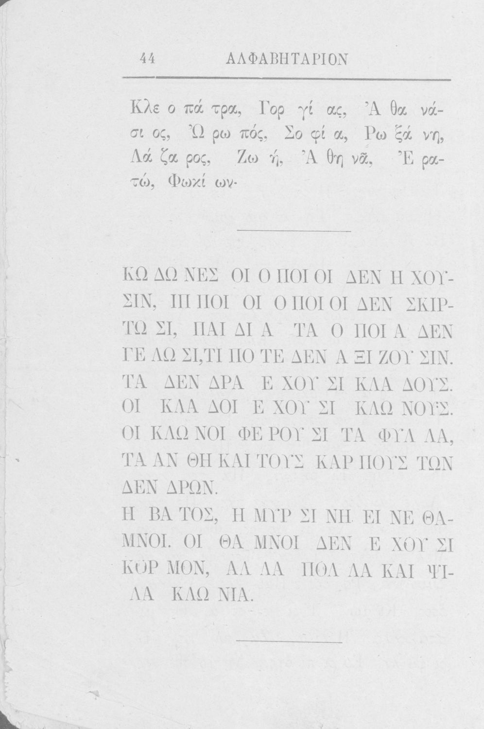 Βαθμίδα εκπαίδευσης: Πρωτοβάθμια Μάθημα: Νέα Ελληνικά Γλώσσα: Καθαρεύουσα Παρουσίαση περιεχομένου: Αναγνωστικό Α΄ Δημοτικού που περιέχει τα γράμματα, συλλαβές και λέξεις, κείμενα και ποιήματα. |