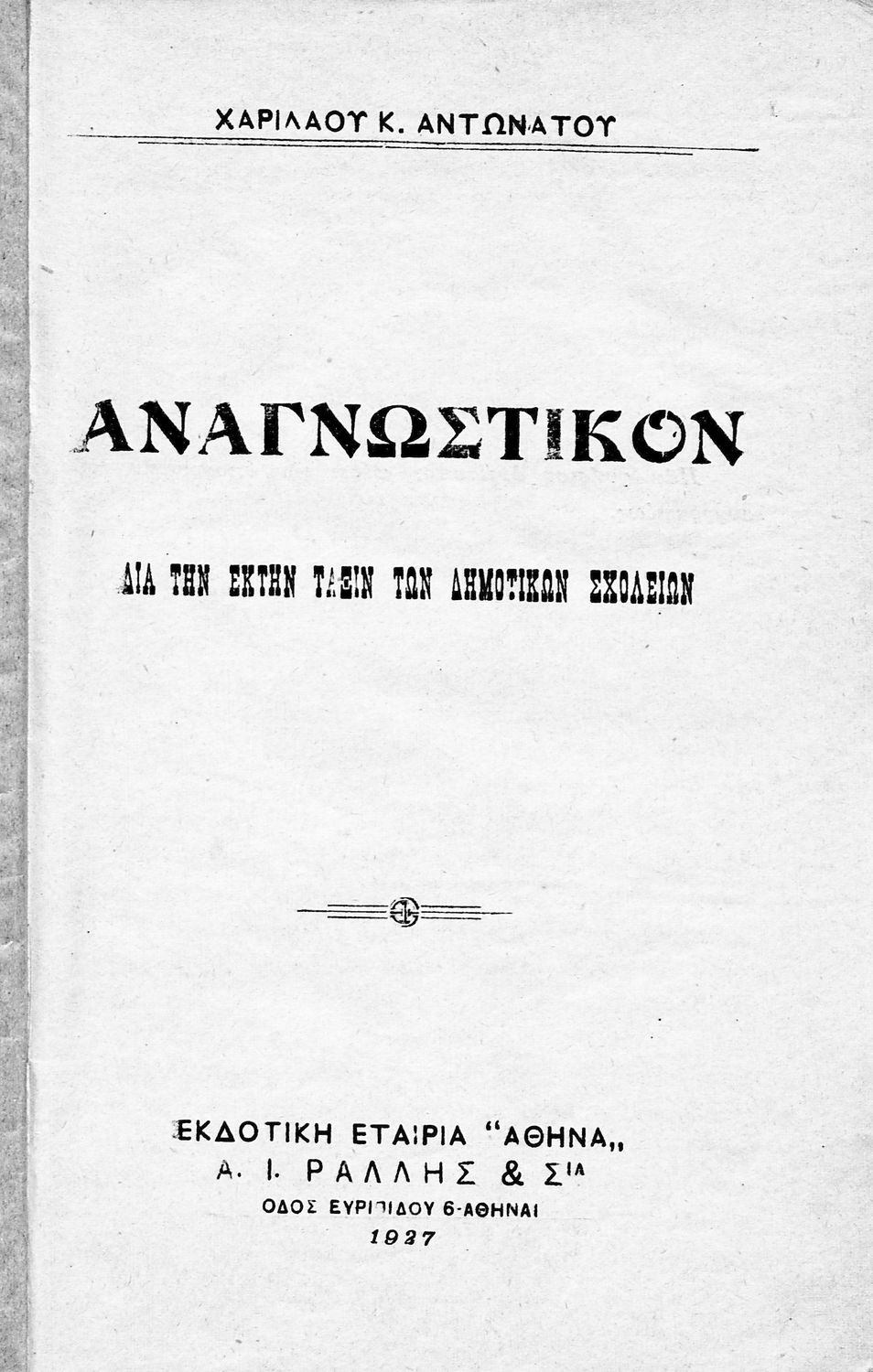 Εκδότης: Εκδοτική Εταιρεία Α.Μ. Κοντομάρης & ΣΙΑ Έτος έκδοσης: 1928 Τόπος έκδοσης: Αθήνα |
