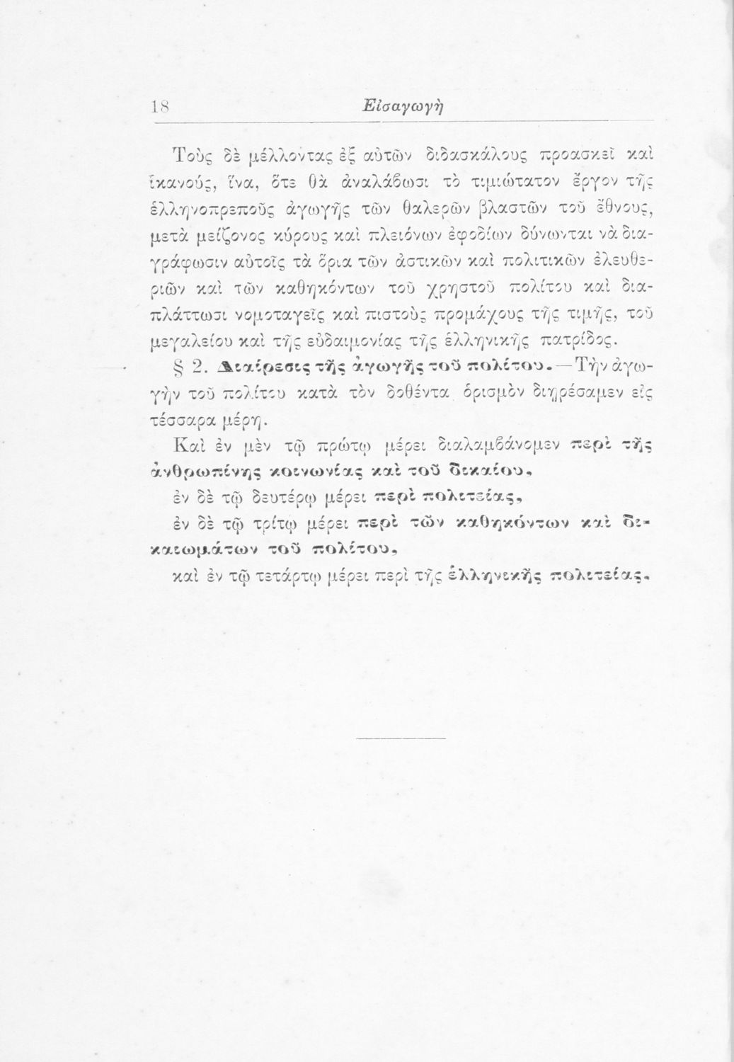 Βαθμίδα εκπαίδευσης: Δευτεροβάθμια Τάξη: Γυμνάσιο Μάθημα: Αγωγή Του Πολίτη Γλώσσα: Απλή καθαρεύουσα Παρουσίαση περιεχομένου: Παιδαγωγικό βοήθημα Αγωγής του Πολίτη Γυμνασίου που απευθύνεται σε διδασκάλους, σπουδάζοντες νέους, αλλά και σε κάθε πολίτη. Αποσκοπεί στην κατανόηση της έννοιας του Δίκαιου και του Πολίτη. Περιλαμβάνει το αναθεωρημένο Σύνταγμα του 1911. |
