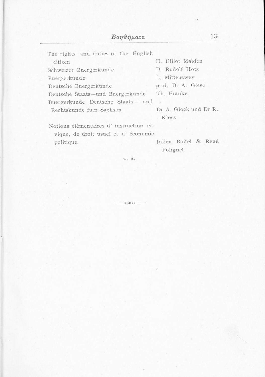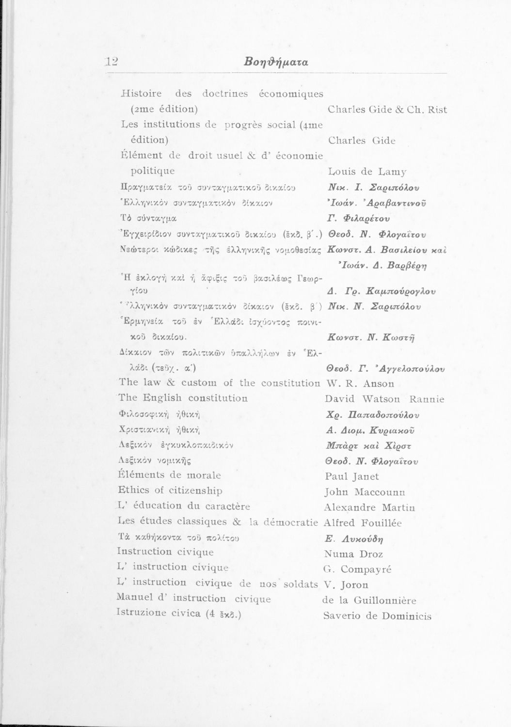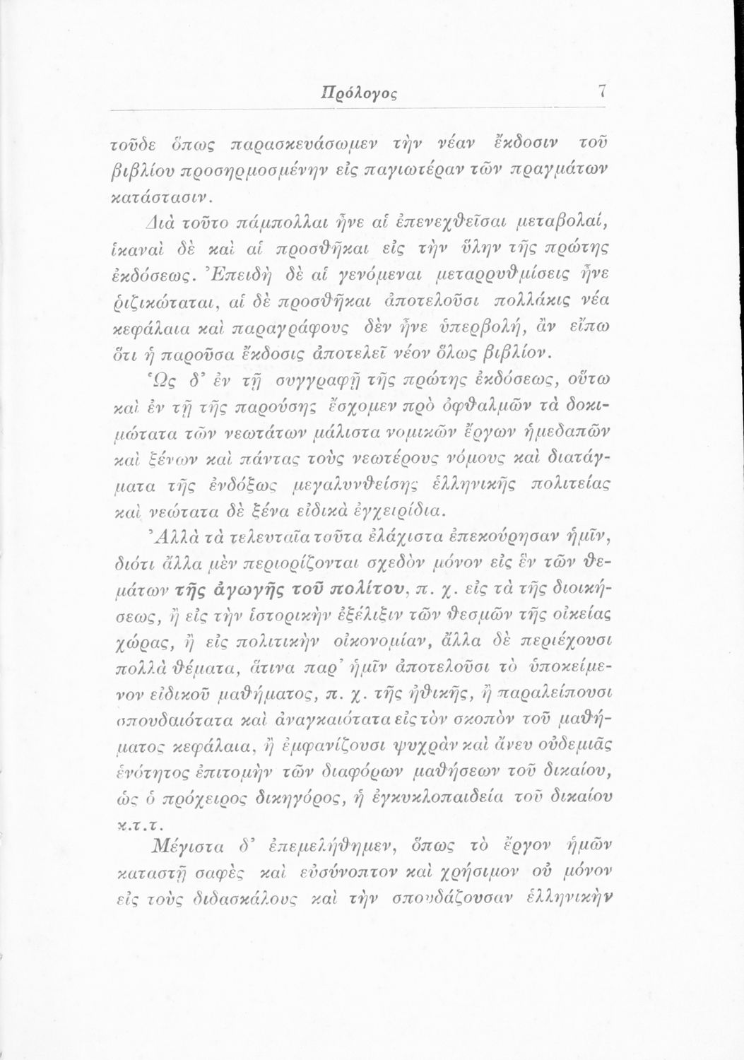 Παιδαγωγικό βοήθημα Αγωγής του Πολίτη Γυμνασίου που απευθύνεται σε διδασκάλους, σπουδάζοντες νέους, αλλά και σε κάθε πολίτη. Αποσκοπεί στην κατανόηση της έννοιας του Δίκαιου και του Πολίτη. Περιλαμβάνει το αναθεωρημένο Σύνταγμα του 1911.