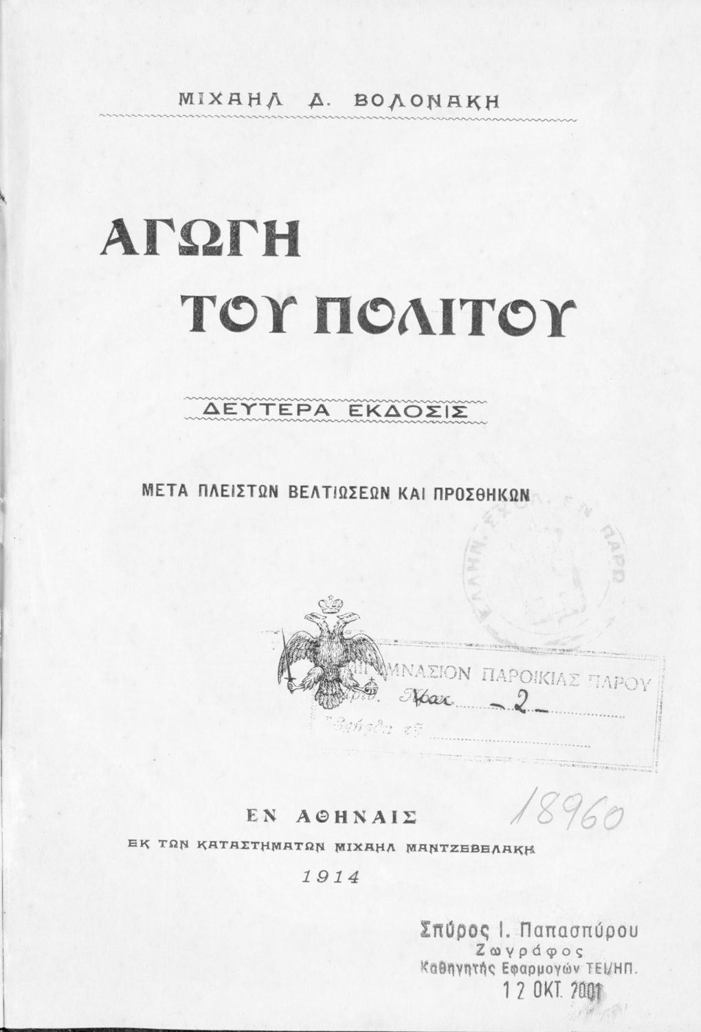 Εκδότης: Μιχαήλ Μαντζαβελάκης Έτος έκδοσης: 1914 Τόπος έκδοσης: Αθήνα Έκδοση: 2η |