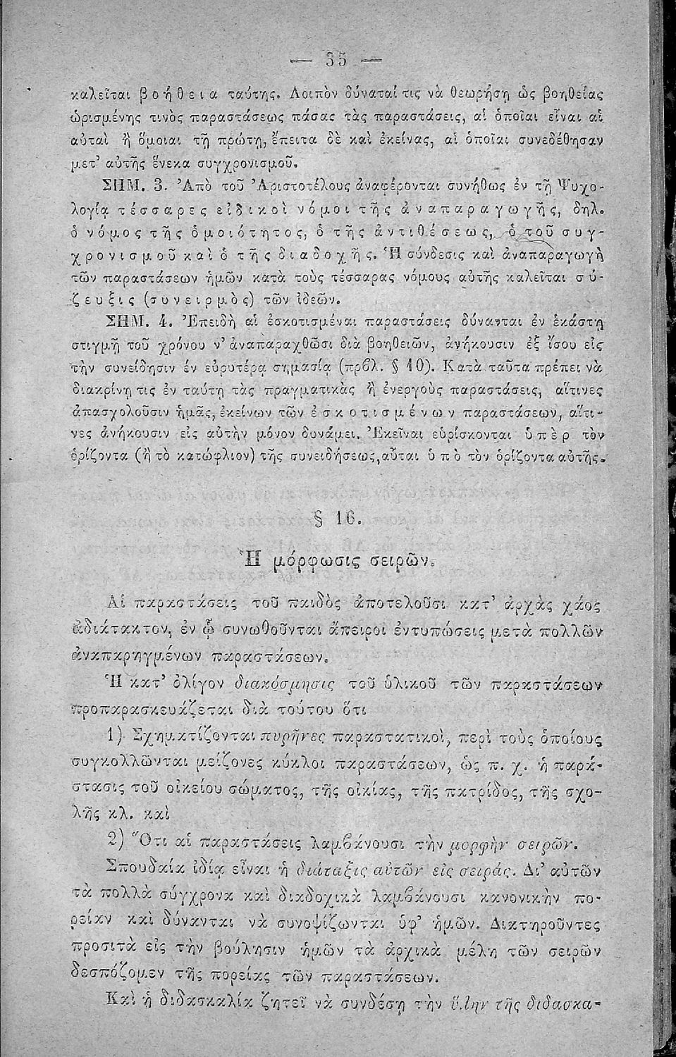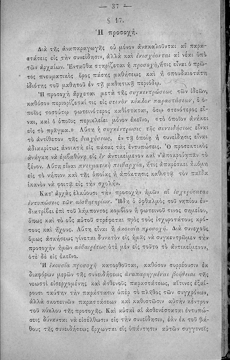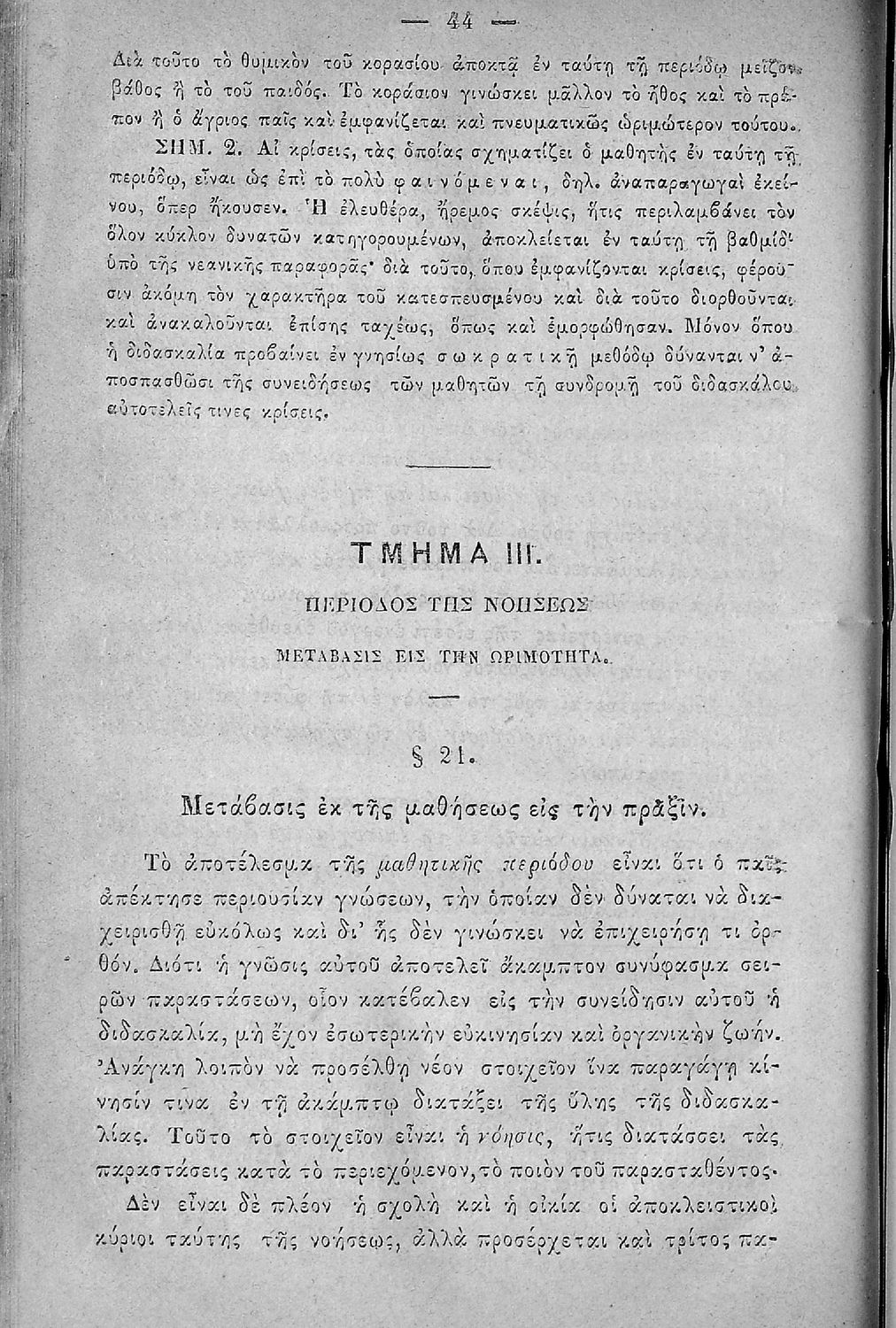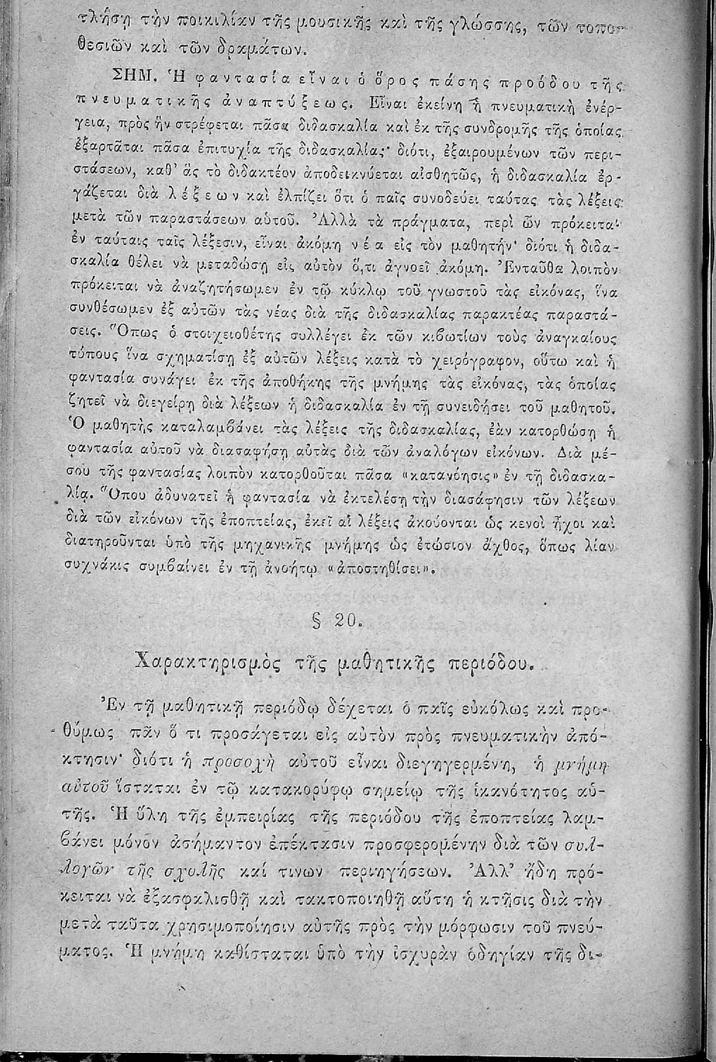 Παρουσίαση περιεχομένου: Σχολικό εγχειρίδιο που απευθύνεται στους μαθητές των Διδασκαλείων και του Πανεπιστημίου και αποσκοπεί να τους εξοικειώσει με ζητήματα παιδαγωγικής, διδακτικής, ψυχολογίας, λογικής και ηθικής. Το πρωτότυπο εγχειρίδιο είχε εγκριθεί από την αυστριακή κυβέρνηση και η μετάφρασή του έχει εγκριθεί από το Υπουργείο Εκκλησιαστικών και Δημόσιας Εκπαίδευσης. Ο μεταφραστής ήταν διευθυντής του Διδασκαλείου της Αθήνας και υφηγητής Φιλοσοφίας στο Πανεπιστήμιο Αθηνών.