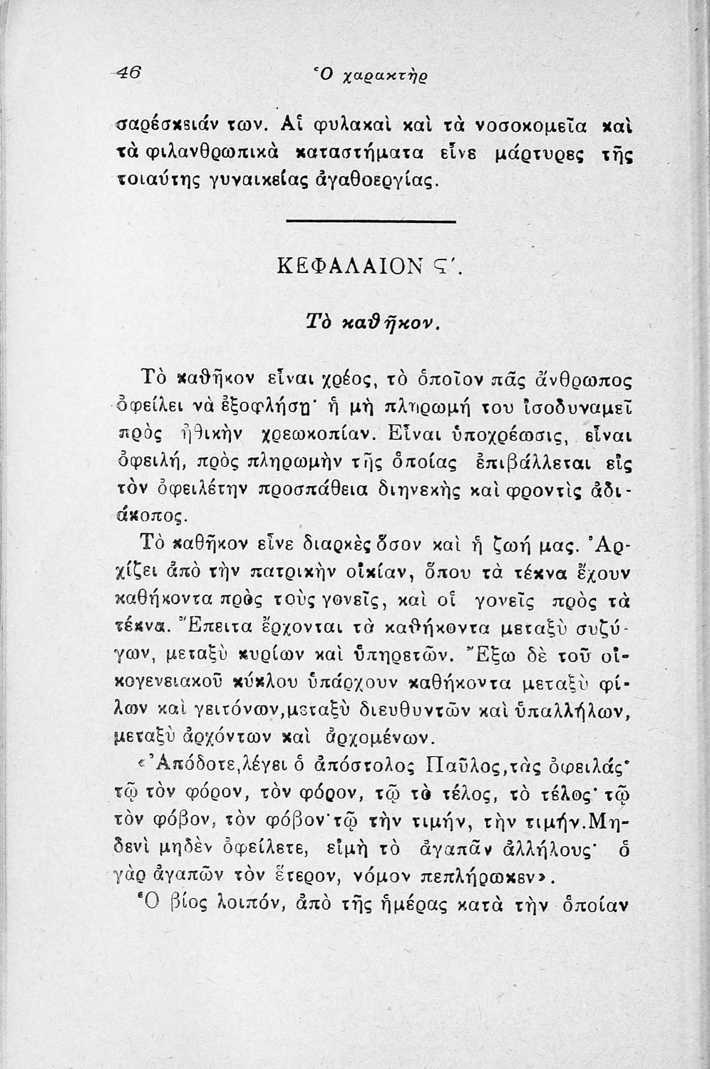 Εγχειρίδιο λαϊκής ψυχολογίας που πραγματεύεται θέματα όπως ο χαρακτήρας, η οικογένεια, η συζυγική ζωή και το καθήκον.