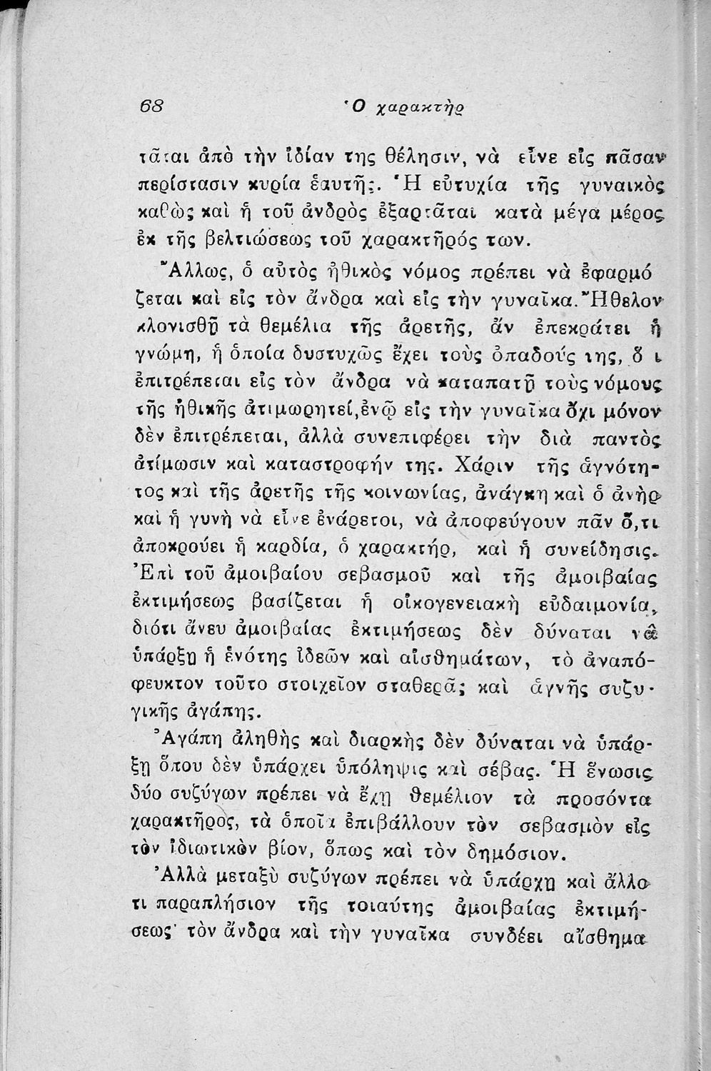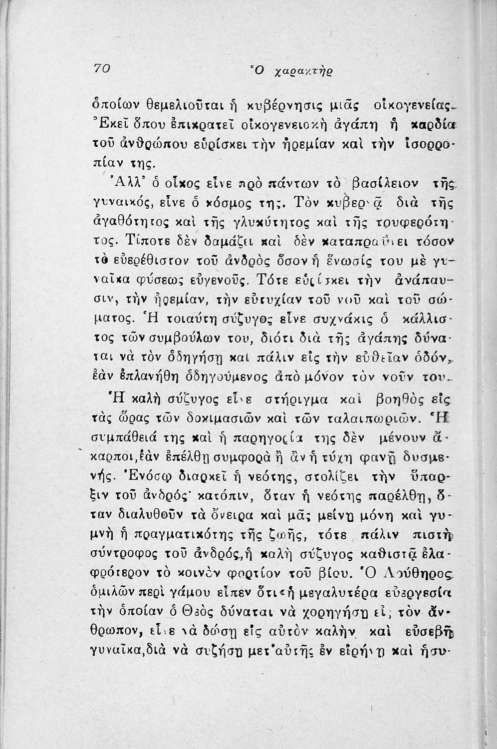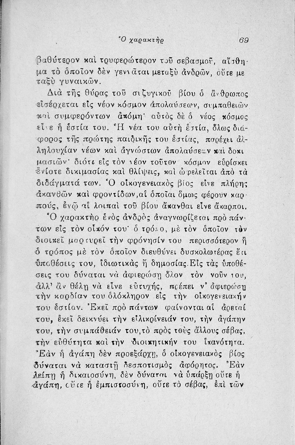Εγχειρίδιο λαϊκής ψυχολογίας που πραγματεύεται θέματα όπως ο χαρακτήρας, η οικογένεια, η συζυγική ζωή και το καθήκον.