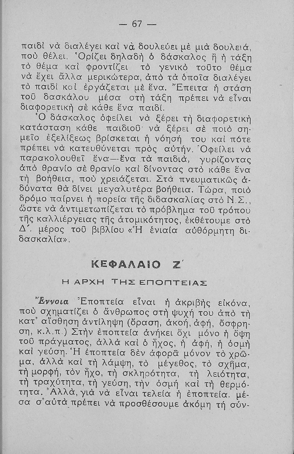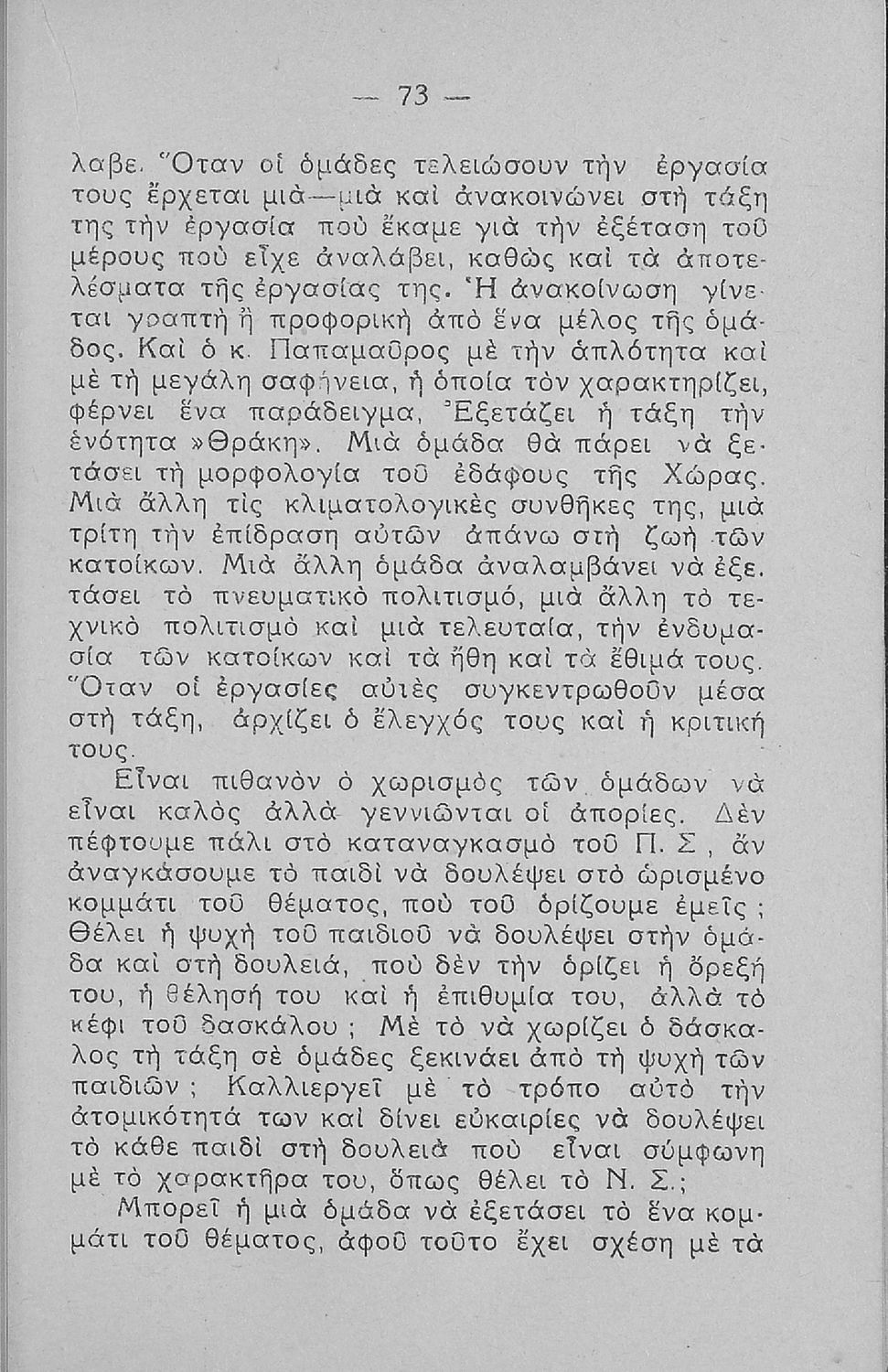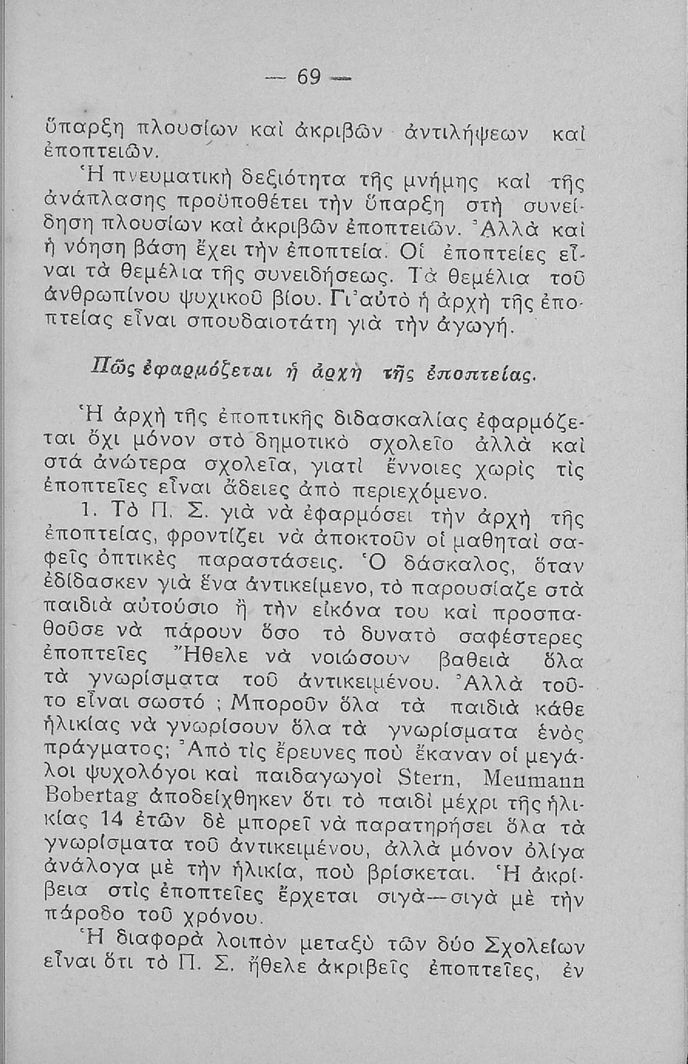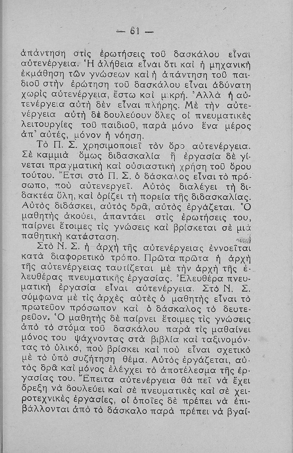 Παιδαγωγικό βοήθημα που απευθύνεται στους δασκάλους και αποτελεί κριτική της ερβαρτιανής παιδαγωγικής από την οπτική της «Νέας Παιδαγωγικής», του «Νέου Σχολείου» ή του «Σχολείου Εργασίας». Ο συγγραφέας ήταν «δημοδιδάσκαλος μετεκπαιδευθείς στο πανεπιστήμιο».