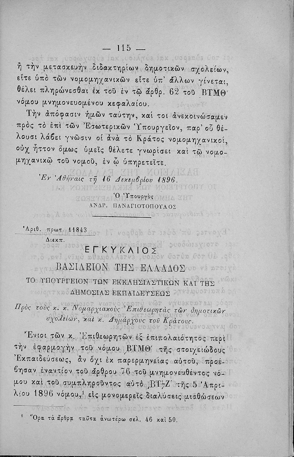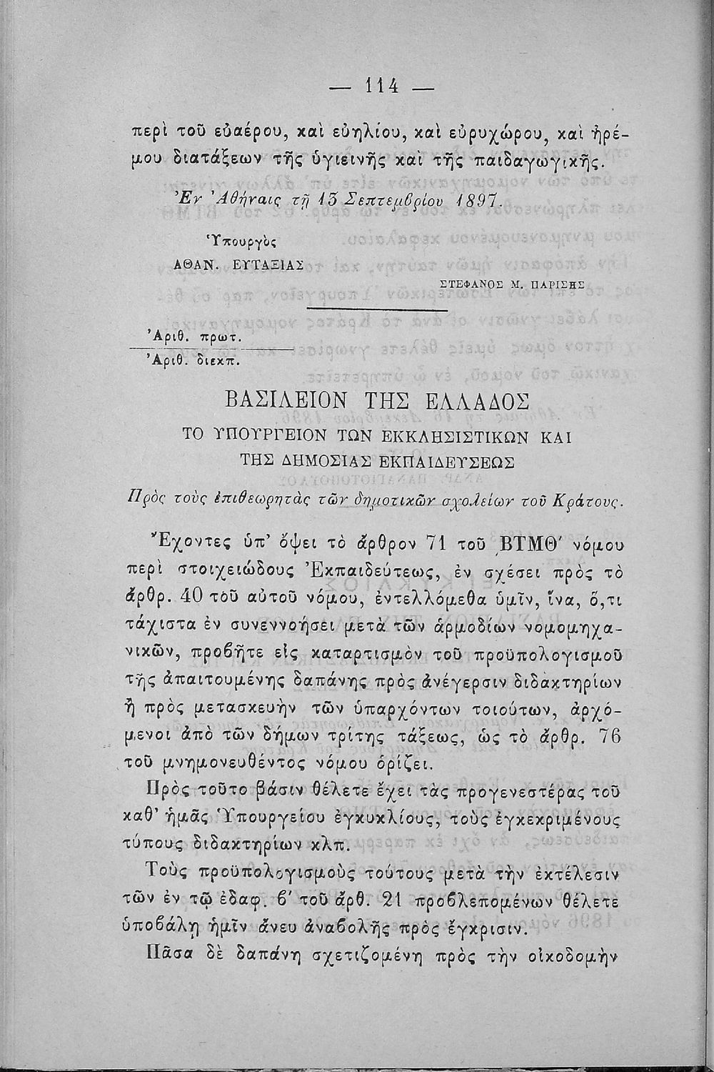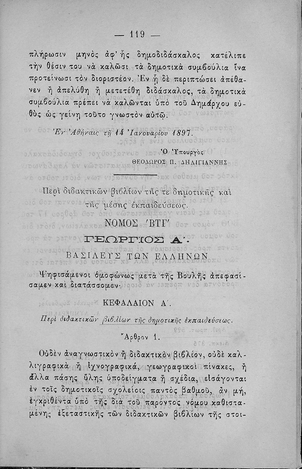 Η νεωτέρα παρ΄ ημίν σχολική νομοθεσία ήτοι συλλογή νόμων βασιλικών διαταγμάτων και υπουργικών εγκυκλίων εις σχολικά ζητήματα αναφερόμενων, τεύχος Α