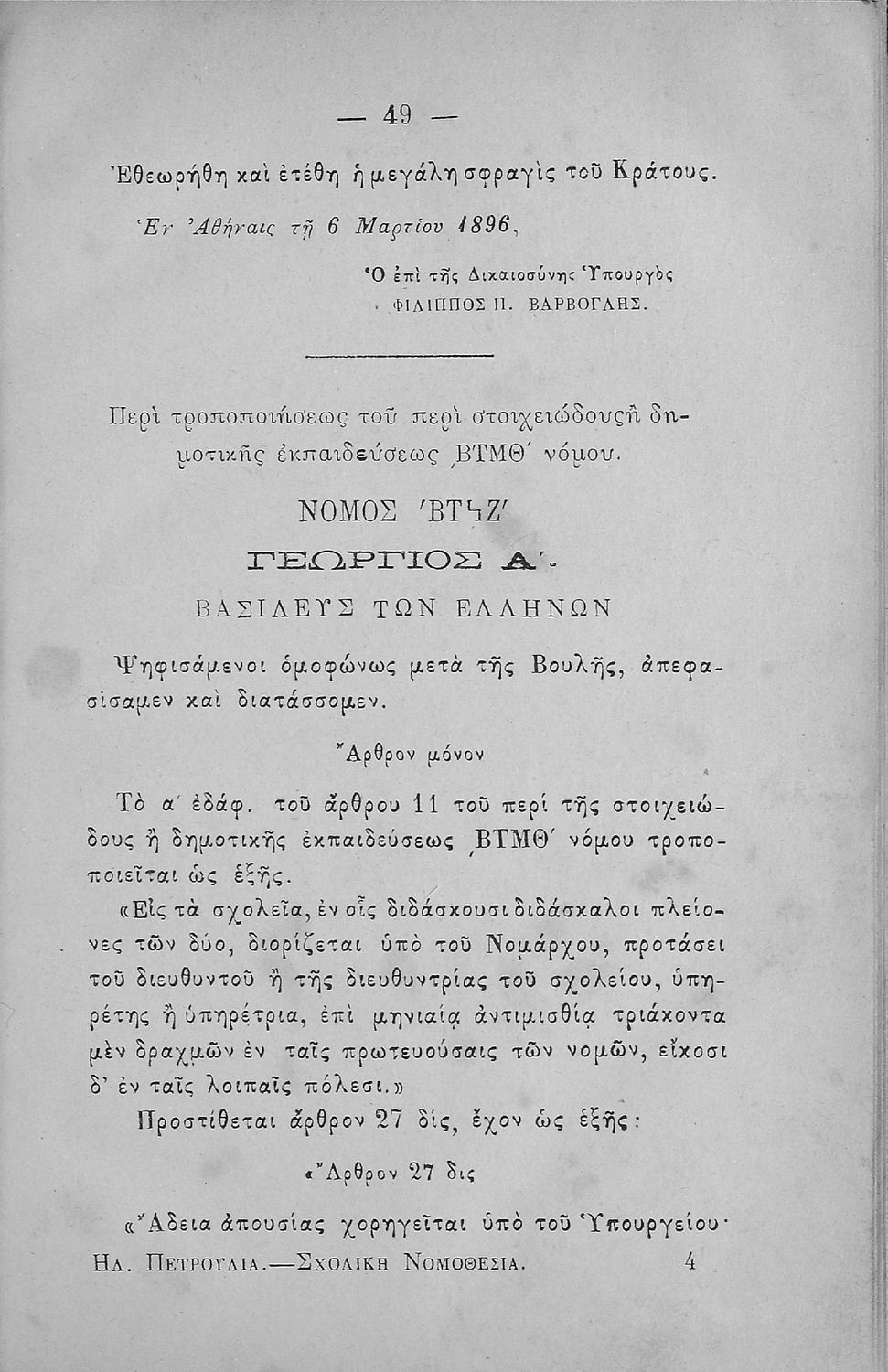 Τίτλος: Η νεωτέρα παρ΄ ημίν σχολική νομοθεσία ήτοι συλλογή νόμων βασιλικών διαταγμάτων και υπουργικών εγκυκλίων εις σχολικά ζητήματα αναφερόμενων, τεύχος Α