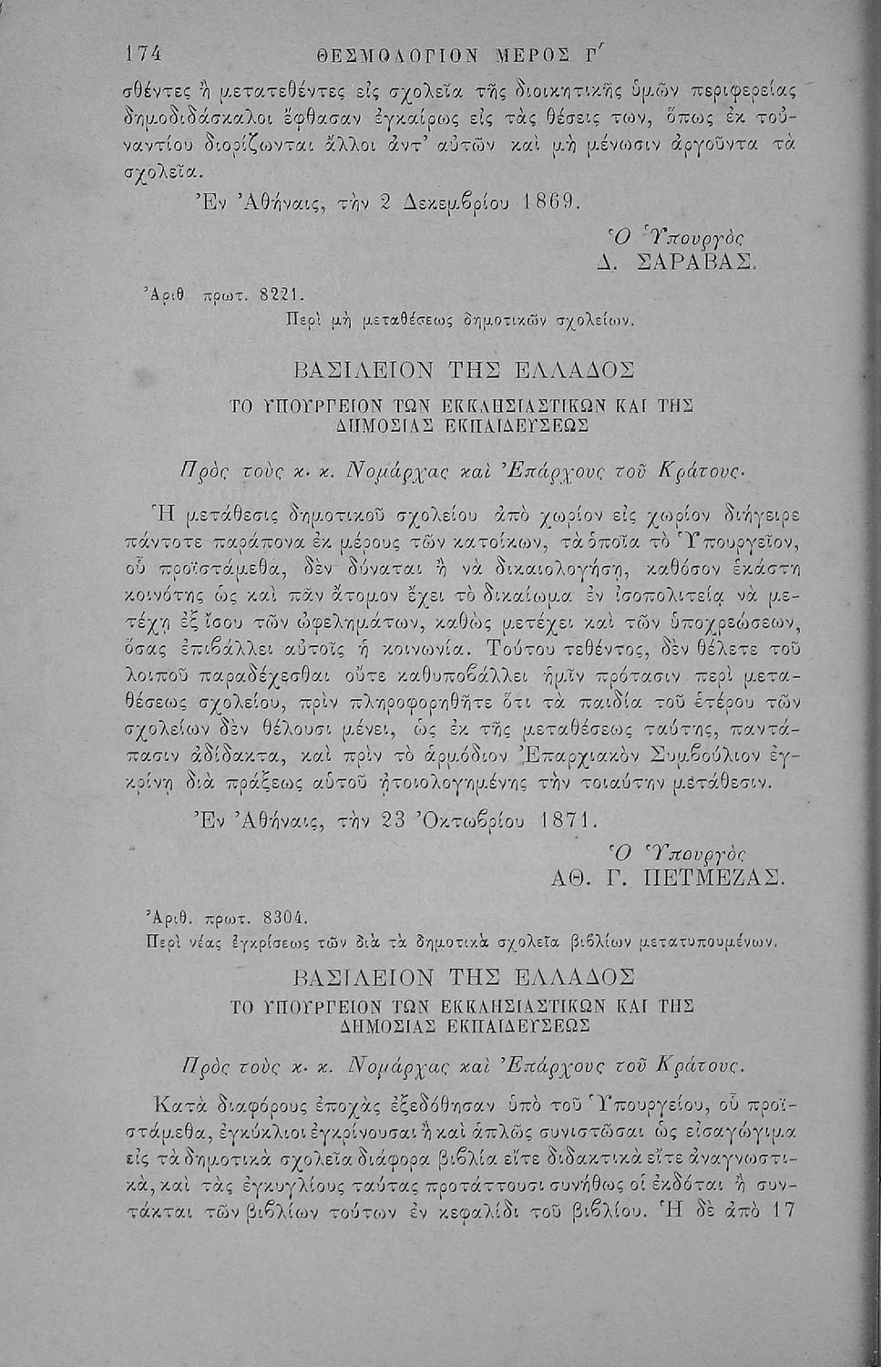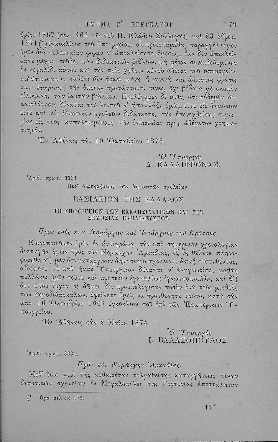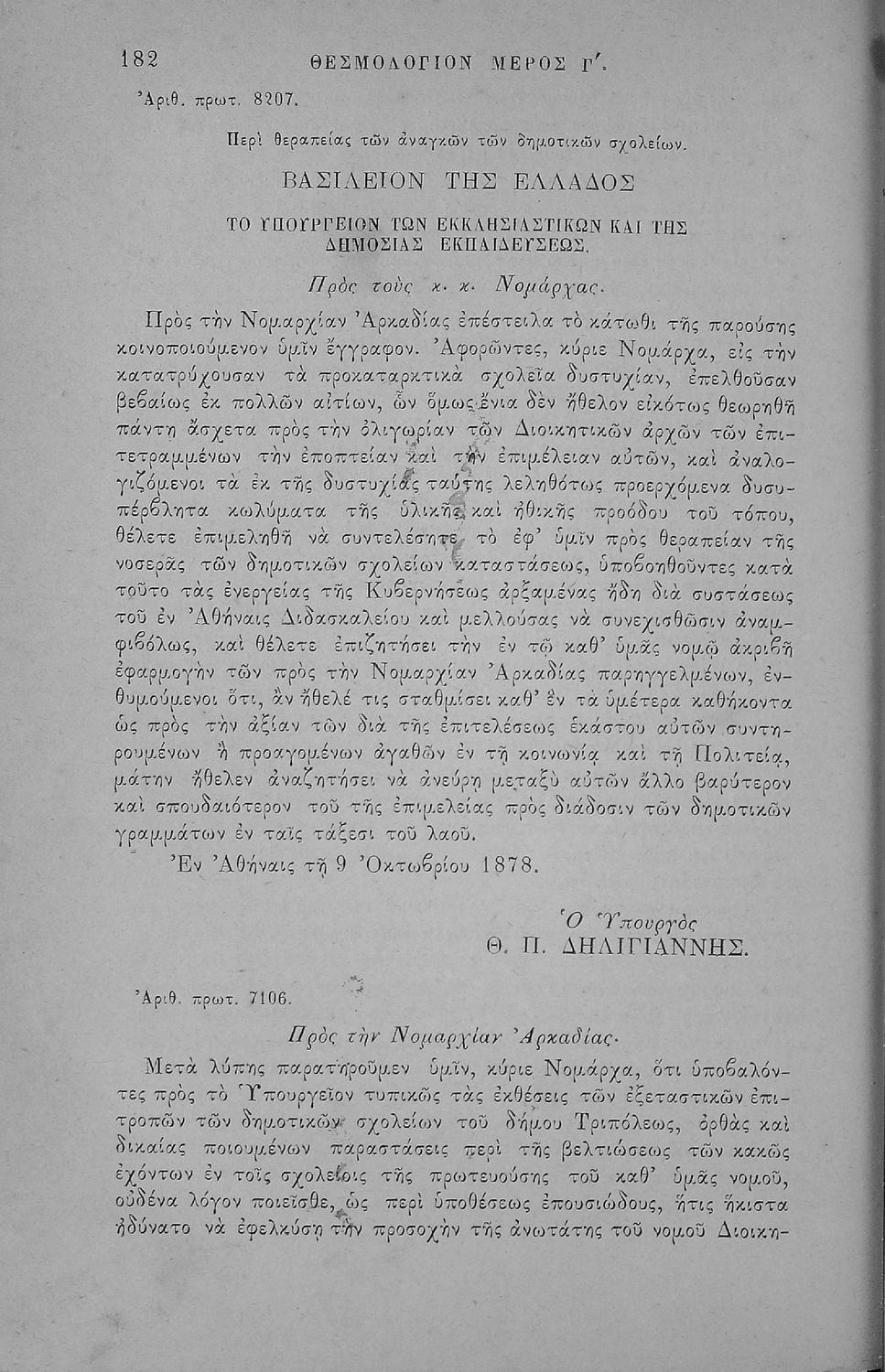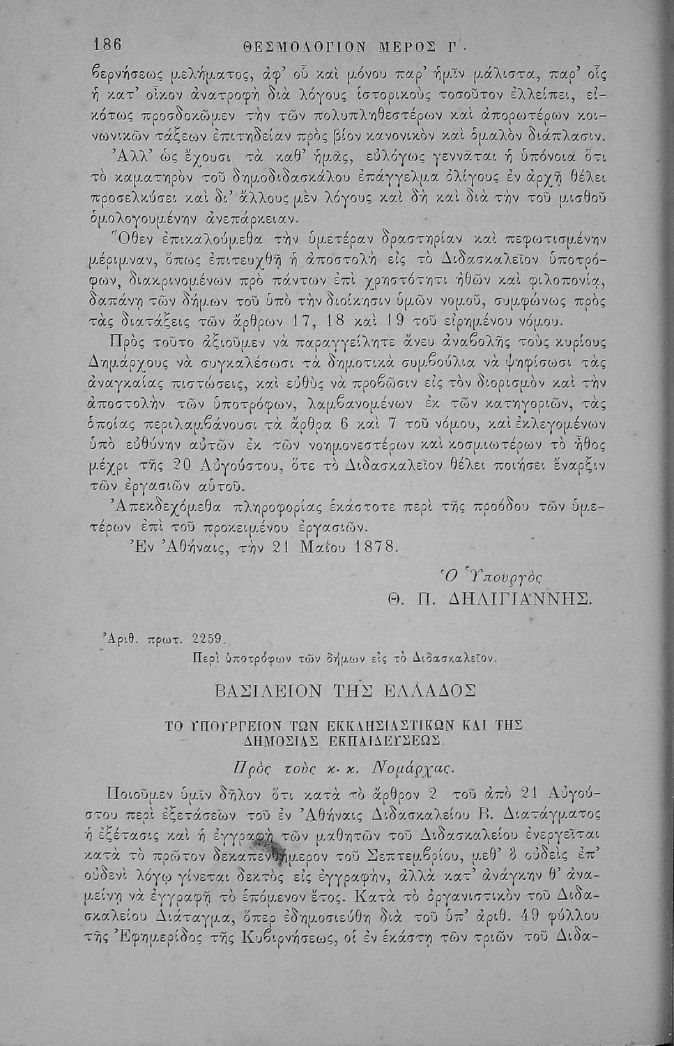 Έκδοση που περιλαμβάνει νόμους, βασιλικά διατάγματα και τις κυριότερες εγκυκλίους της περιόδου 1833-1883 που αφορούν τη Δημοτική Εκπαίδευση και τα Διδασκαλεία καθώς και τα καταστατικά του Διδασκαλικού Μετοχικού Ταμείου και του μετοχικού Ταμείου των πολιτικών Υπαλλήλων. Ο συγγραφέας ήταν Γραμματέας Α’ τάξης του Υπουργείου στο τμήμα Δημοτικής Εκπαίδευσης.