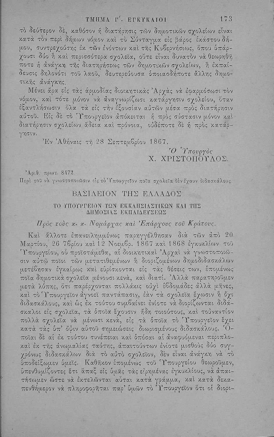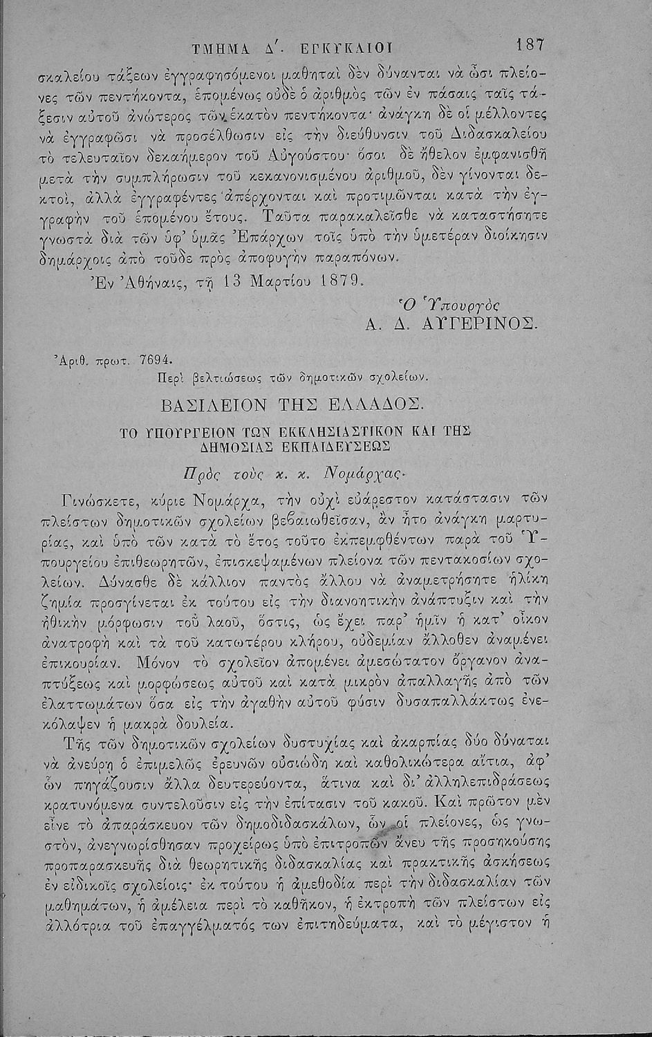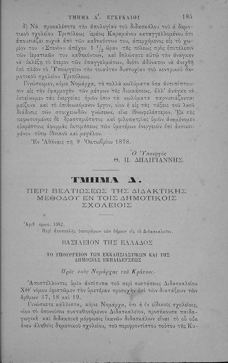 Έκδοση που περιλαμβάνει νόμους, βασιλικά διατάγματα και τις κυριότερες εγκυκλίους της περιόδου 1833-1883 που αφορούν τη Δημοτική Εκπαίδευση και τα Διδασκαλεία καθώς και τα καταστατικά του Διδασκαλικού Μετοχικού Ταμείου και του μετοχικού Ταμείου των πολιτικών Υπαλλήλων. Ο συγγραφέας ήταν Γραμματέας Α’ τάξης του Υπουργείου στο τμήμα Δημοτικής Εκπαίδευσης.