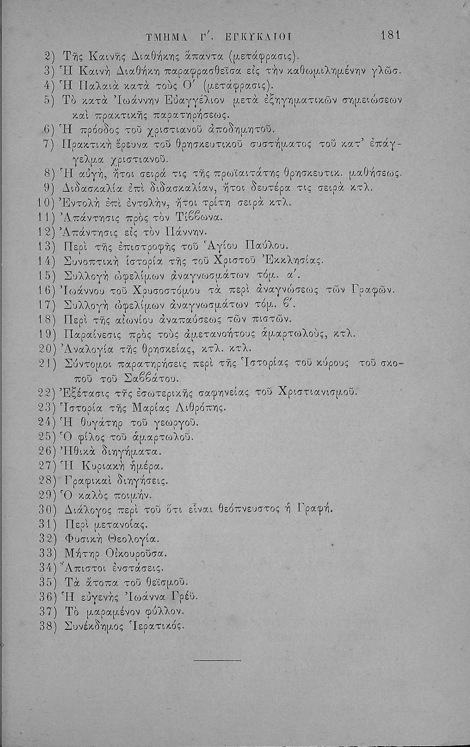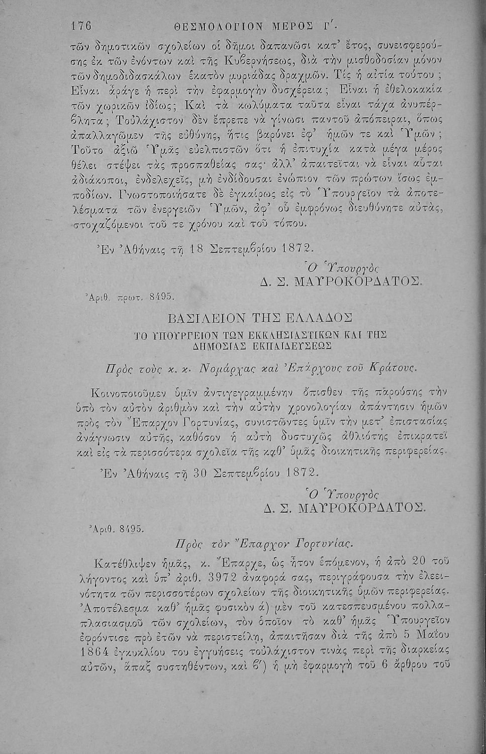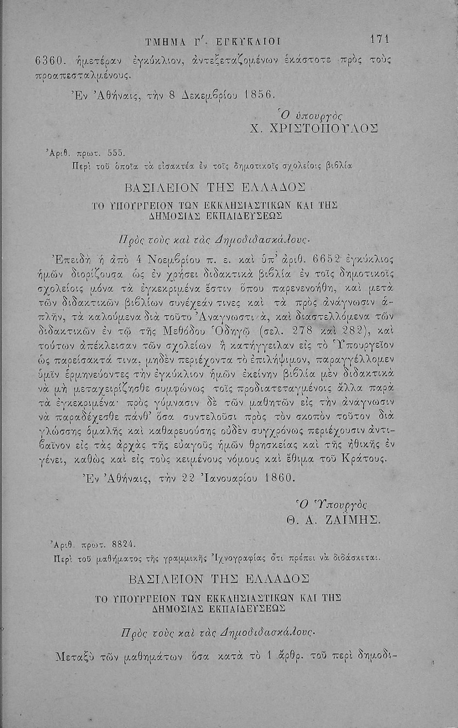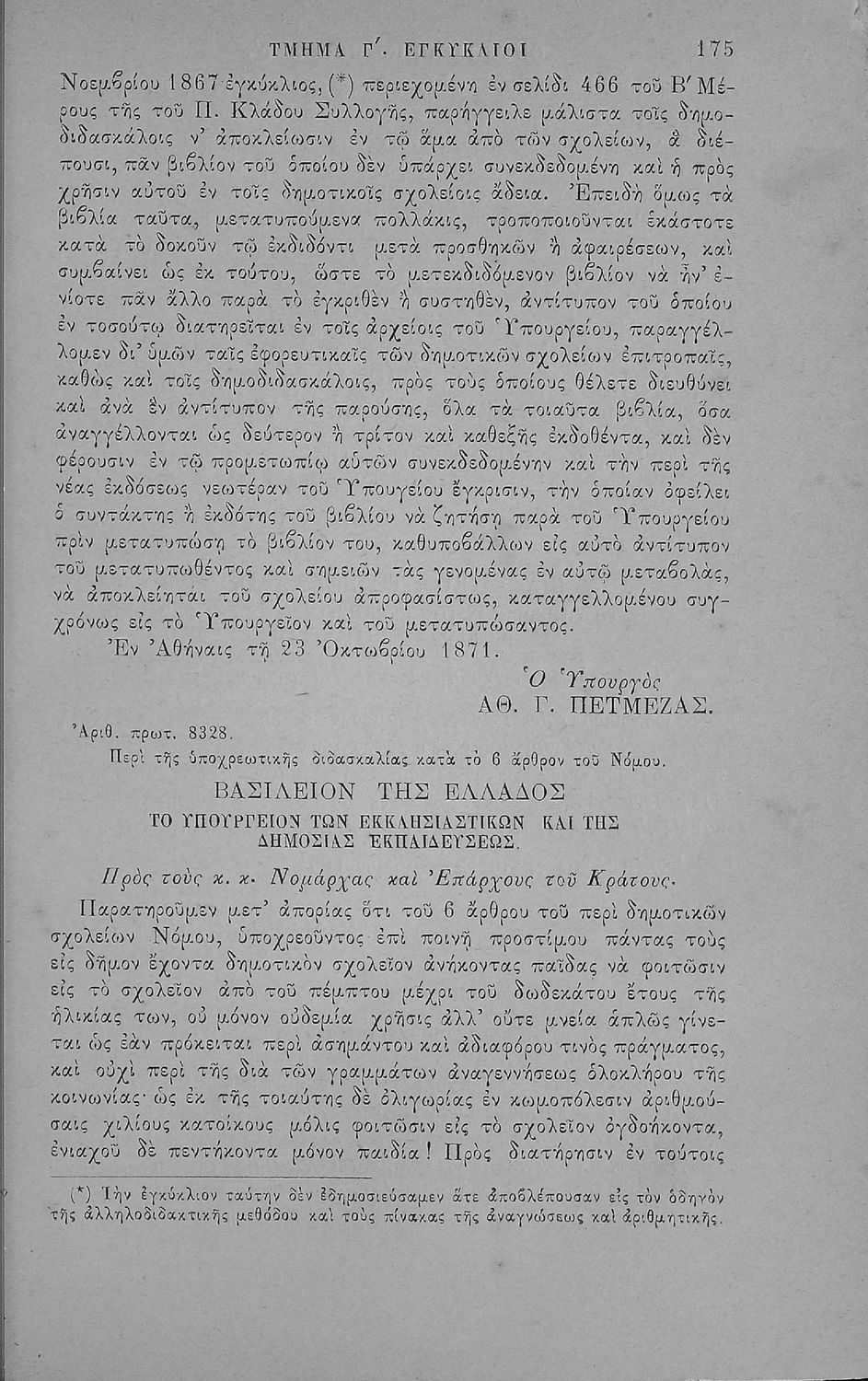 Έκδοση που περιλαμβάνει νόμους, βασιλικά διατάγματα και τις κυριότερες εγκυκλίους της περιόδου 1833-1883 που αφορούν τη Δημοτική Εκπαίδευση και τα Διδασκαλεία καθώς και τα καταστατικά του Διδασκαλικού Μετοχικού Ταμείου και του μετοχικού Ταμείου των πολιτικών Υπαλλήλων. Ο συγγραφέας ήταν Γραμματέας Α’ τάξης του Υπουργείου στο τμήμα Δημοτικής Εκπαίδευσης.