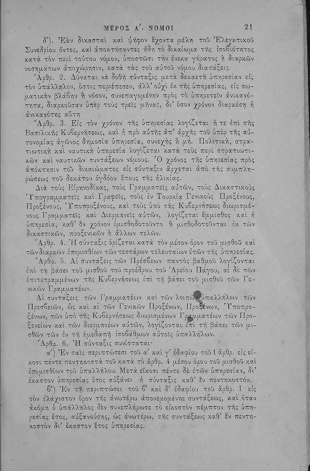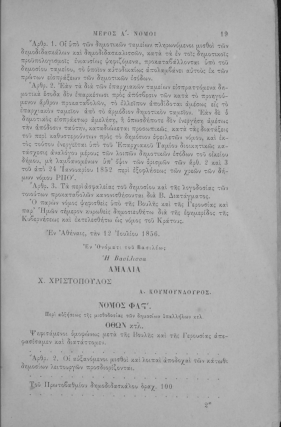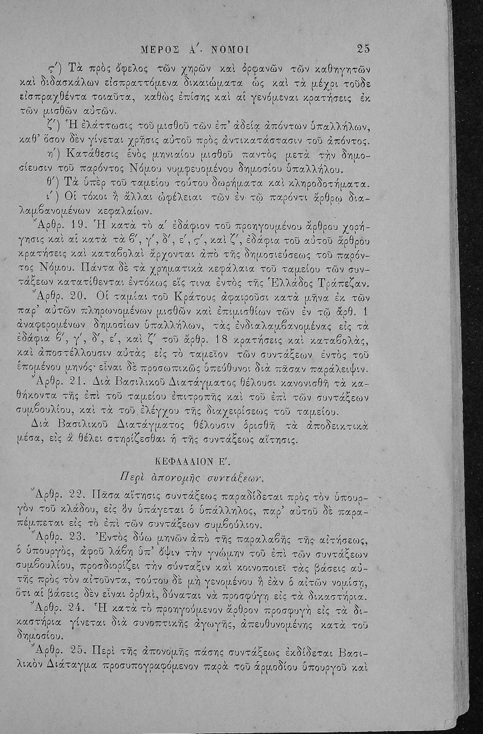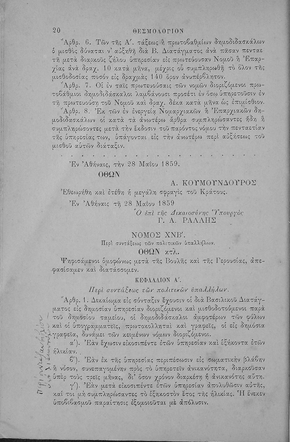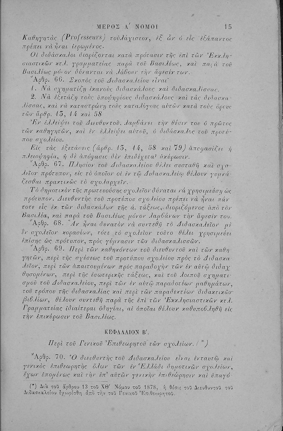 Έκδοση που περιλαμβάνει νόμους, βασιλικά διατάγματα και τις κυριότερες εγκυκλίους της περιόδου 1833-1883 που αφορούν τη Δημοτική Εκπαίδευση και τα Διδασκαλεία καθώς και τα καταστατικά του Διδασκαλικού Μετοχικού Ταμείου και του μετοχικού Ταμείου των πολιτικών Υπαλλήλων. Ο συγγραφέας ήταν Γραμματέας Α’ τάξης του Υπουργείου στο τμήμα Δημοτικής Εκπαίδευσης.