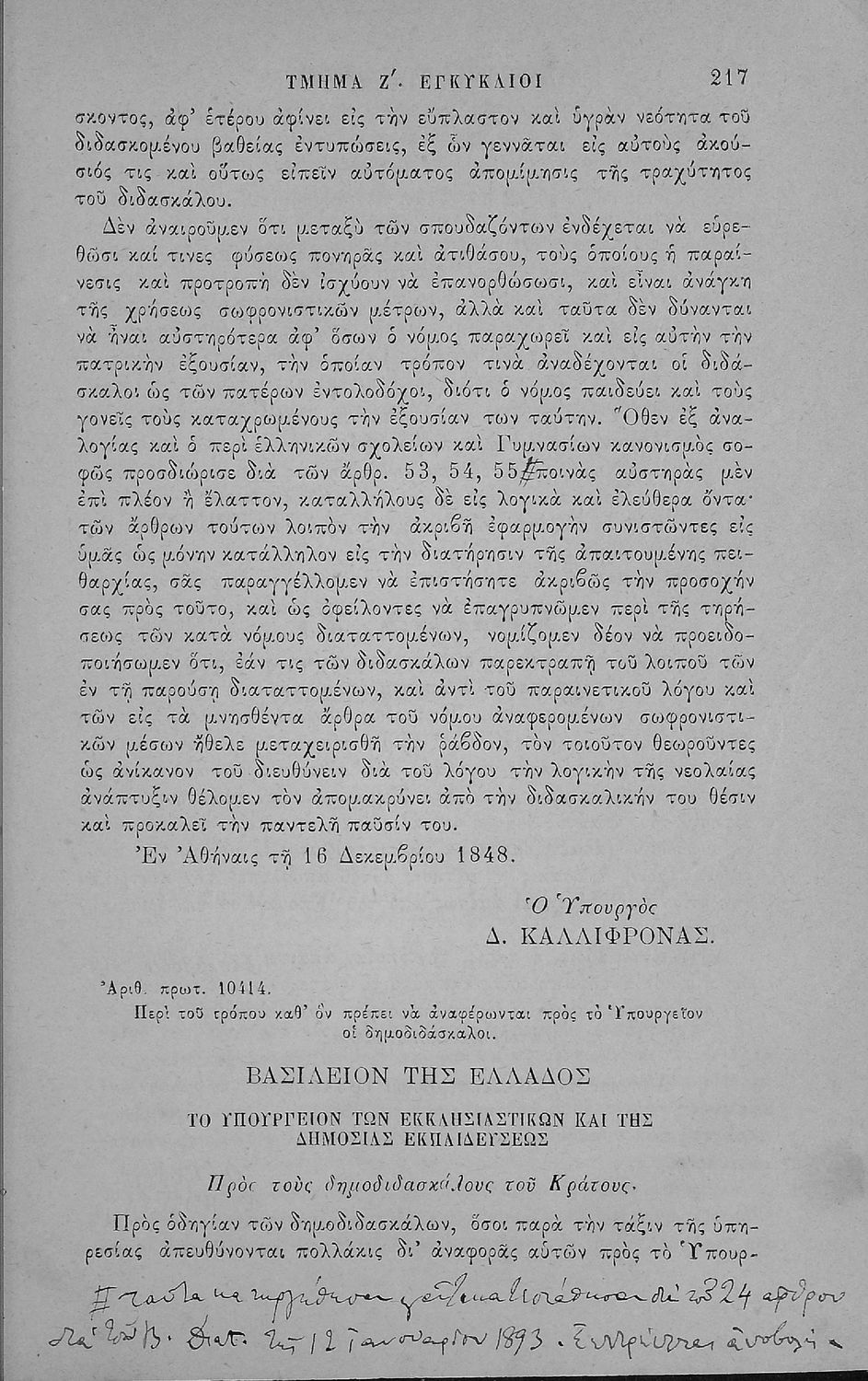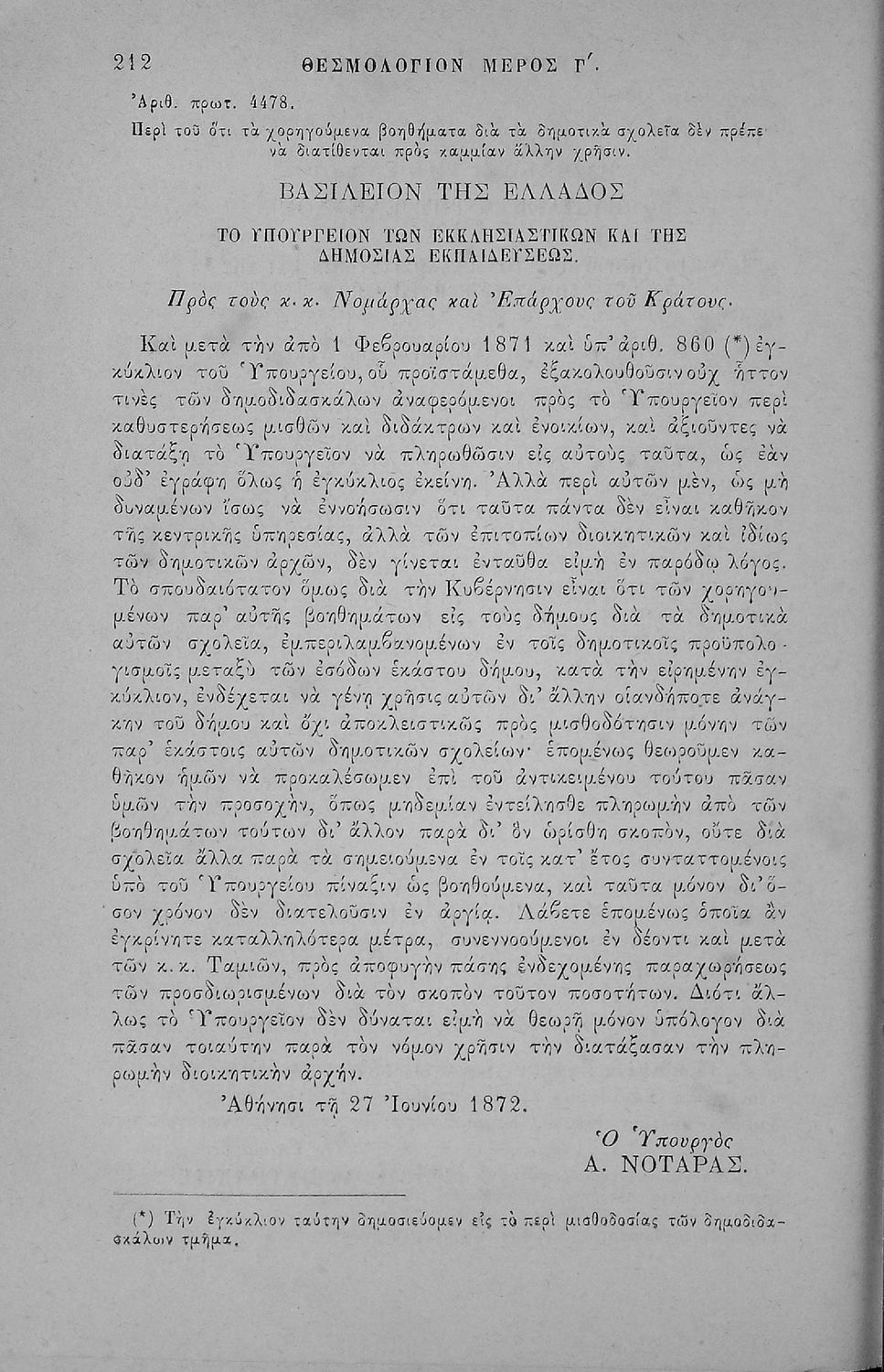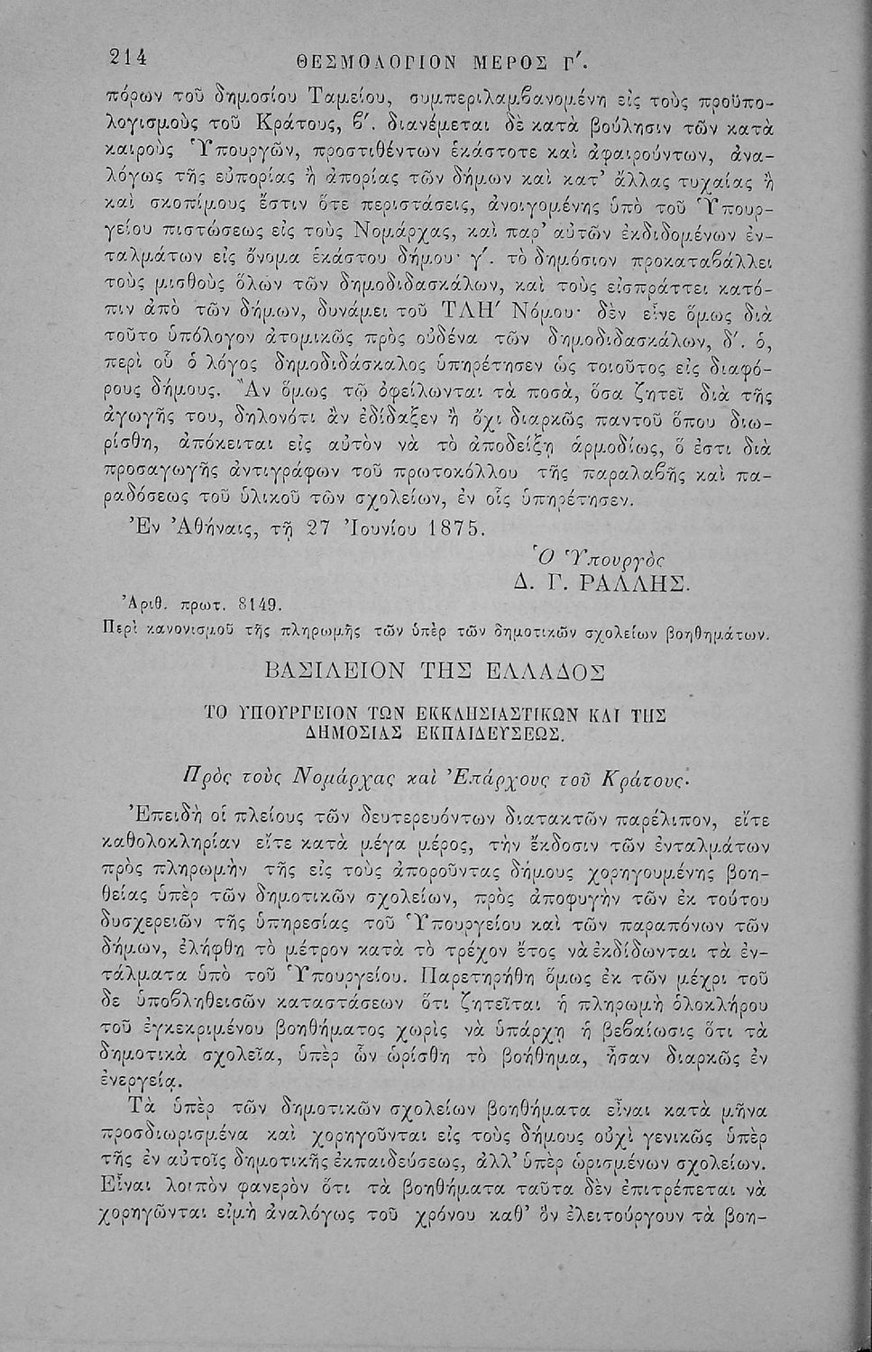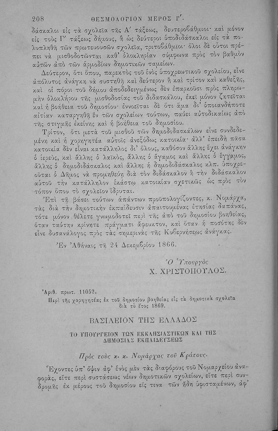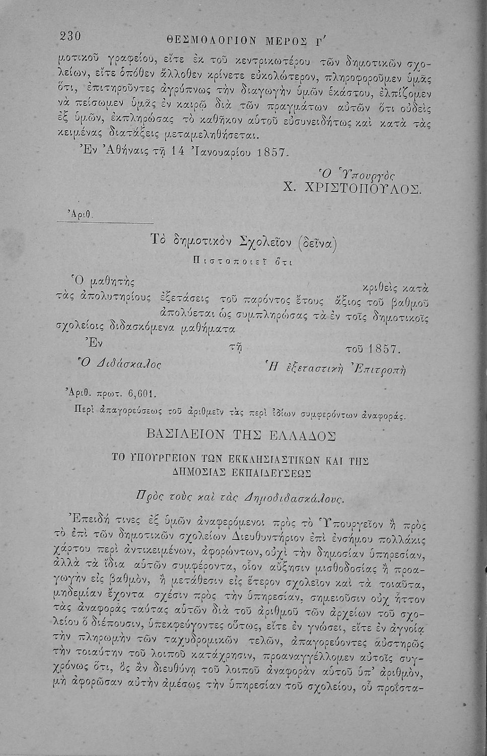 Έκδοση που περιλαμβάνει νόμους, βασιλικά διατάγματα και τις κυριότερες εγκυκλίους της περιόδου 1833-1883 που αφορούν τη Δημοτική Εκπαίδευση και τα Διδασκαλεία καθώς και τα καταστατικά του Διδασκαλικού Μετοχικού Ταμείου και του μετοχικού Ταμείου των πολιτικών Υπαλλήλων. Ο συγγραφέας ήταν Γραμματέας Α’ τάξης του Υπουργείου στο τμήμα Δημοτικής Εκπαίδευσης.