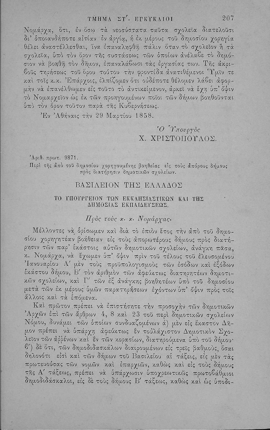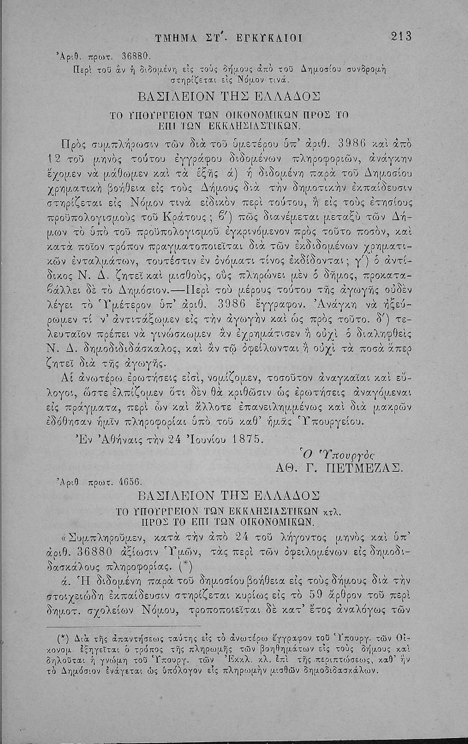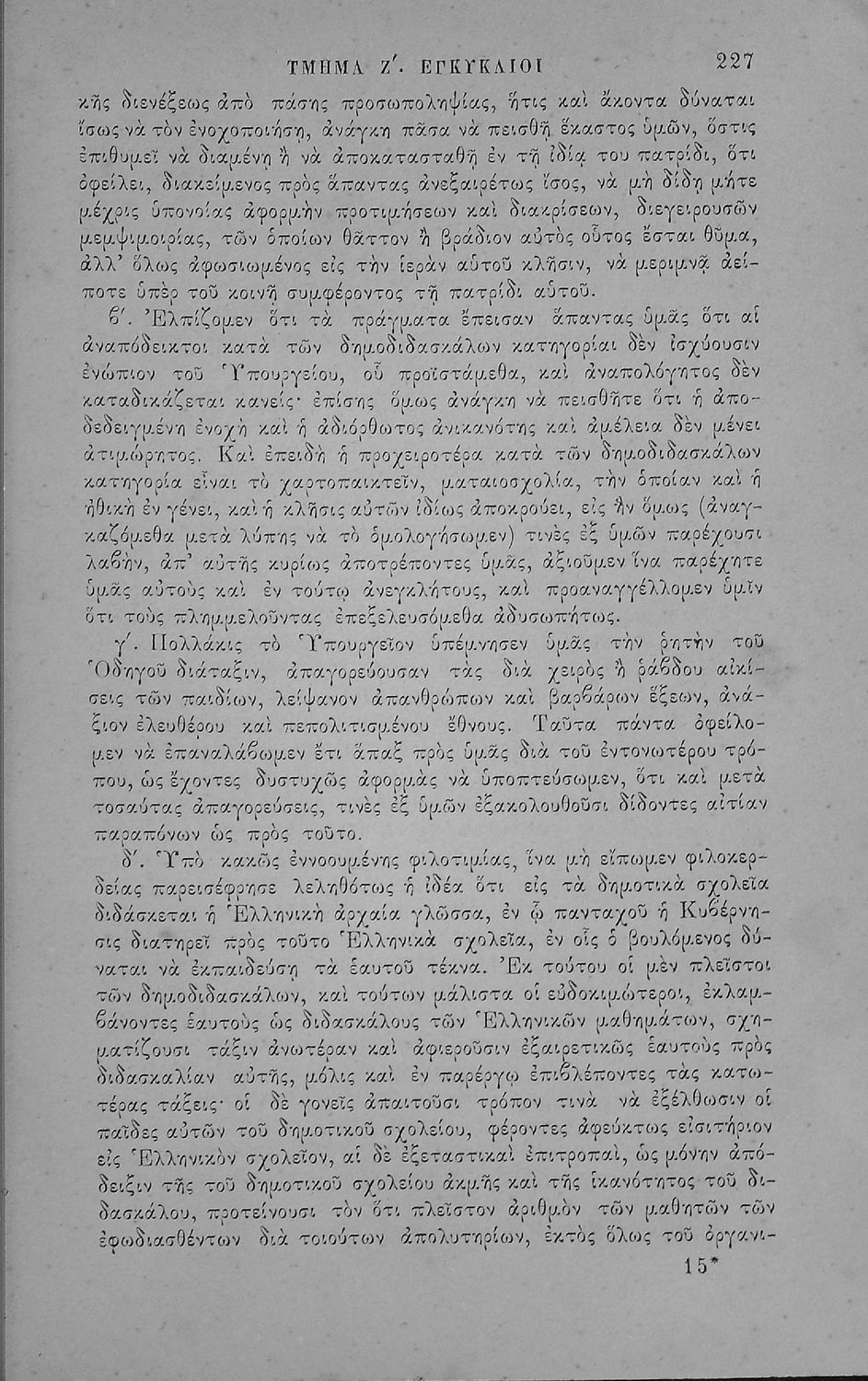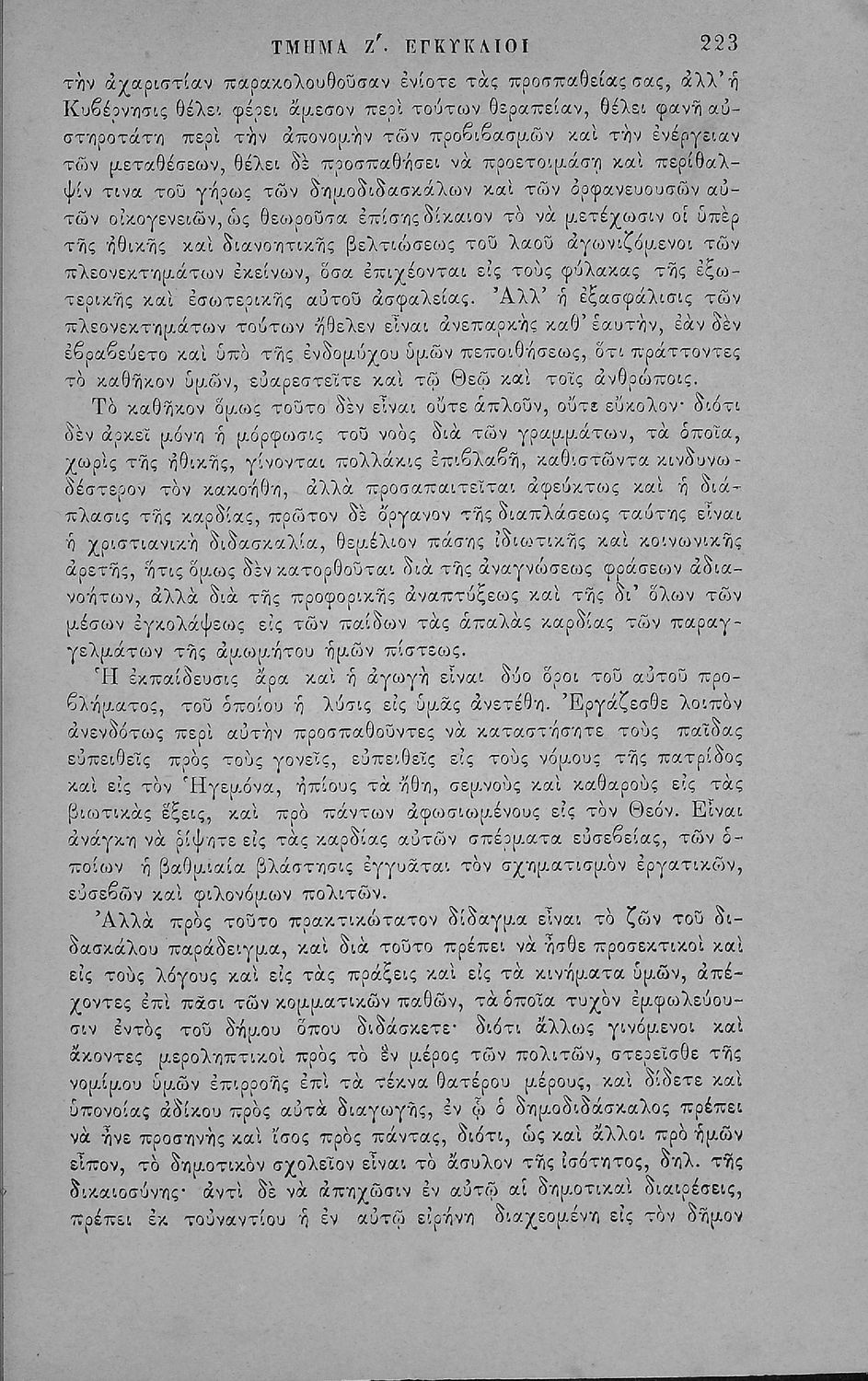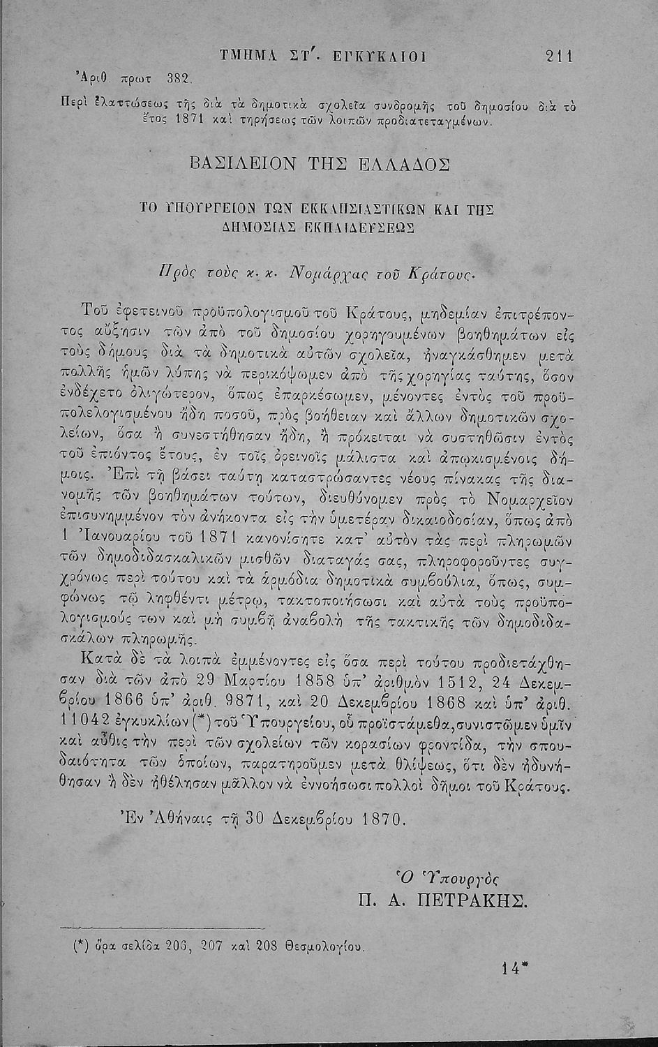 Έκδοση που περιλαμβάνει νόμους, βασιλικά διατάγματα και τις κυριότερες εγκυκλίους της περιόδου 1833-1883 που αφορούν τη Δημοτική Εκπαίδευση και τα Διδασκαλεία καθώς και τα καταστατικά του Διδασκαλικού Μετοχικού Ταμείου και του μετοχικού Ταμείου των πολιτικών Υπαλλήλων. Ο συγγραφέας ήταν Γραμματέας Α’ τάξης του Υπουργείου στο τμήμα Δημοτικής Εκπαίδευσης.