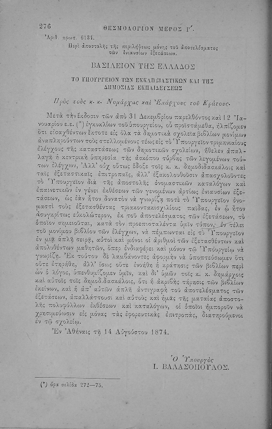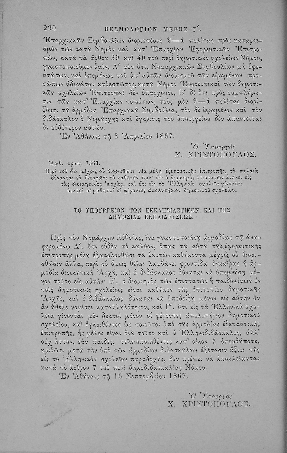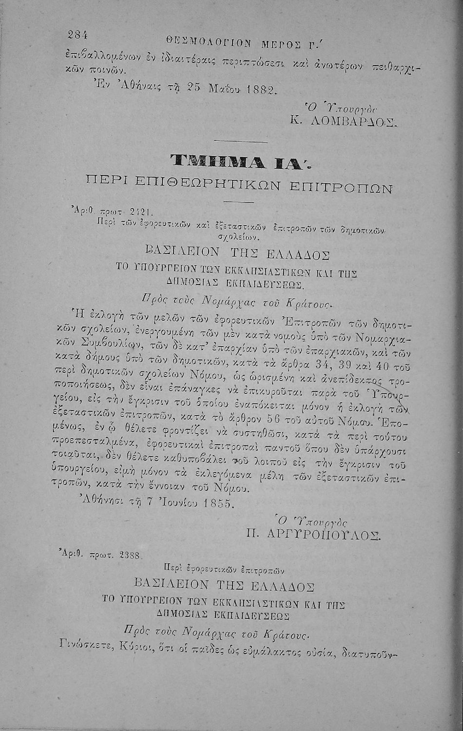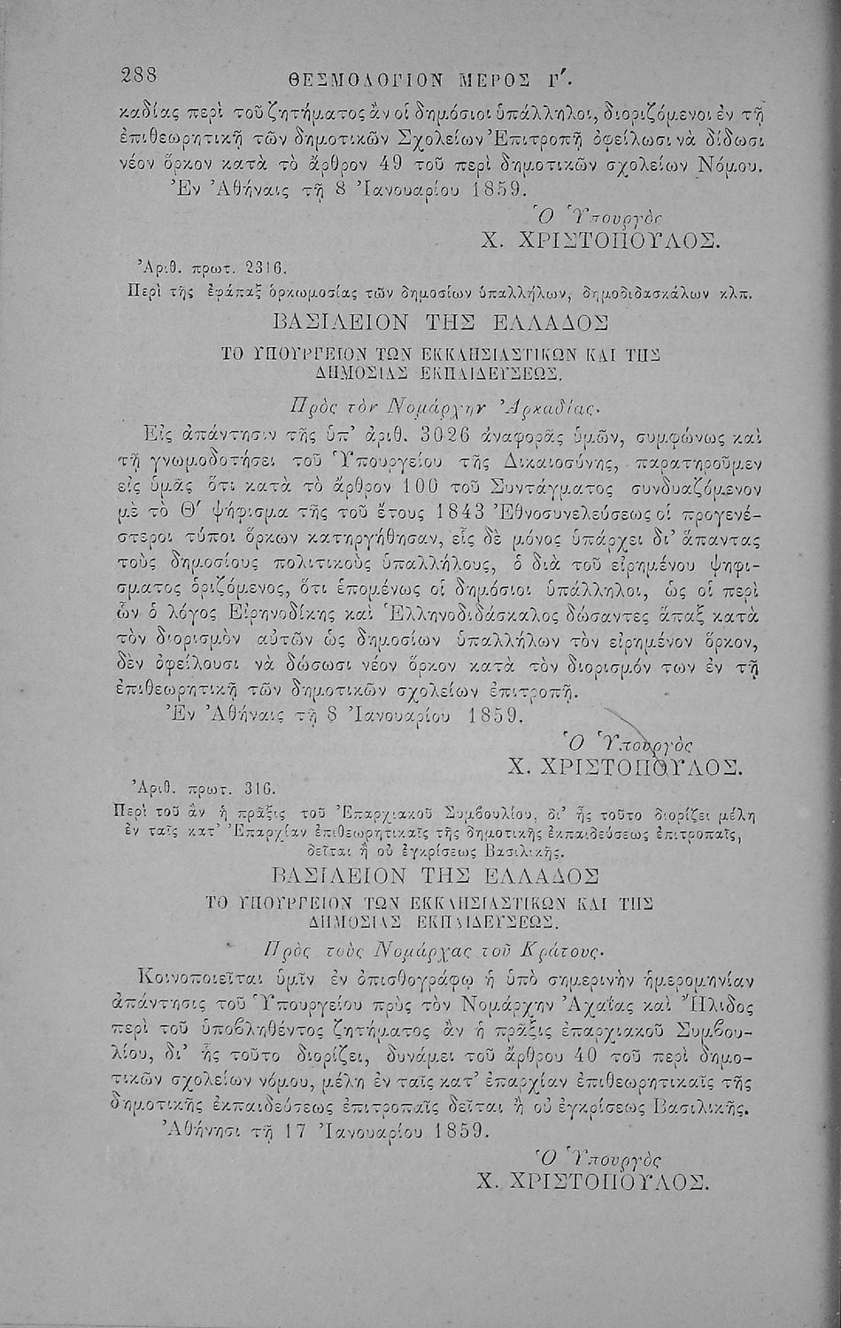 Έκδοση που περιλαμβάνει νόμους, βασιλικά διατάγματα και τις κυριότερες εγκυκλίους της περιόδου 1833-1883 που αφορούν τη Δημοτική Εκπαίδευση και τα Διδασκαλεία καθώς και τα καταστατικά του Διδασκαλικού Μετοχικού Ταμείου και του μετοχικού Ταμείου των πολιτικών Υπαλλήλων. Ο συγγραφέας ήταν Γραμματέας Α’ τάξης του Υπουργείου στο τμήμα Δημοτικής Εκπαίδευσης.