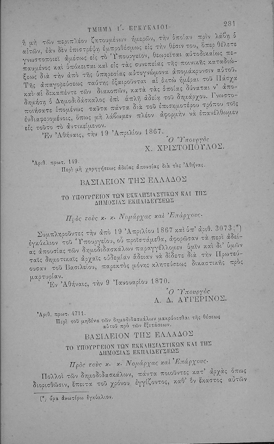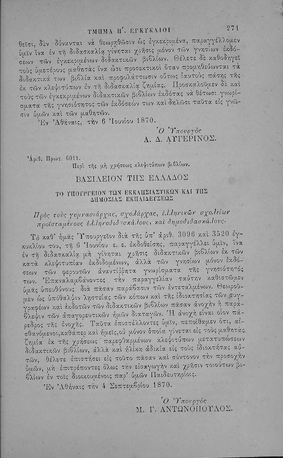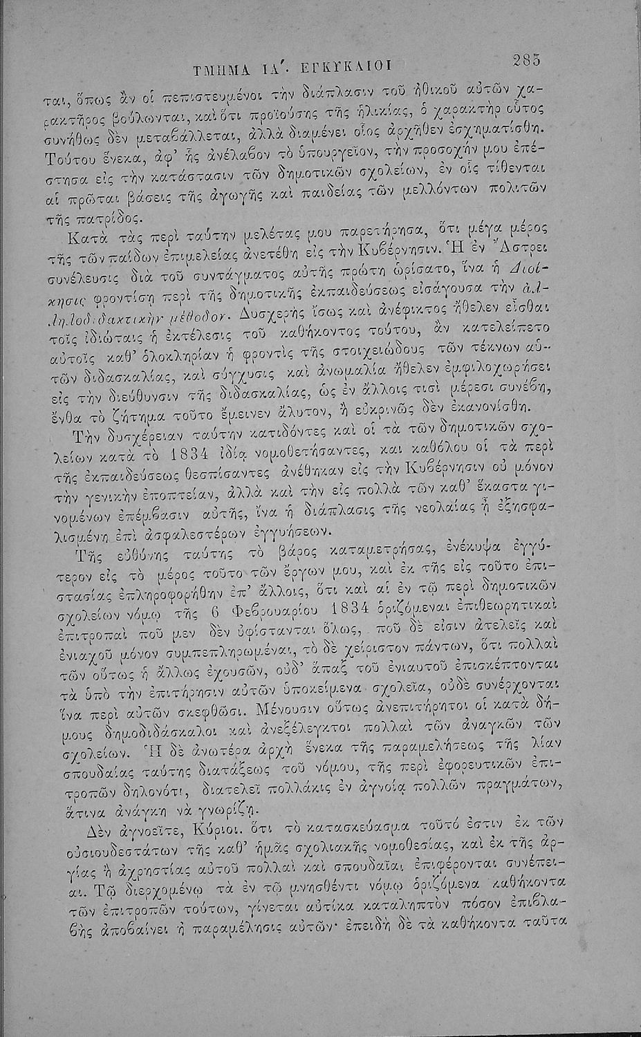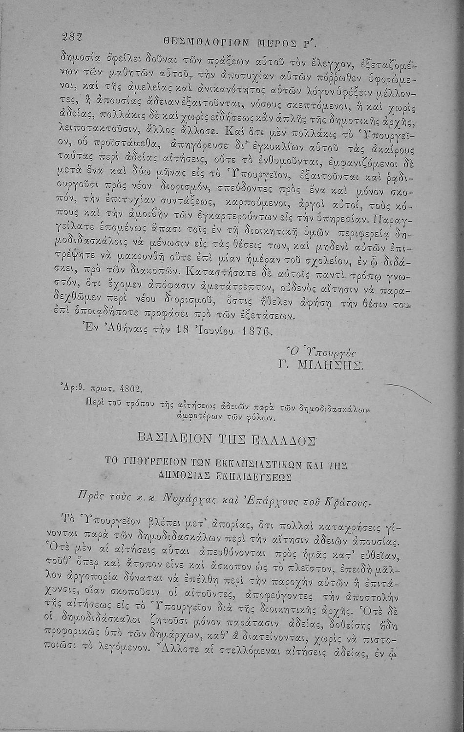 Έκδοση που περιλαμβάνει νόμους, βασιλικά διατάγματα και τις κυριότερες εγκυκλίους της περιόδου 1833-1883 που αφορούν τη Δημοτική Εκπαίδευση και τα Διδασκαλεία καθώς και τα καταστατικά του Διδασκαλικού Μετοχικού Ταμείου και του μετοχικού Ταμείου των πολιτικών Υπαλλήλων. Ο συγγραφέας ήταν Γραμματέας Α’ τάξης του Υπουργείου στο τμήμα Δημοτικής Εκπαίδευσης.
