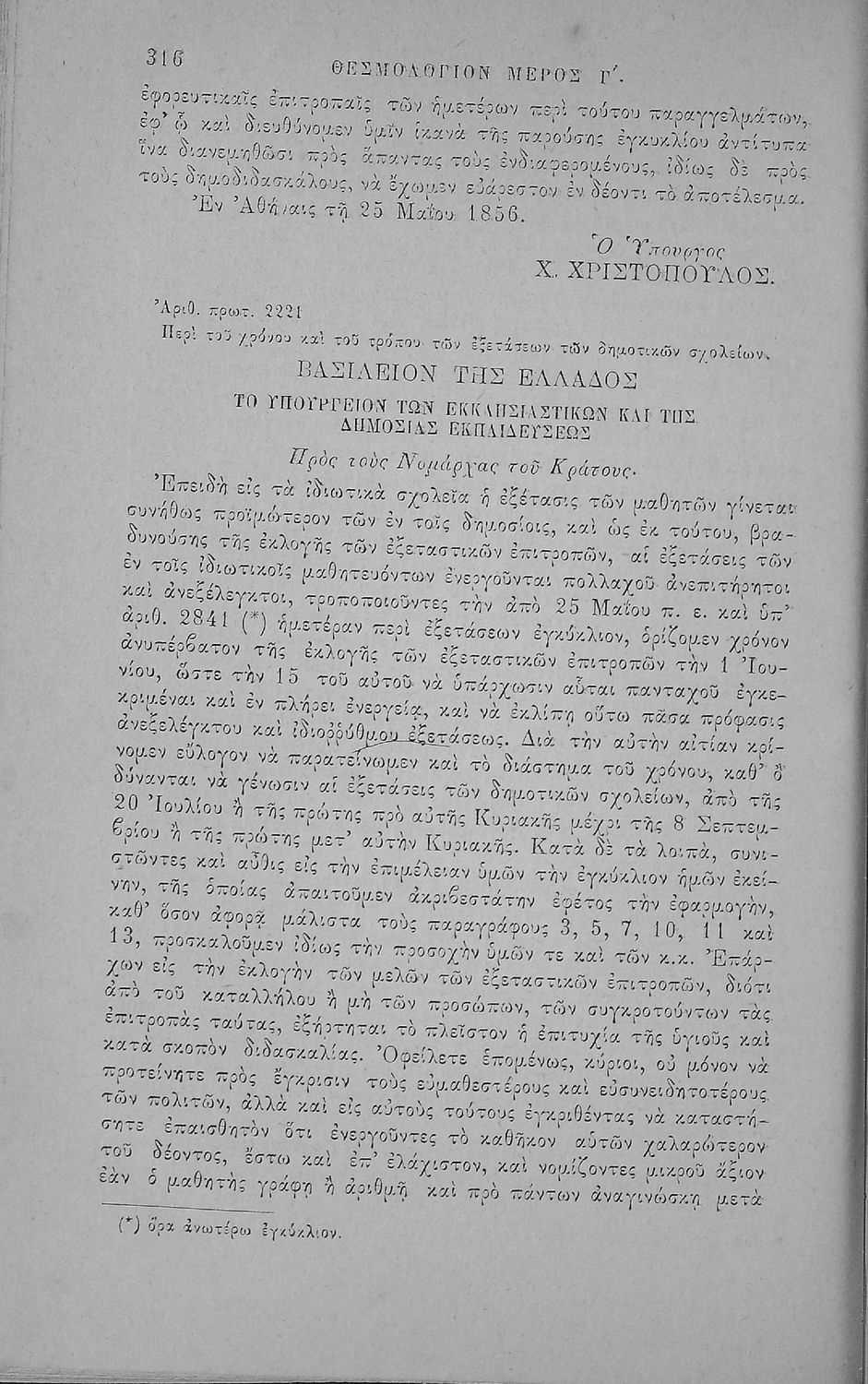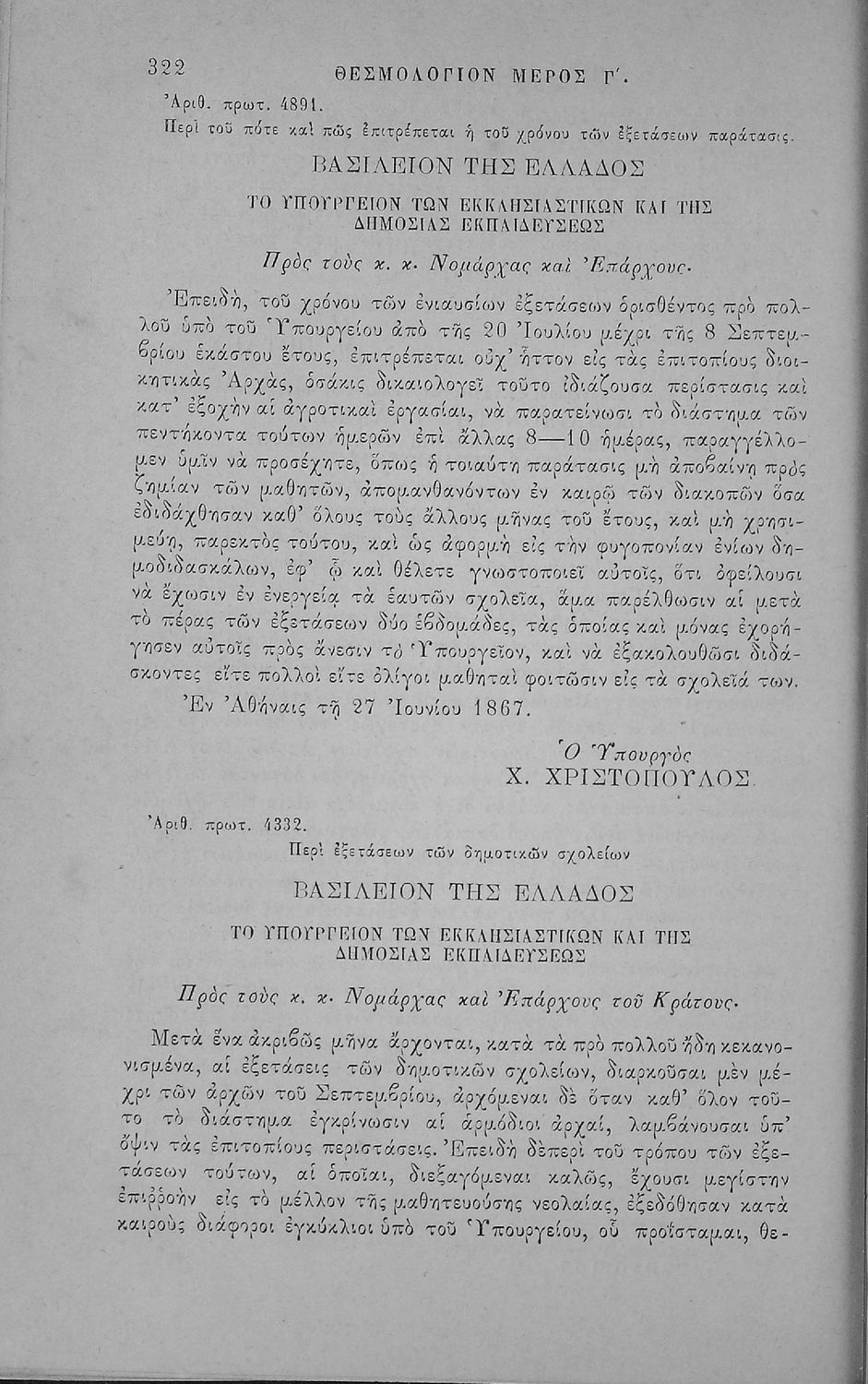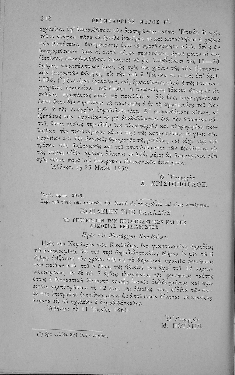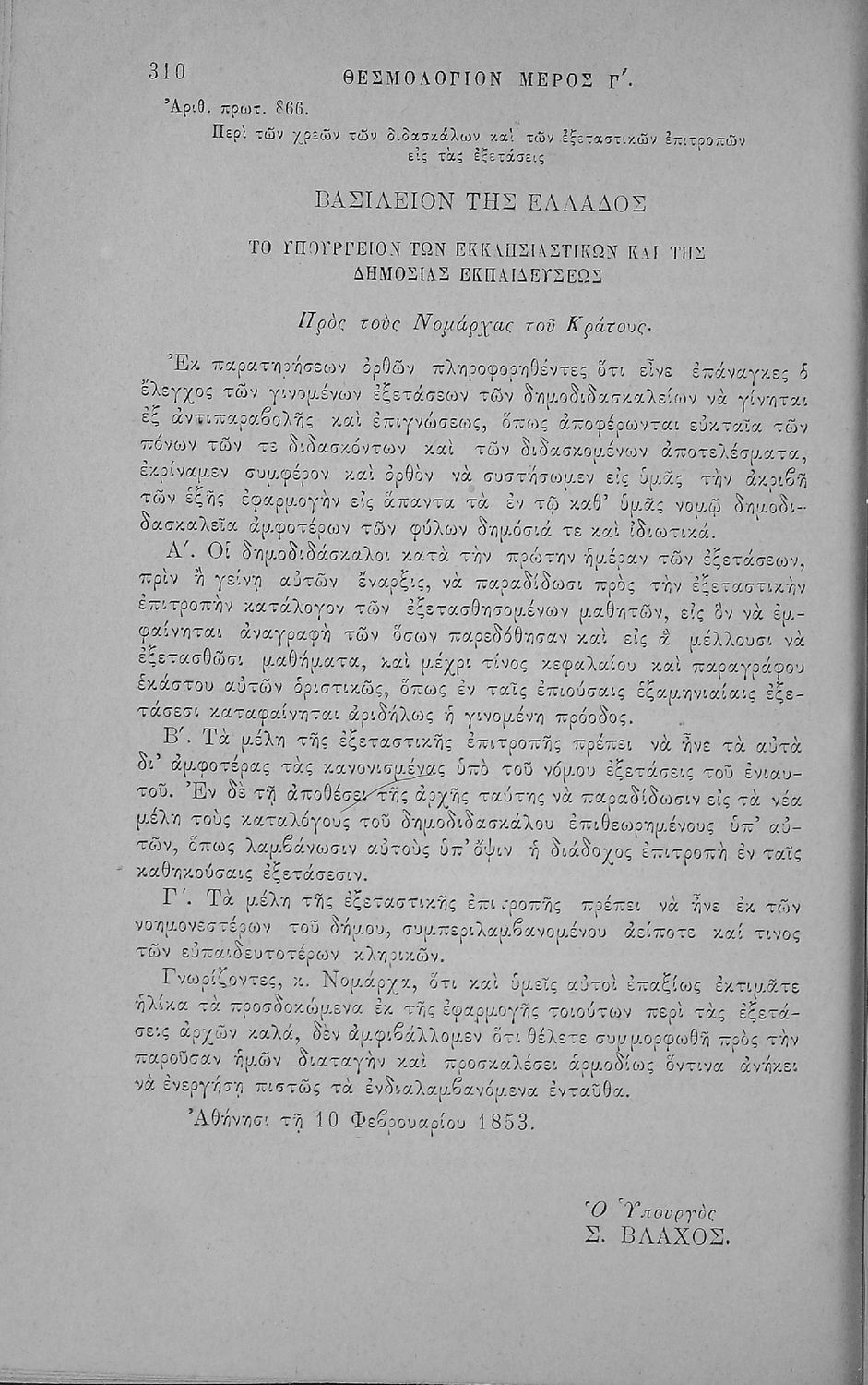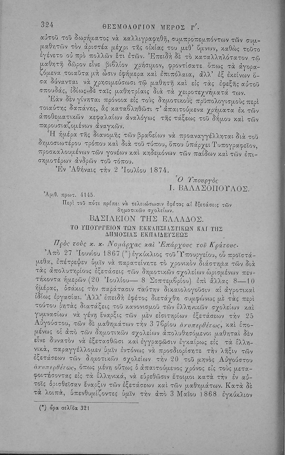 Έκδοση που περιλαμβάνει νόμους, βασιλικά διατάγματα και τις κυριότερες εγκυκλίους της περιόδου 1833-1883 που αφορούν τη Δημοτική Εκπαίδευση και τα Διδασκαλεία καθώς και τα καταστατικά του Διδασκαλικού Μετοχικού Ταμείου και του μετοχικού Ταμείου των πολιτικών Υπαλλήλων. Ο συγγραφέας ήταν Γραμματέας Α’ τάξης του Υπουργείου στο τμήμα Δημοτικής Εκπαίδευσης.