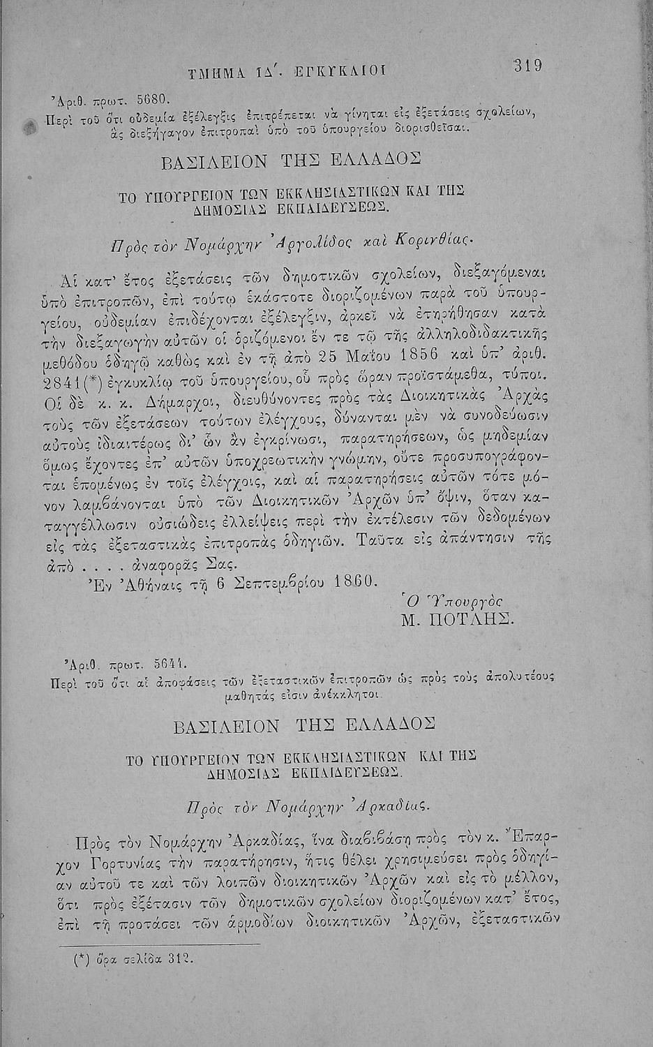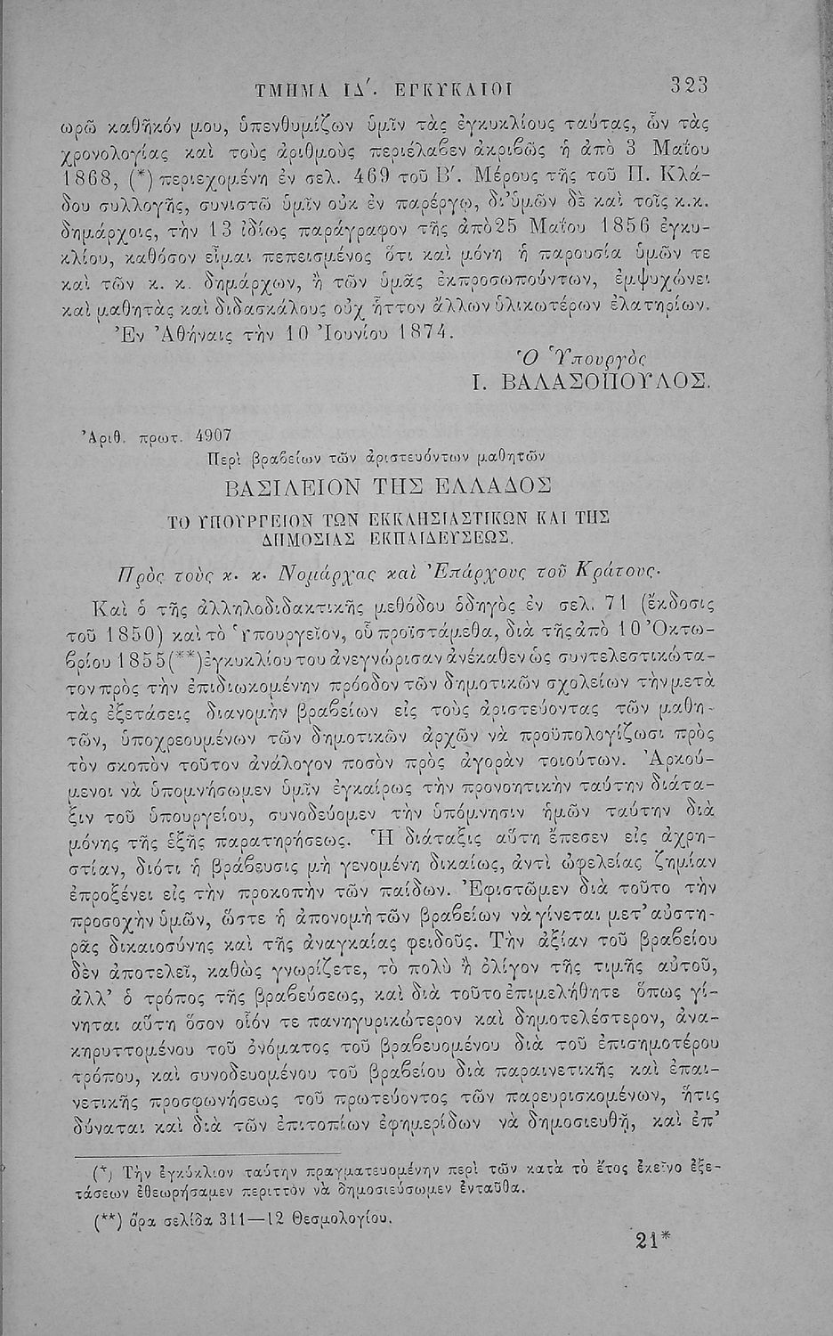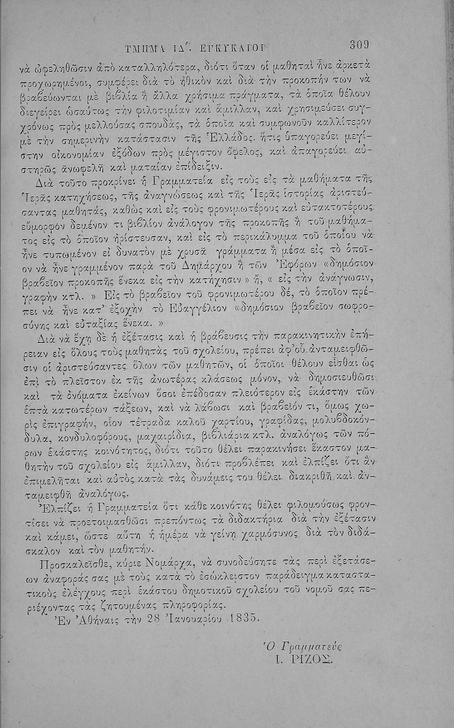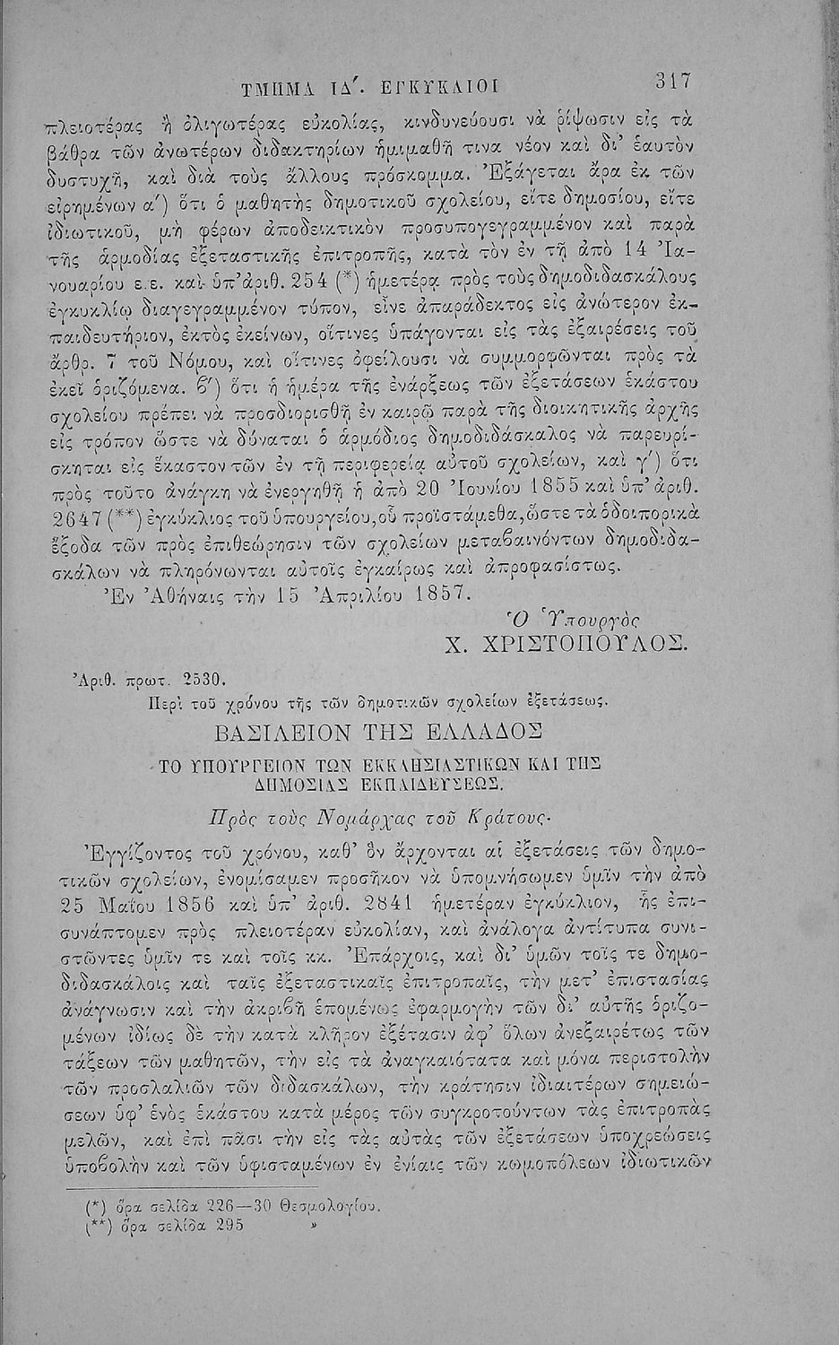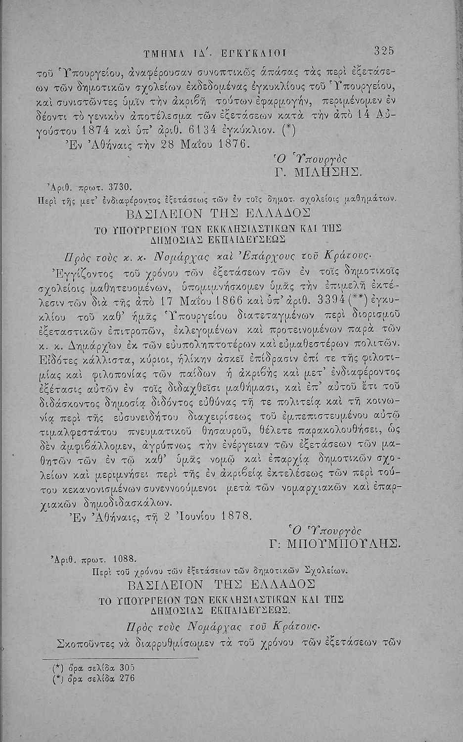 Έκδοση που περιλαμβάνει νόμους, βασιλικά διατάγματα και τις κυριότερες εγκυκλίους της περιόδου 1833-1883 που αφορούν τη Δημοτική Εκπαίδευση και τα Διδασκαλεία καθώς και τα καταστατικά του Διδασκαλικού Μετοχικού Ταμείου και του μετοχικού Ταμείου των πολιτικών Υπαλλήλων. Ο συγγραφέας ήταν Γραμματέας Α’ τάξης του Υπουργείου στο τμήμα Δημοτικής Εκπαίδευσης.