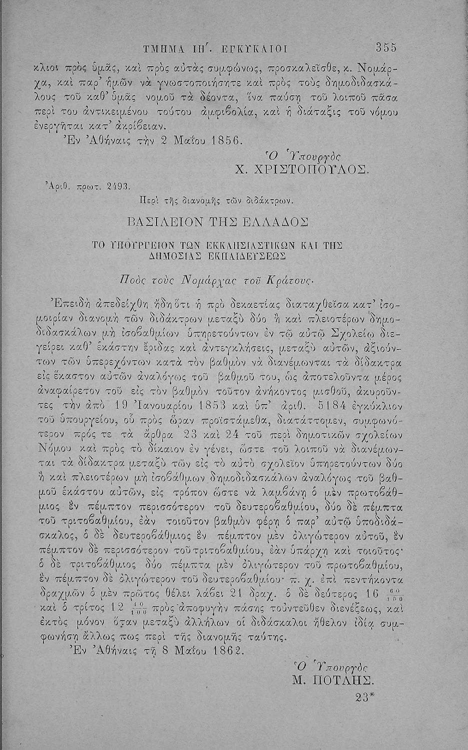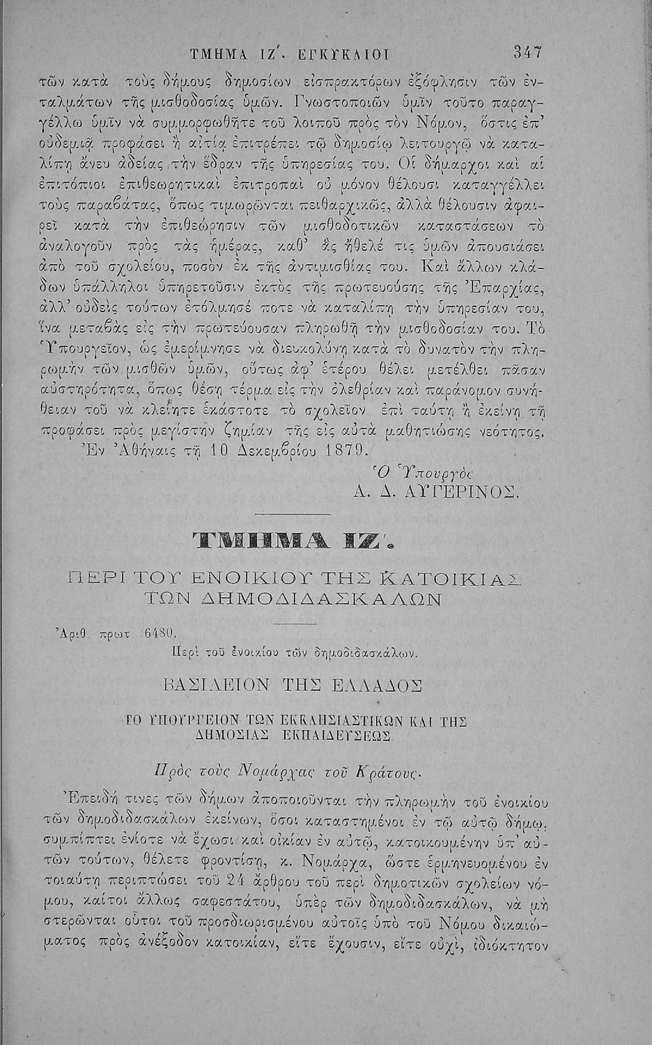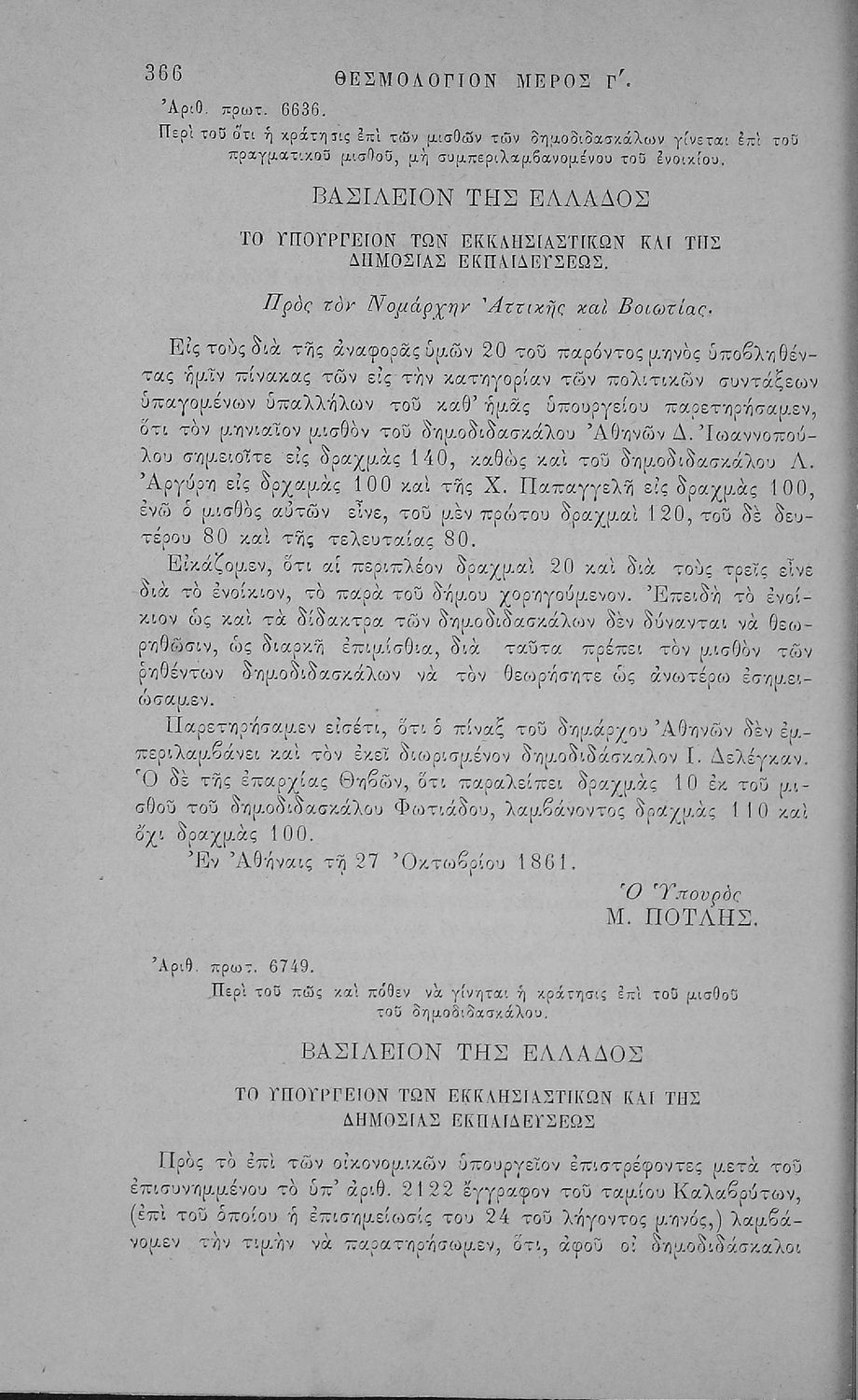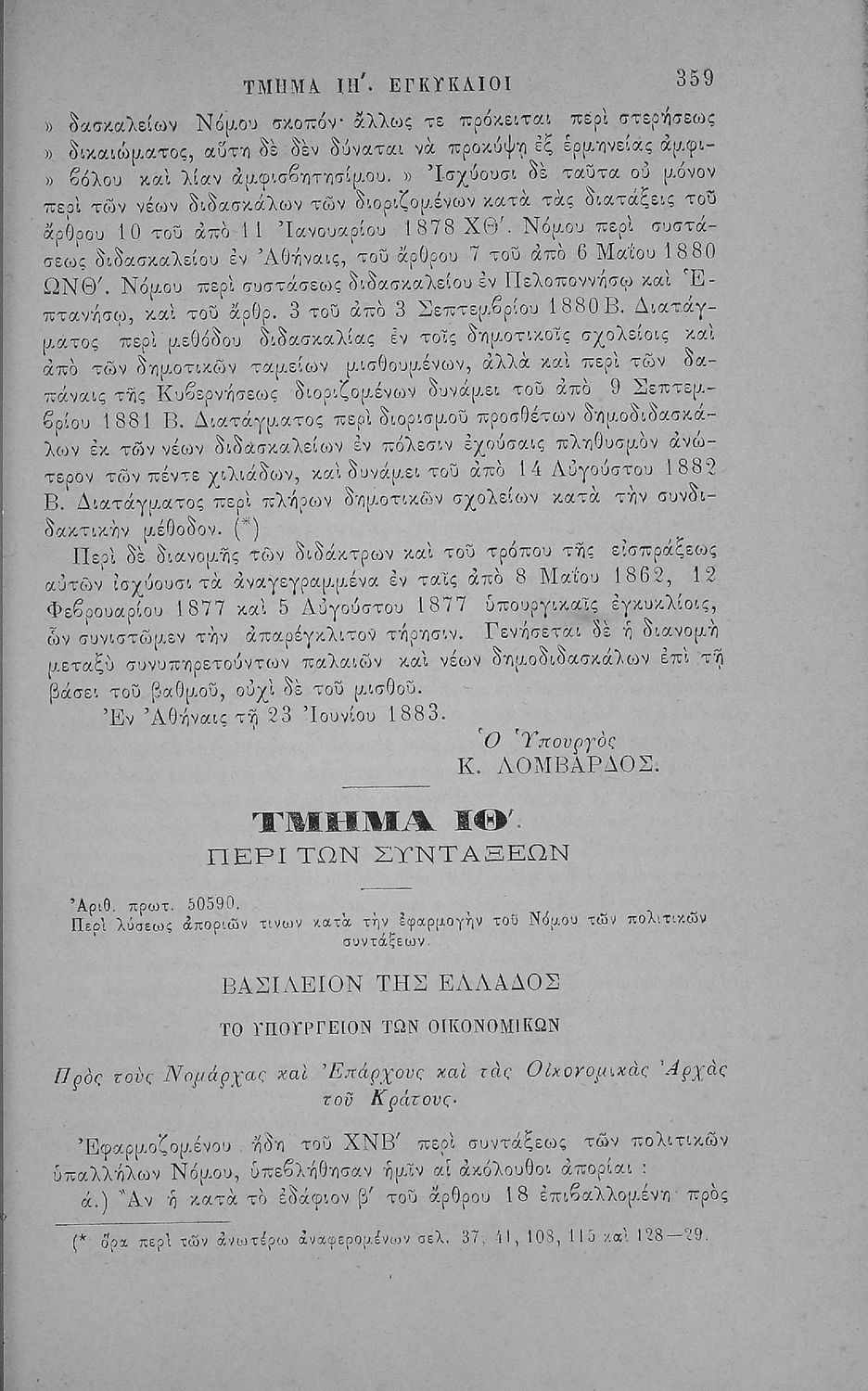 Έκδοση που περιλαμβάνει νόμους, βασιλικά διατάγματα και τις κυριότερες εγκυκλίους της περιόδου 1833-1883 που αφορούν τη Δημοτική Εκπαίδευση και τα Διδασκαλεία καθώς και τα καταστατικά του Διδασκαλικού Μετοχικού Ταμείου και του μετοχικού Ταμείου των πολιτικών Υπαλλήλων. Ο συγγραφέας ήταν Γραμματέας Α’ τάξης του Υπουργείου στο τμήμα Δημοτικής Εκπαίδευσης.