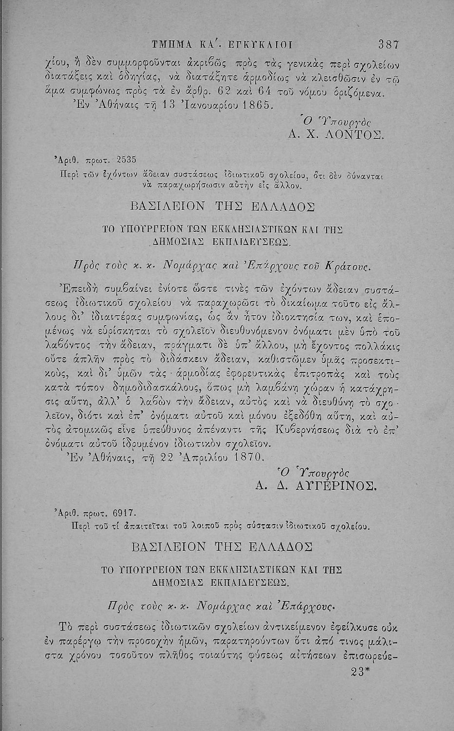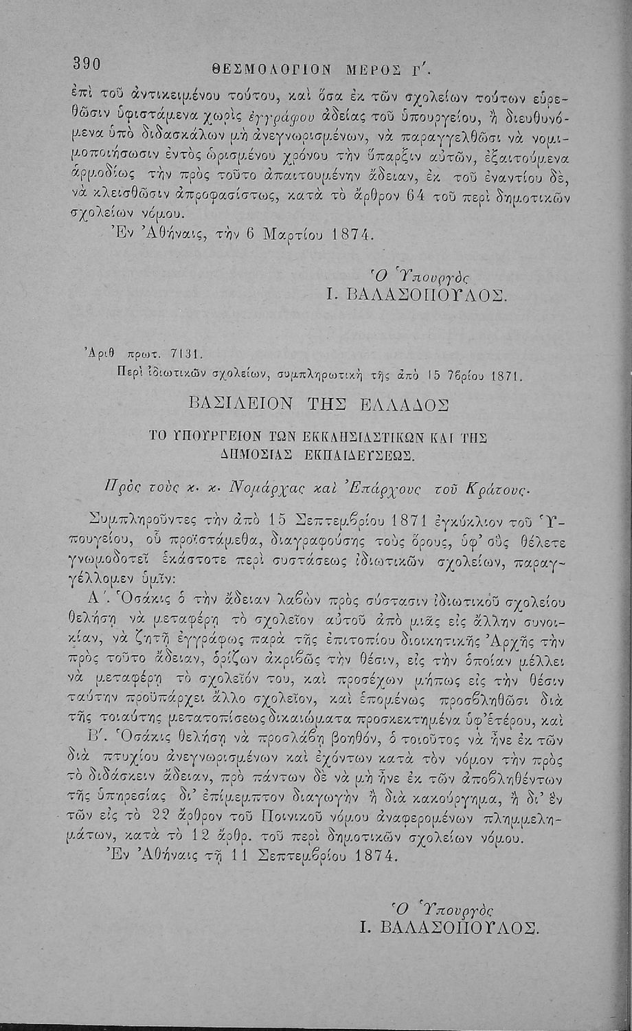 Έκδοση που περιλαμβάνει νόμους, βασιλικά διατάγματα και τις κυριότερες εγκυκλίους της περιόδου 1833-1883 που αφορούν τη Δημοτική Εκπαίδευση και τα Διδασκαλεία καθώς και τα καταστατικά του Διδασκαλικού Μετοχικού Ταμείου και του μετοχικού Ταμείου των πολιτικών Υπαλλήλων. Ο συγγραφέας ήταν Γραμματέας Α’ τάξης του Υπουργείου στο τμήμα Δημοτικής Εκπαίδευσης.