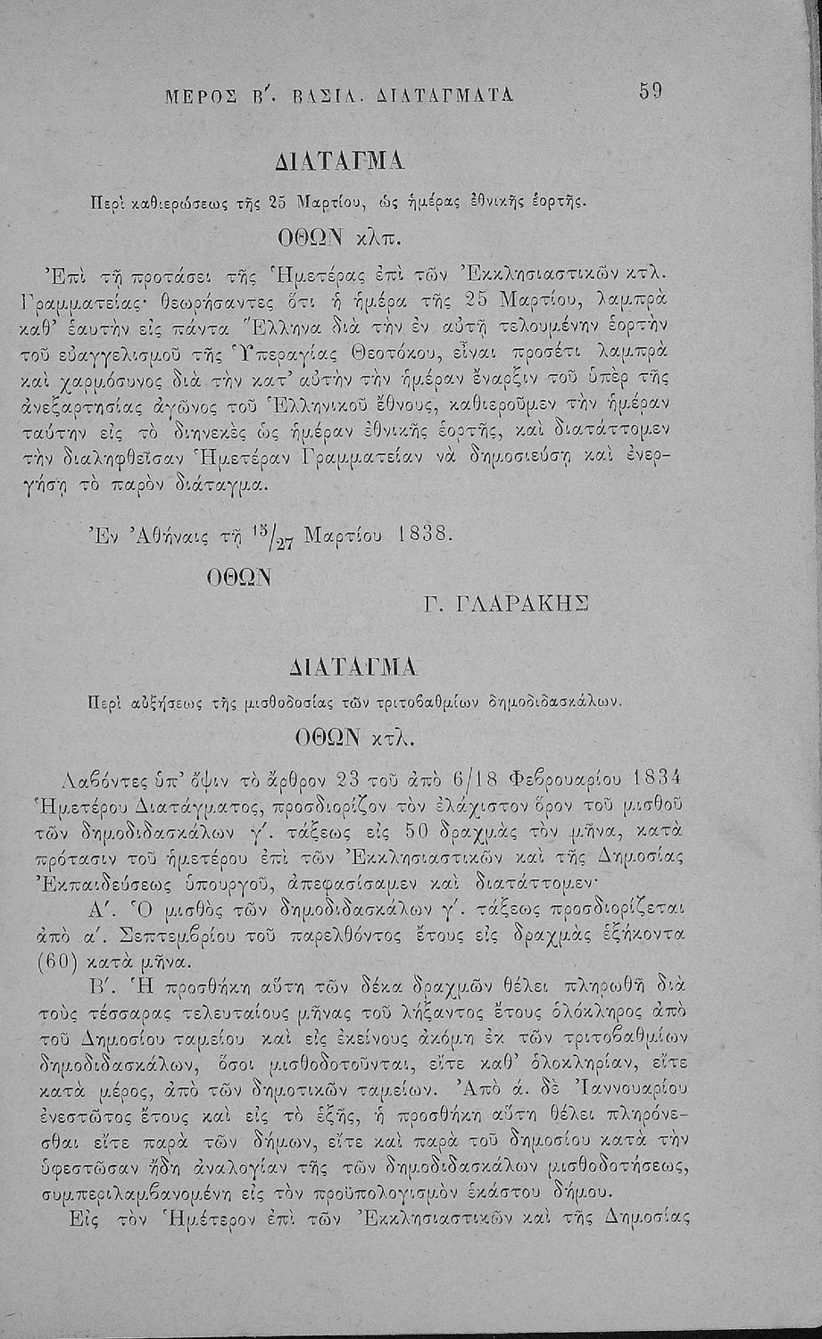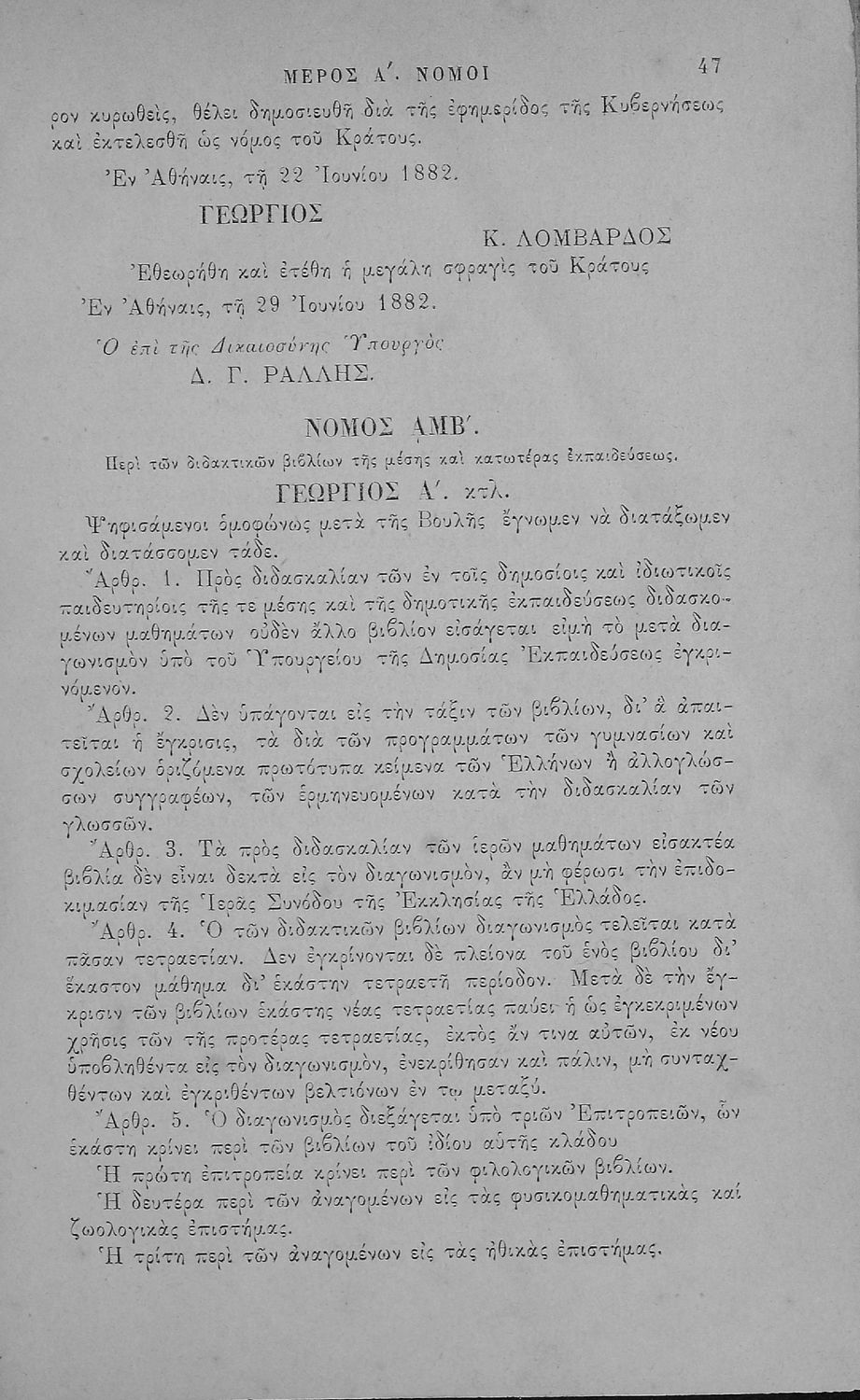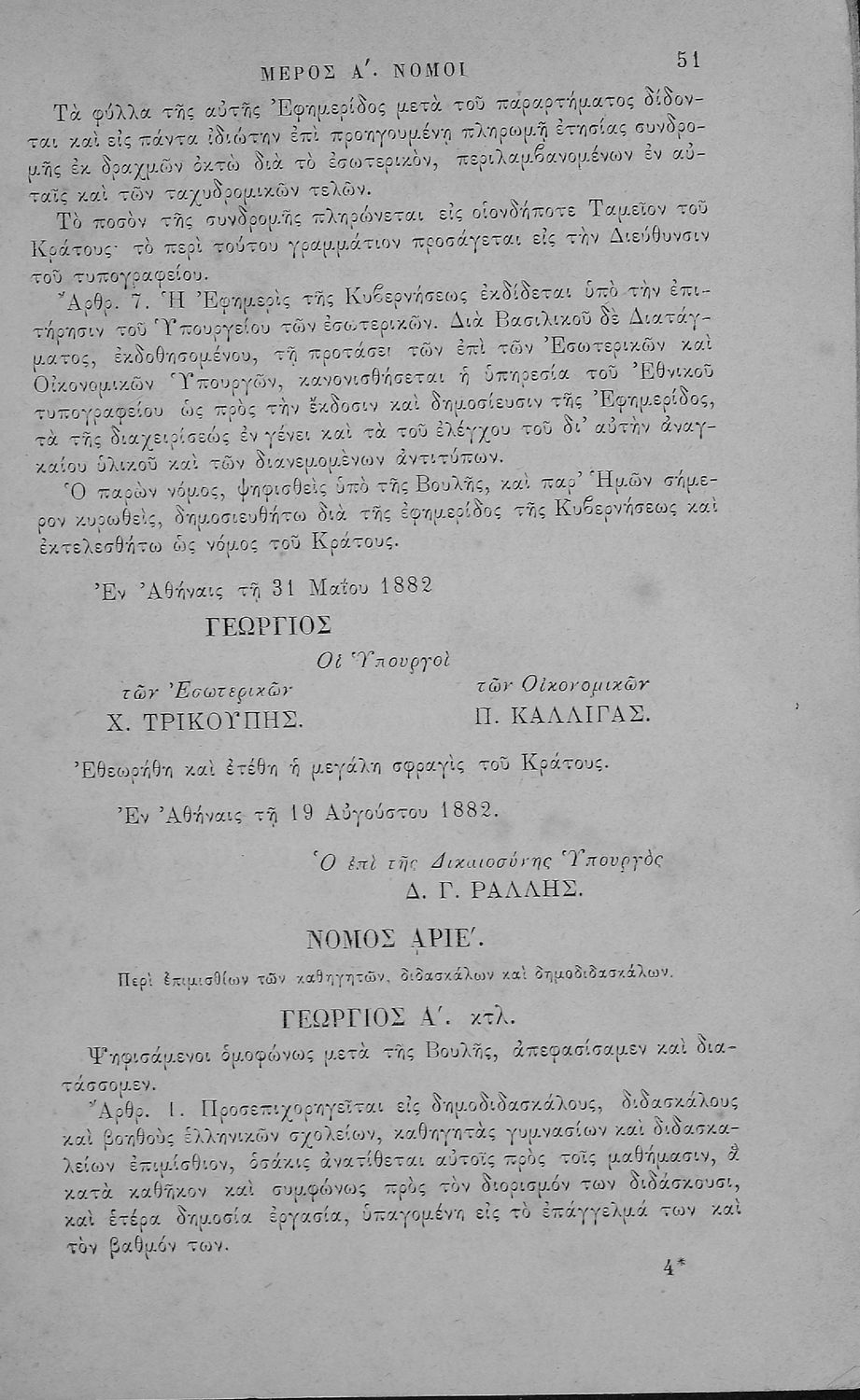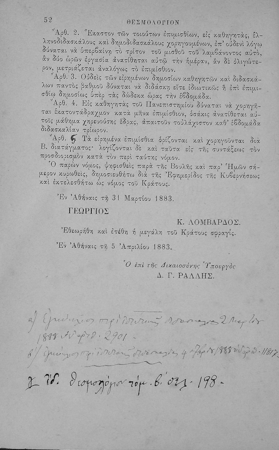 Έκδοση που περιλαμβάνει νόμους, βασιλικά διατάγματα και τις κυριότερες εγκυκλίους της περιόδου 1833-1883 που αφορούν τη Δημοτική Εκπαίδευση και τα Διδασκαλεία καθώς και τα καταστατικά του Διδασκαλικού Μετοχικού Ταμείου και του μετοχικού Ταμείου των πολιτικών Υπαλλήλων. Ο συγγραφέας ήταν Γραμματέας Α’ τάξης του Υπουργείου στο τμήμα Δημοτικής Εκπαίδευσης.