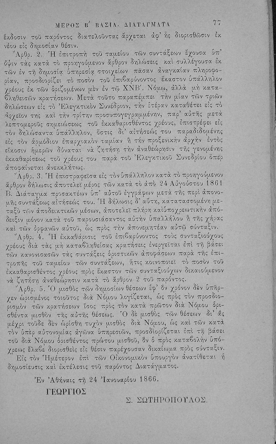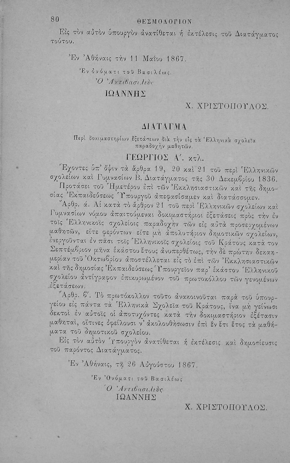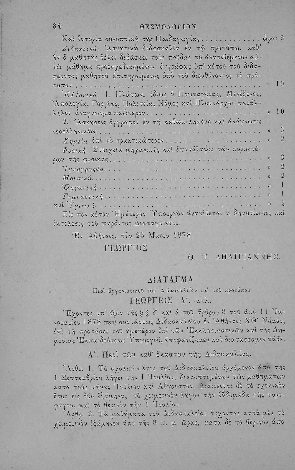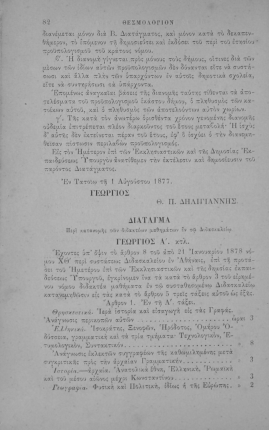 Έκδοση που περιλαμβάνει νόμους, βασιλικά διατάγματα και τις κυριότερες εγκυκλίους της περιόδου 1833-1883 που αφορούν τη Δημοτική Εκπαίδευση και τα Διδασκαλεία καθώς και τα καταστατικά του Διδασκαλικού Μετοχικού Ταμείου και του μετοχικού Ταμείου των πολιτικών Υπαλλήλων. Ο συγγραφέας ήταν Γραμματέας Α’ τάξης του Υπουργείου στο τμήμα Δημοτικής Εκπαίδευσης.