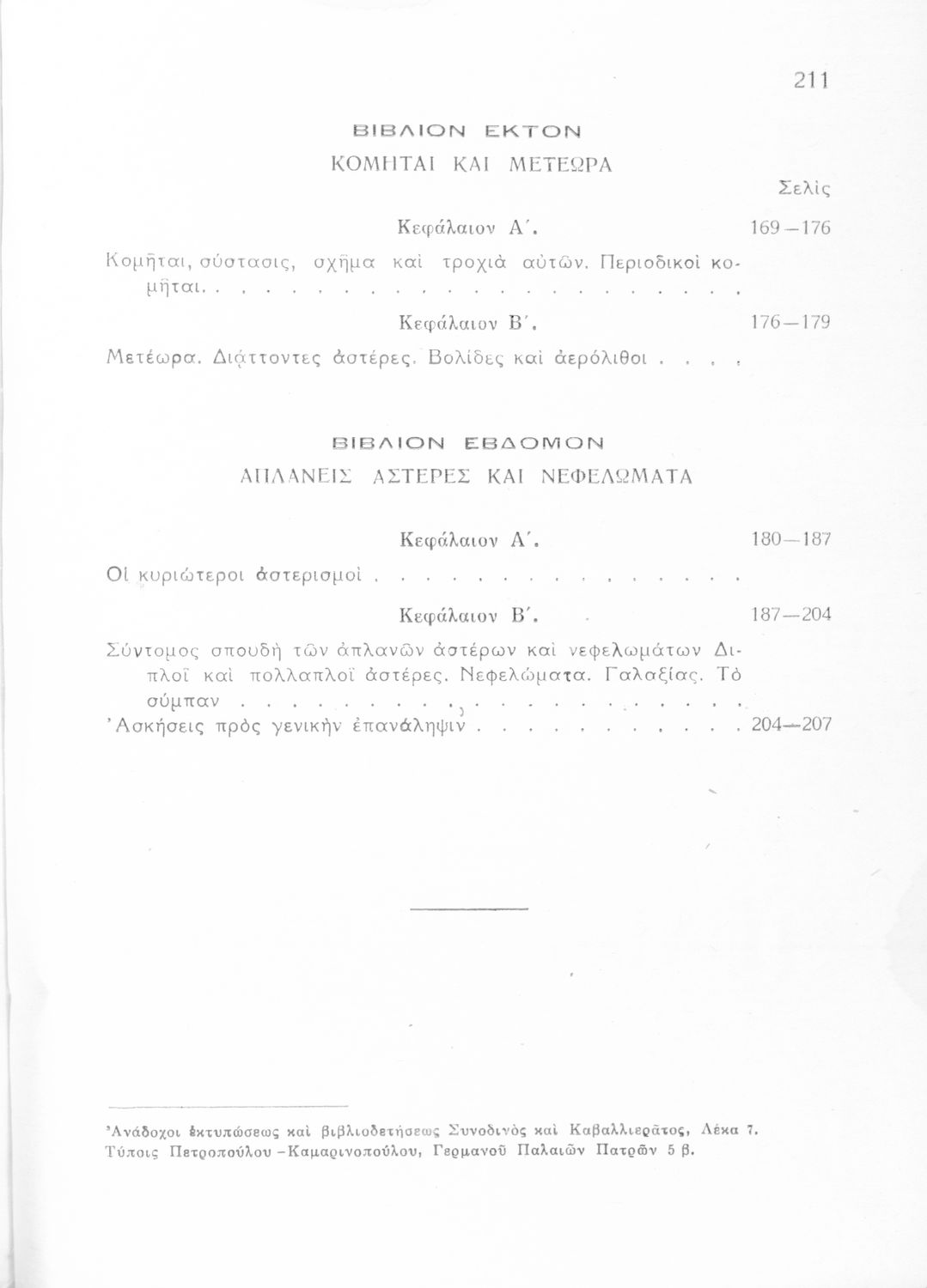Κωδικός αναγνώρισης: 01-18974 Τίτλος: Κοσμογραφία δια την ΣΤ΄ τάξιν Γυμνασίων παλαιού τύπου Συγγραφέας: Νικόλαος Δ. Νικολάου Μέγεθος και υπόστρωμα: Σχολικό εγχειρίδιο, 20εκ., μαλακό εξώφυλλο, 211 σελίδες. Σκίτσα και φωτογραφίες (ασπρόμαυρα). |