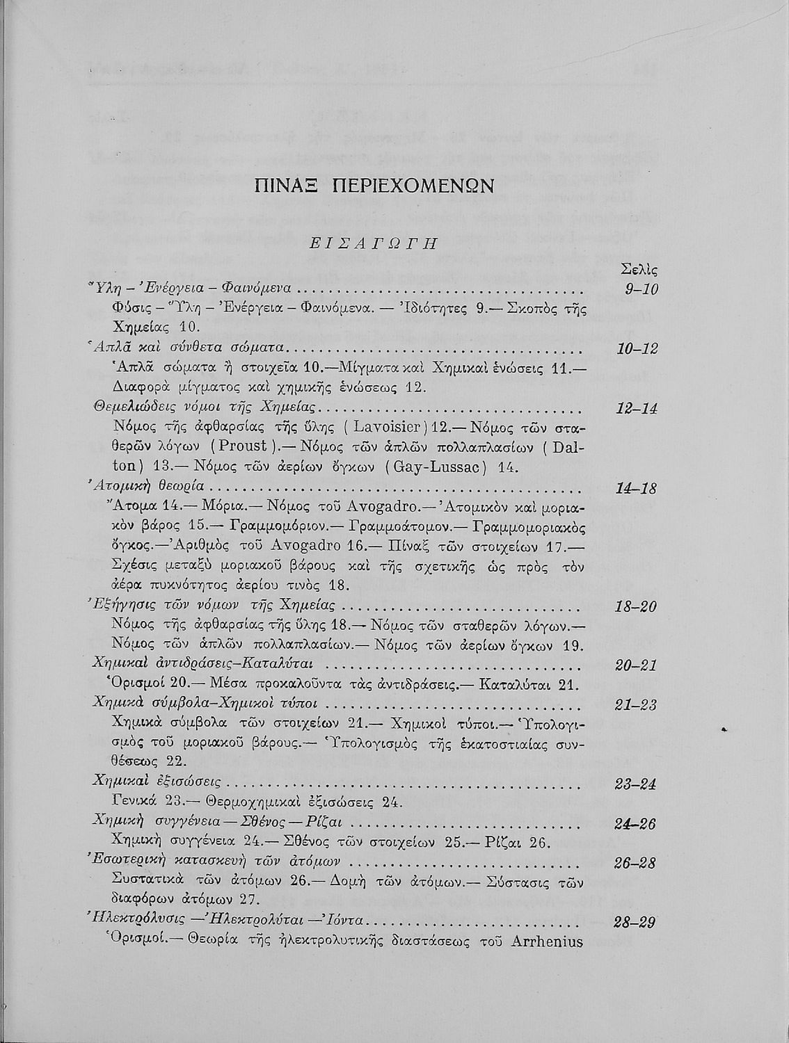 Σχολικό εγχειρίδιο Χημείας για τους μαθητές της Ε' Γυμνασίου. Χωρίζεται σε τρία μέρη. Στο πρώτο μέρος είναι μια γενική εισαγωγή στους θεμελιώδεις νόμους της Χημείας, τις χημικές αντιδράσεις, τα χημικά σύμβολα.
