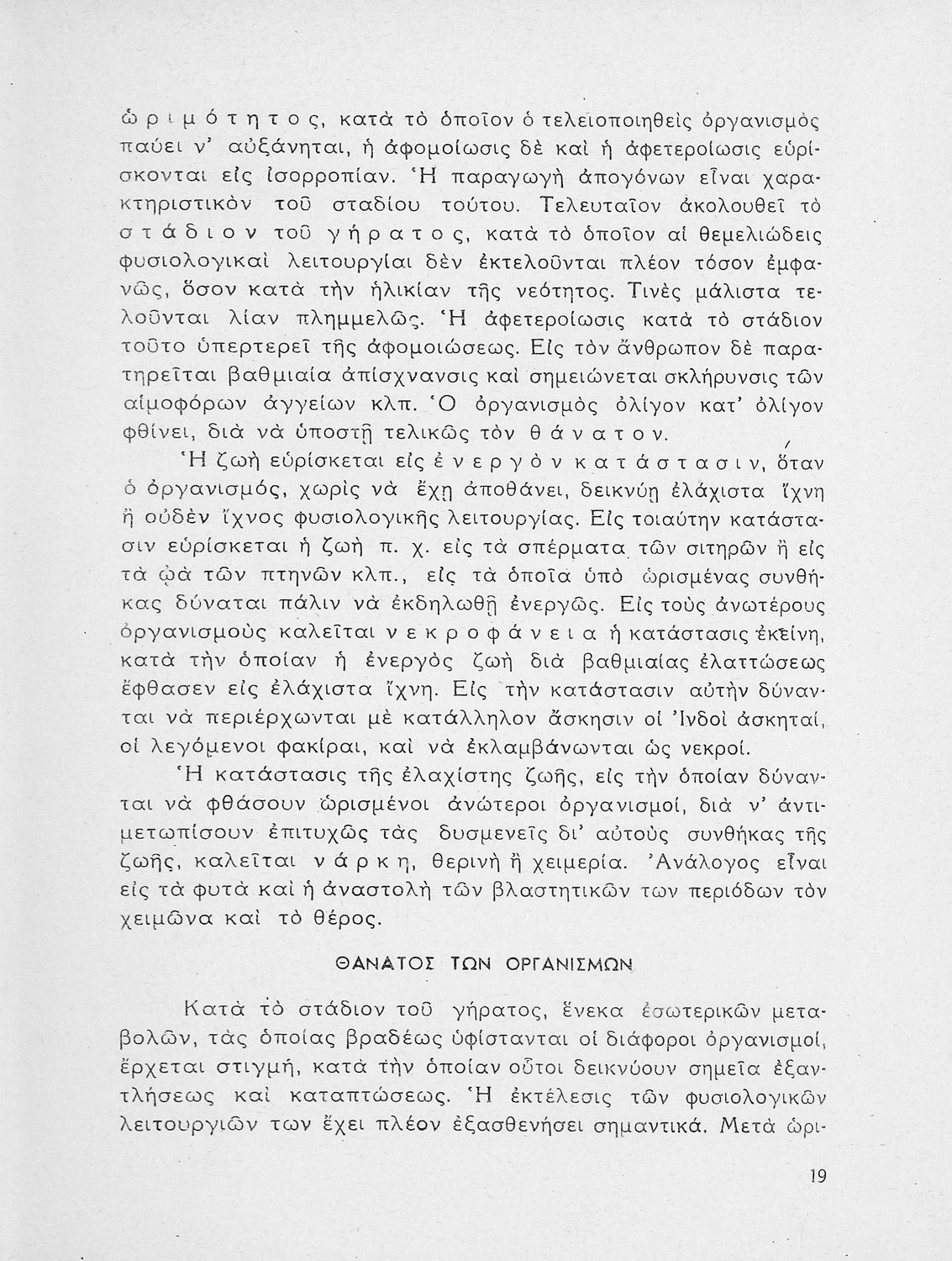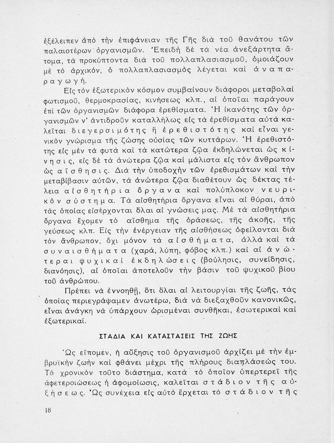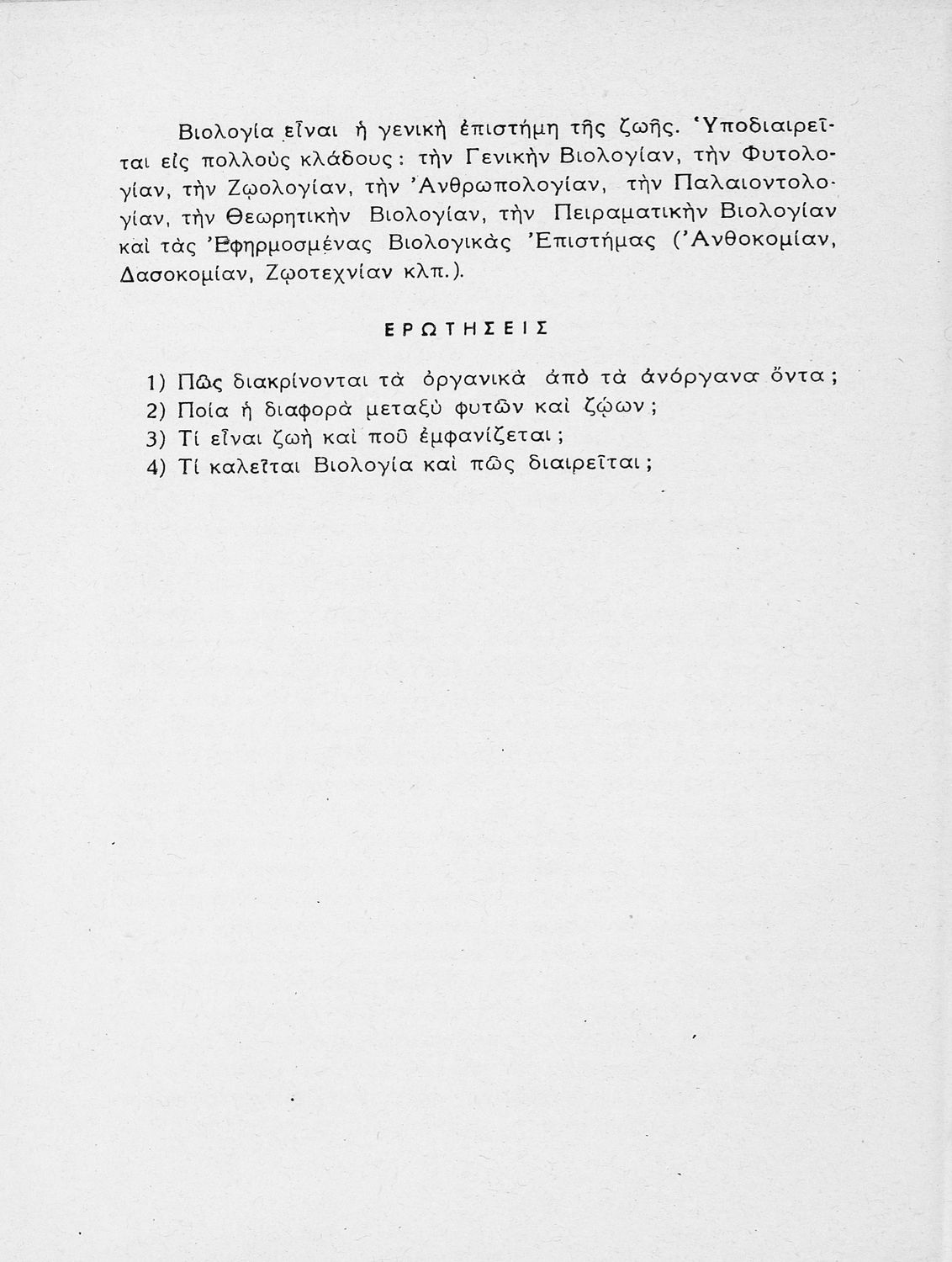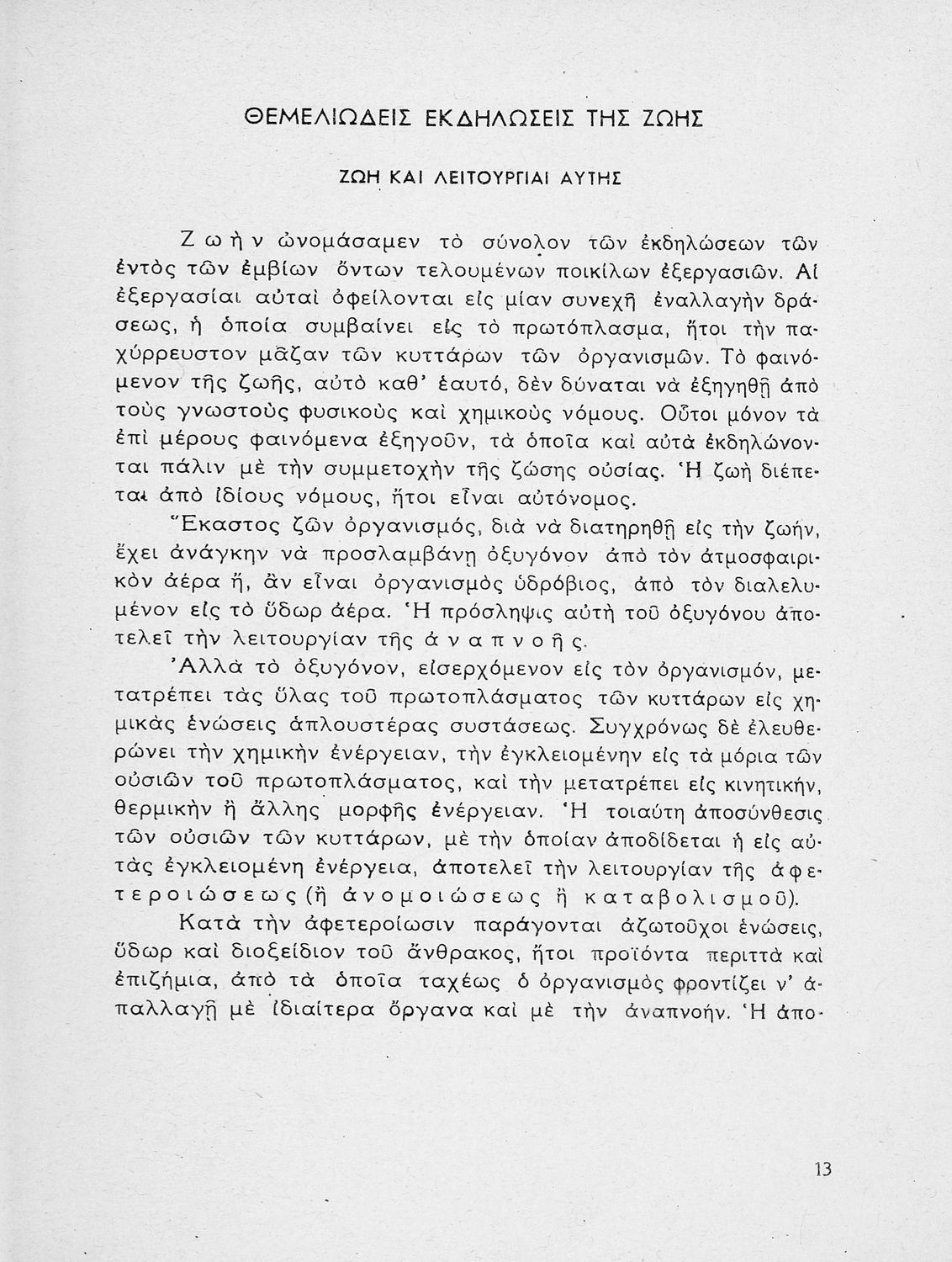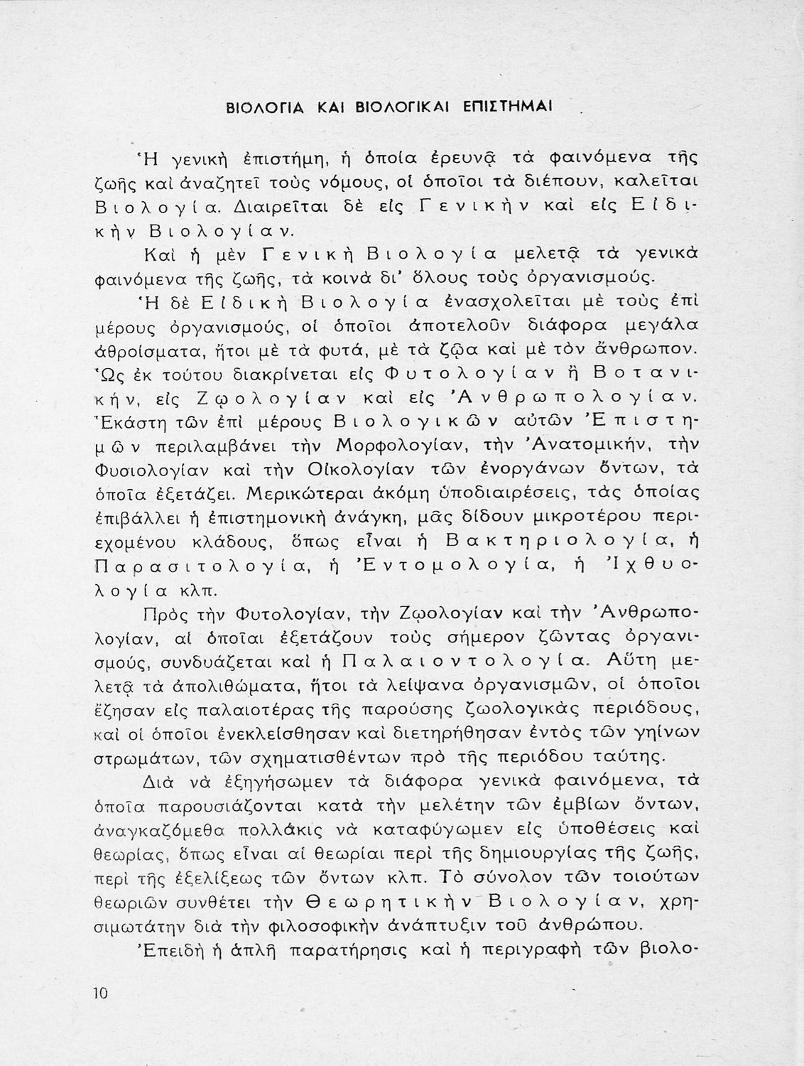 Σχολικό εγχειρίδιο Βιολογίας Δ΄ Γυμνασίου που εστιάζει στις συνθήκες γέννησης, μεταβολής και θανάτου των έμβιων οργανισμών. Ο συγγραφέας ήταν καθηγητής της γενικής Βιολογίας στο Πανεπιστήμιο Αθηνών.