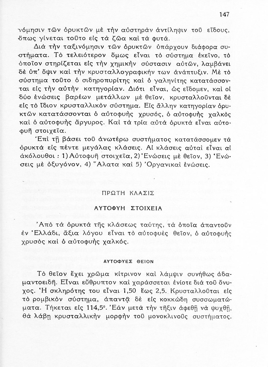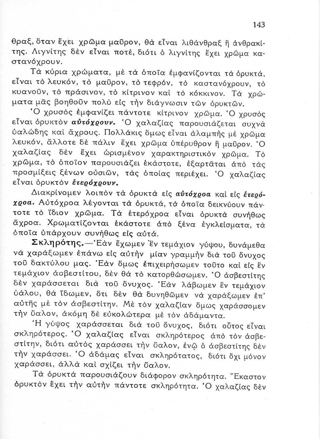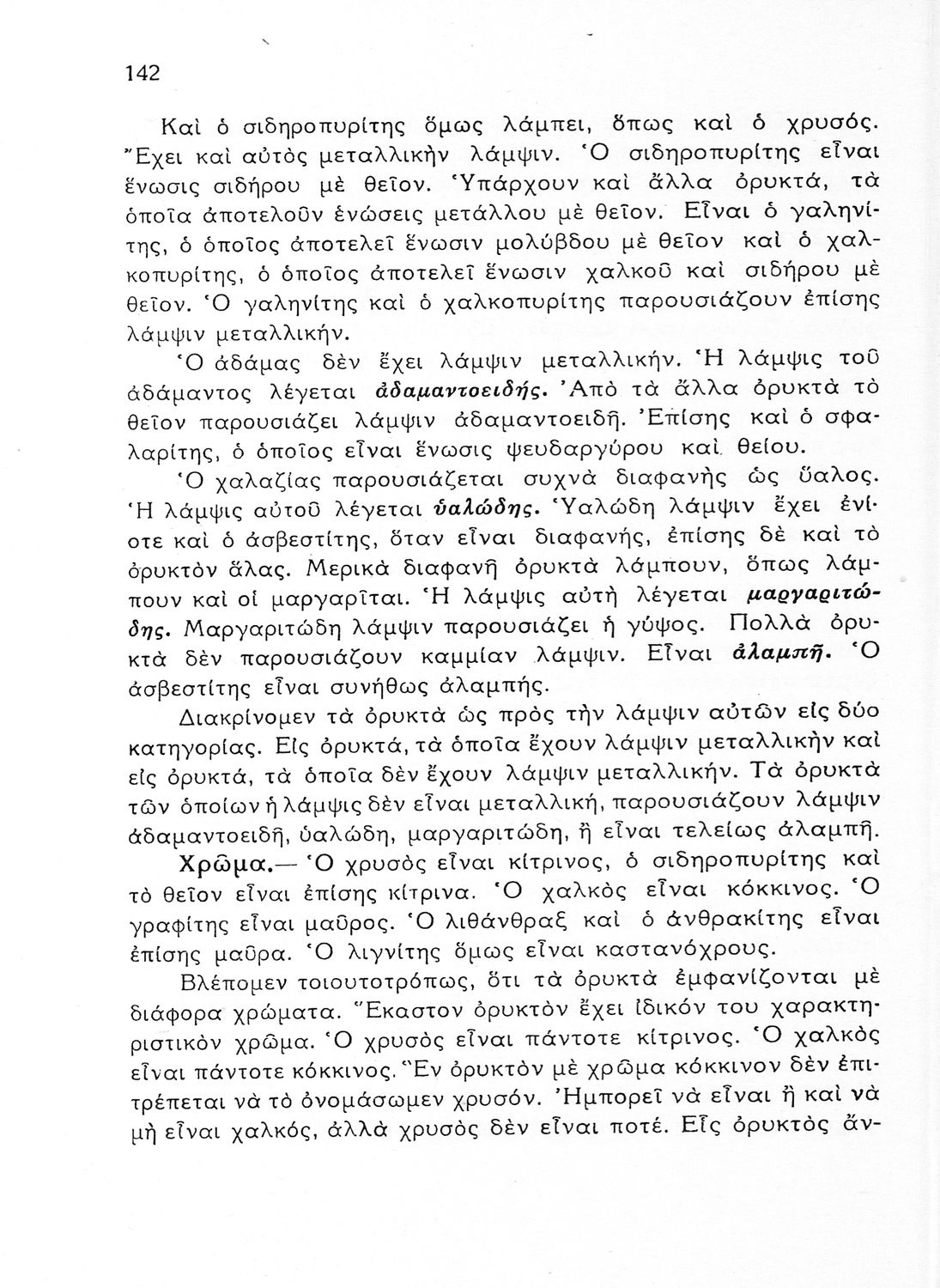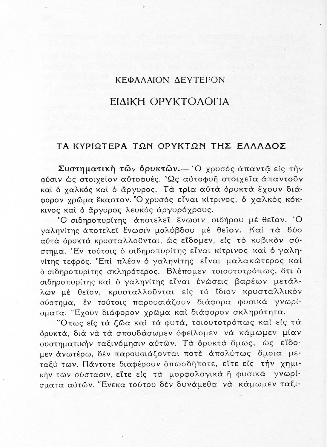 Σχολικό εγχειρίδιο Γεωλογίας/Ορυκτολογίας για την Δ΄ τάξη των Εξαταξίων Γυμνασίων που παρουσιάζει τα ορυκτά με βάση την κλάση στην οποία ανήκουν. Το τμήμα της γεωλογίας εστιάζει στους γεωλογικούς αιώνες. Ο συγγραφέας ήταν υφηγητής της γεωλογίας στο Πανεπιστήμιο Αθηνών.