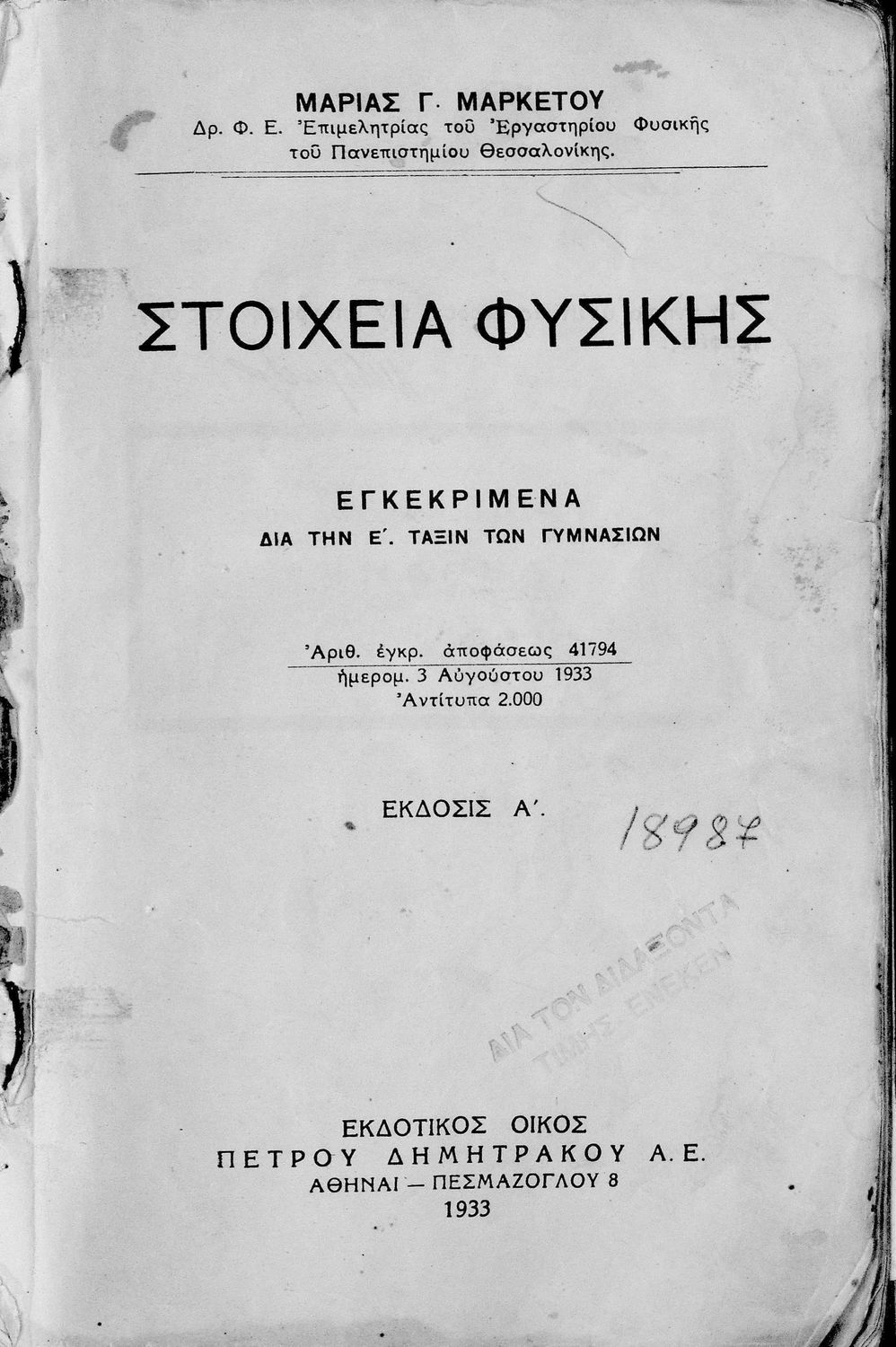 Τίτλος: Στοιχεία φυσικής εγκεκριμένα δια την Ε΄ Τάξη των Γυμνασίων.