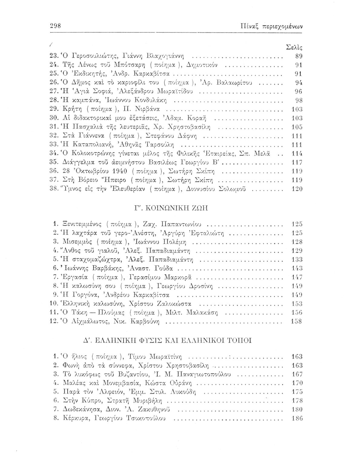 Σχολικό εγχειρίδιο Νέων Ελληνικών Δ΄ Γυμνασίου Θηλέων που περιλαμβάνει πεζά, ποιήματα και δημοτικά τραγούδια εμπνευσμένα από την σύγχρονη ελληνική ιστορία και την οικογενειακή και θρησκευτική ζωή. Περιέχει και